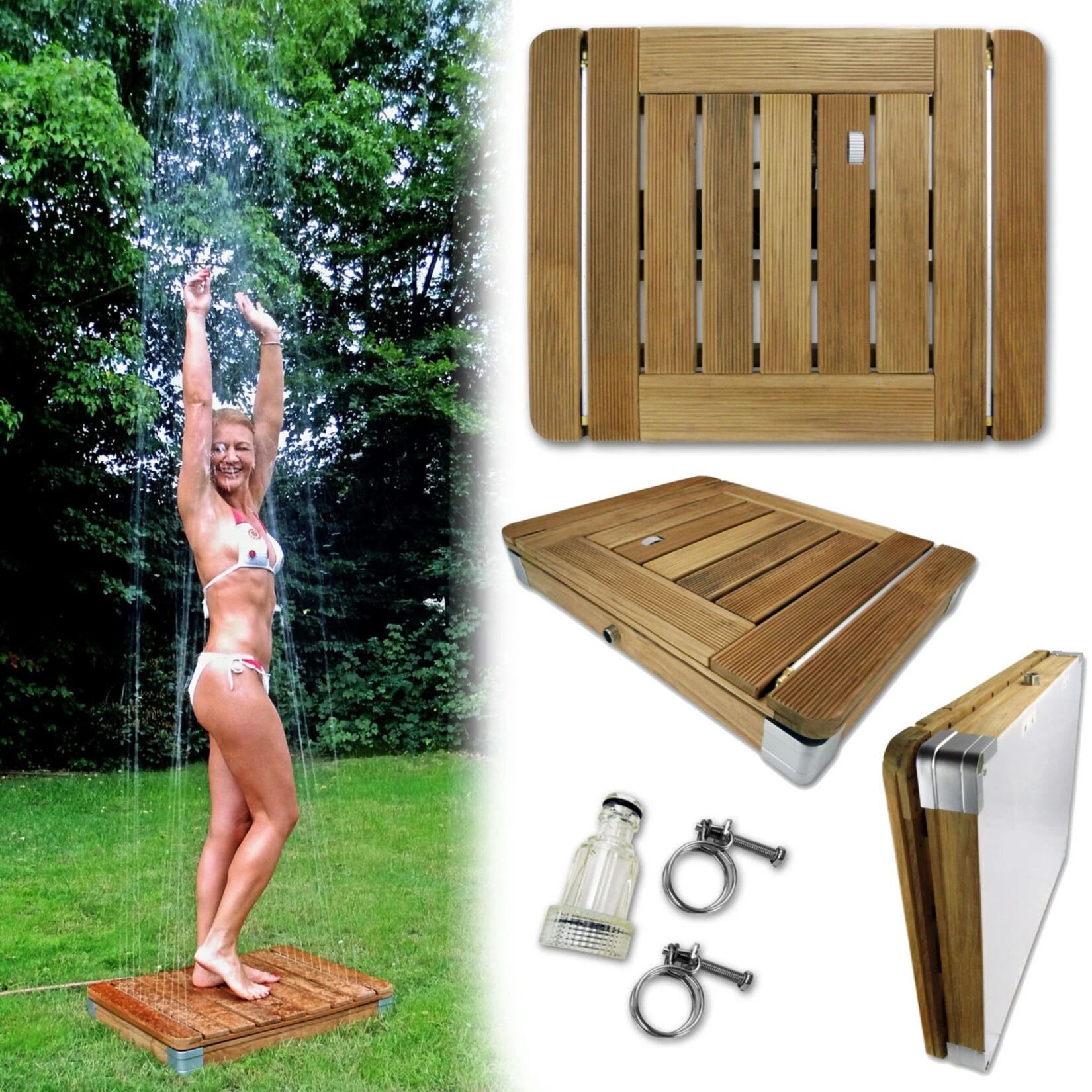 Wenn Sie nur wenig Platz in Ihrem Garten haben aber trotzdem nicht auf eine wohltuhende Abkühklung im Sommer verzichten möchten, dann ist diese Dusche die optimale Lösung für Sie. Aufgrund der innovativen Funktionsweise und der geringen Größe von nur 70 x 55 x 10 cm, ist die wasserbeständige Bodenplatte aus Teak Hartholz nicht nur schnell aufgestellt und sofort betriebsbereit, sie ist ebenso schnell und platzsparend wieder verstaut.
