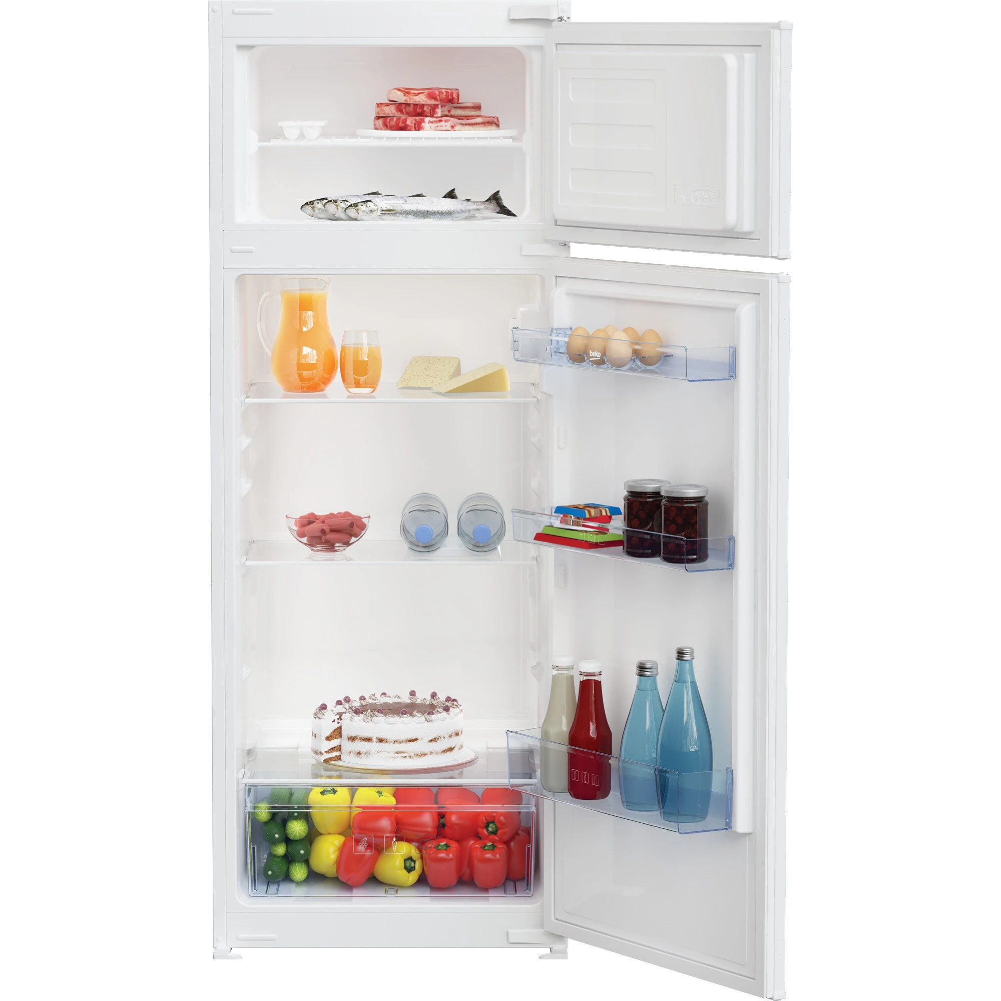 Die Einbau-Kühl-/Gefrierkombination BEKO BDSA180K3SN bietet mit einem Gesamtnutzinhalt von 174 Litern optimale Lagermöglichkeiten für Speisen und Getränke. Der 130 Liter umfassende Kühlbereich stellt dafür drei Glasabstellflächen, davon zwei höhenverstellbar, eine Obst-/Gemüseschublade sowie drei Türfächer zur Verfügung. Der obenliegende 44 Liter Gefrierbereich der BDSA180K3SN wird von einem Ablagerost unterteilt und muss dank MinFrost seltener abgetaut werden. Mit einem Stromverbrauch von 235 kWh im Jahr ist die BDSA180K3SN in die Energieeffizienzklasse F eingestuft.