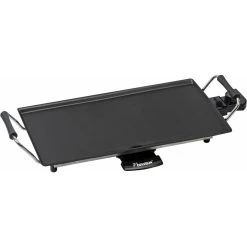 Die Bestron ABP602 Plancha Grillplatte ist eine hochwertige Backplatte mit Antihaftbeschichtung (Größe 47 x 26cm) und eignet sich ideal für z.B. Fleisch, Fisch, Gemüse und Kartoffeln. Der abnehmbare einstellbare Temperaturschalter besitzt eine Kontrollleuchte. Zum Betrieb ist kein Öl oder Fett notwendig, die Auffang-Rinne und -schale nimmt überschüssiges Fett oder Grillrückstände auf. Die ABP602 Plancha Grillplatte ist leicht zu reinigen und kann im Innenbereich und im Freien verwendet werden.