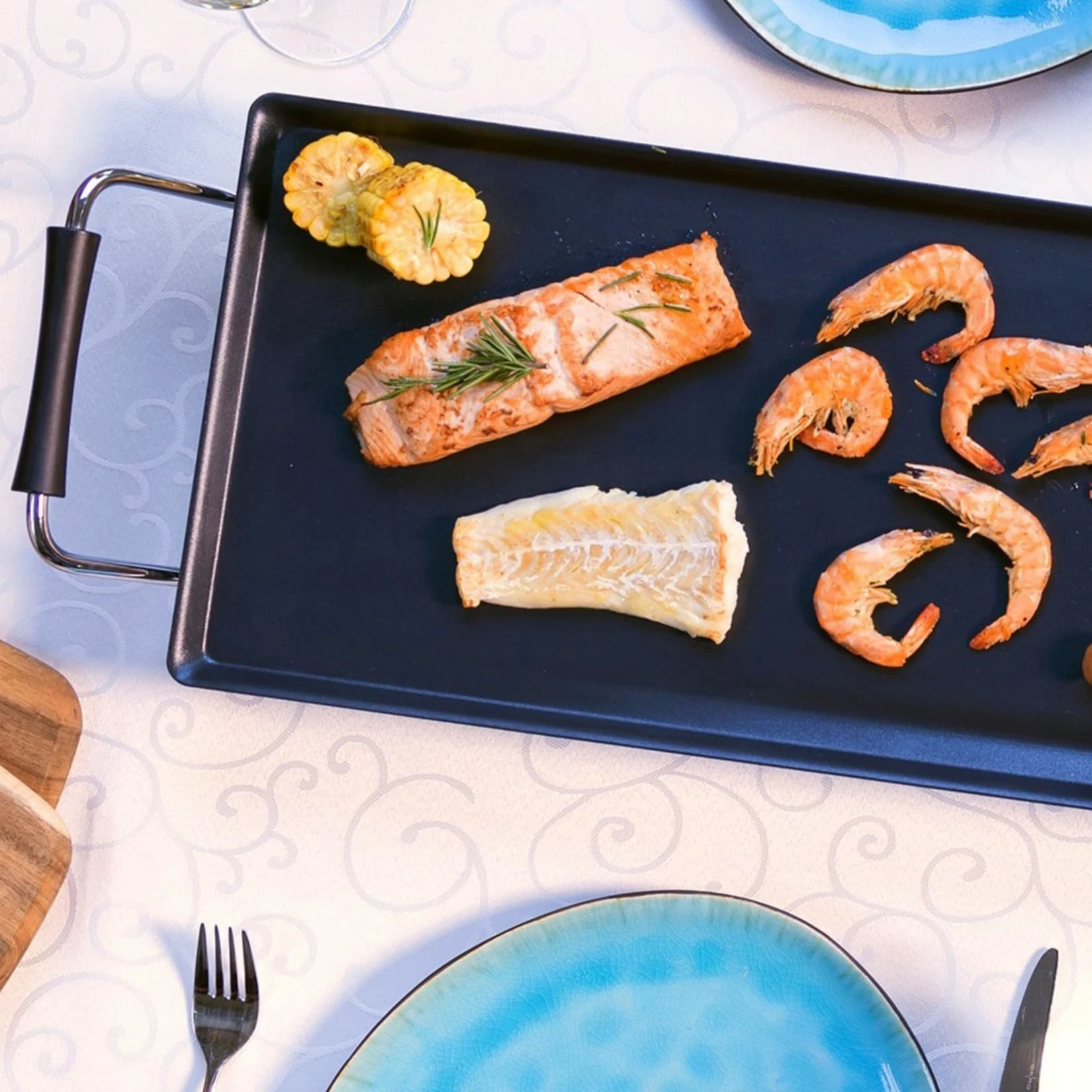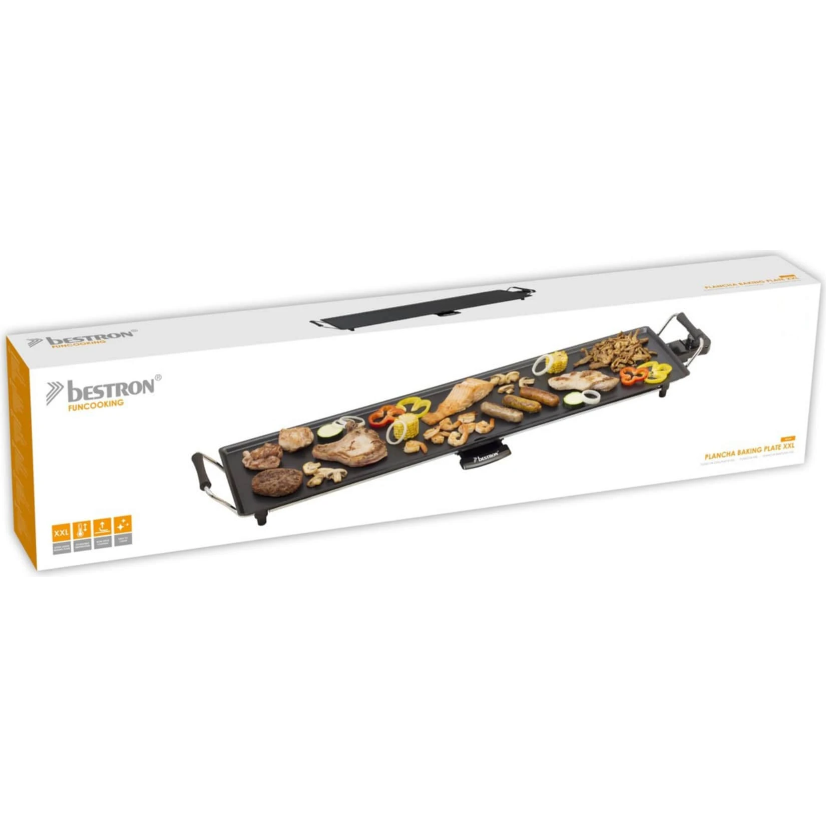 Die Bestron ABP604 Plancha Grillplatte XXL ist eine hochwertige Backplatte mit Antihaftbeschichtung (Größe 90,5 x 23,7cm) und eignet sich ideal für z.B. Fleisch, Fisch, Gemüse und Kartoffeln. Der abnehmbare einstellbare Temperaturschalter besitzt eine Kontrollleuchte. Zum Betrieb ist kein Öl oder Fett notwendig, die Auffang-Rinne und -schale nimmt überschüssiges Fett oder Grillrückstände auf. Die ABP604 Plancha Grillplatte XXL ist leicht zu reinigen und kann im Innenbereich und geschützt im Freien verwendet werden.