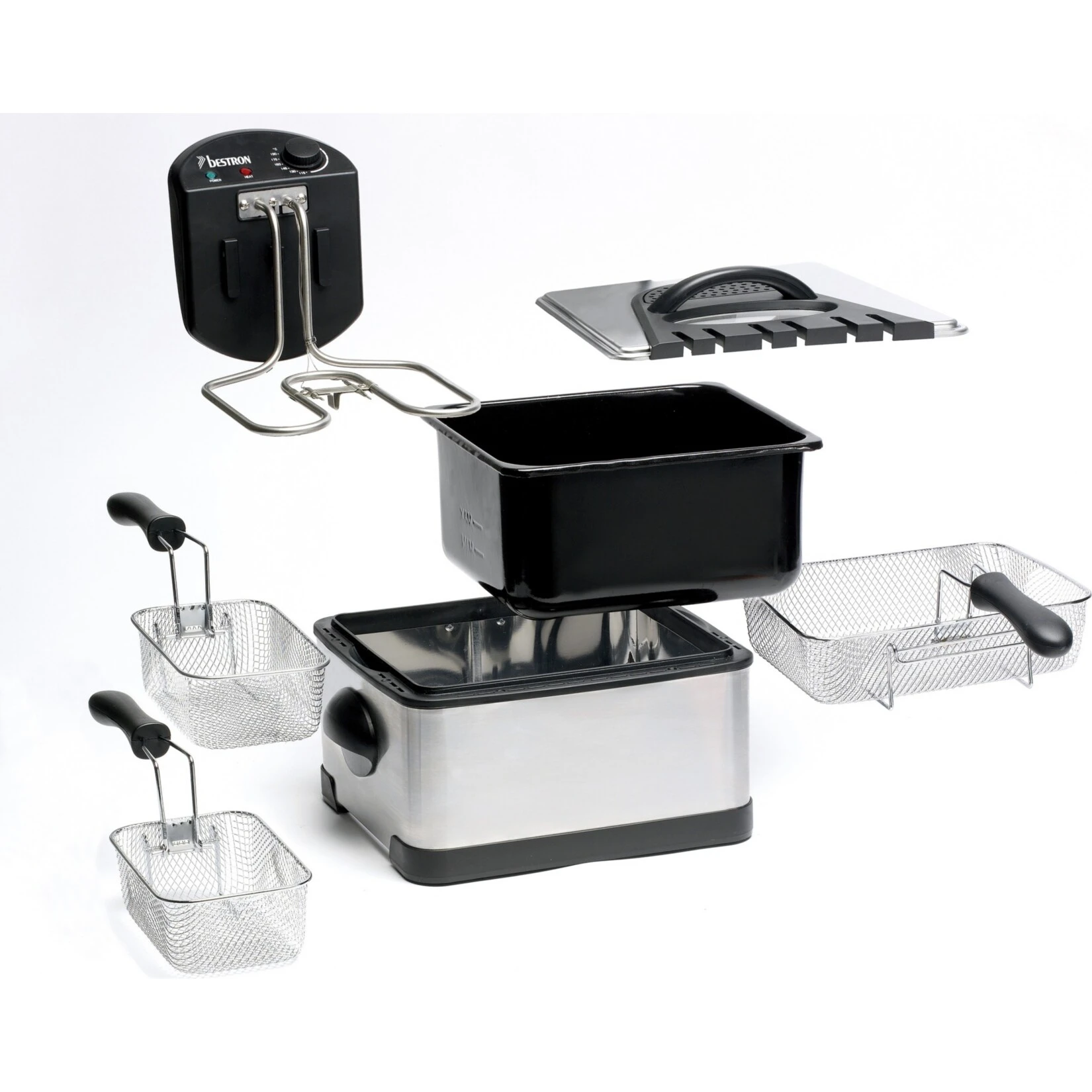 Die Family Fritteuse DF402B von Bestron erhitzt mit 2000 Watt im Handumdrehen das Frittierfett. Es gibt einen großen Frittierkorb und zwei kleine. Mit dem Großen können in einem Durchgang bis zu 1,5 kg Pommes oder bis zu 20 Frikadellen frittiert werden. Die kleinen Körbe fassen jeweils 750 g. Die Betriebstemperatur lässt sich stufenlos bis 190 Grad regeln. Im Deckel der Family Fritteuse DF402B befindet sich ein auswechselbarer Fettfilter sowie ein Sichtfenster.