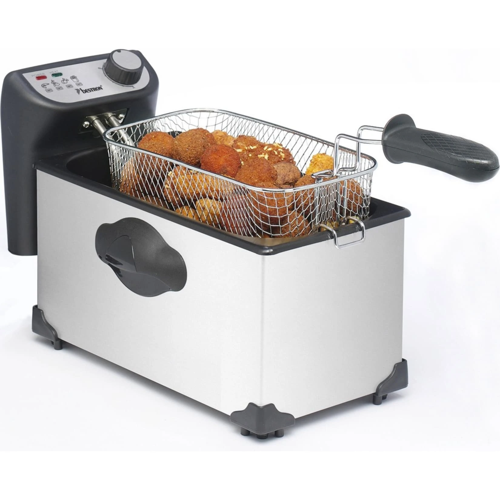 Die Bestron Fritteuse AF351 ist eine besonders praktische Fritteuse: Der Deckel ist herausnehmbar mit einem Sichtfenster. Die Temperatur des Frittierfettes lässt sich außen am über einen Drehregler einstellen. Die Fritteuse AF351 eignet sich bestens für Pommes Frites, Snacks, Fisch und vieles mehr. Sicheres Heben und Senken des Fritierkorbes ist durch den wärmeisolierten Griff möglich. Die Fritteuse AF351 ist leicht zu reinigen und ein austauschbarer Fettfilter sorgt für Hygiene des Gerätes.