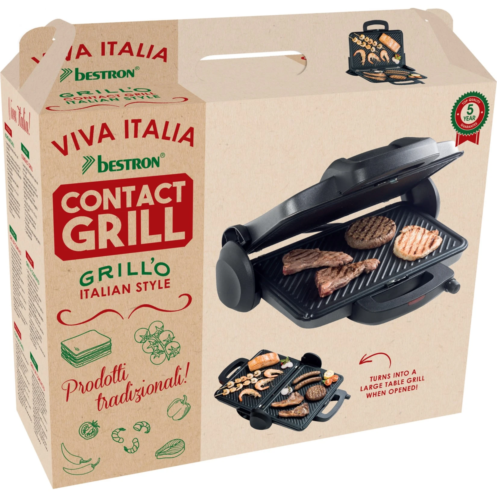 Der Kontaktgrill ACG380 von Bestron eignet sich dank Ober- und Unterhitze ideal zum Grillen und Backen von Fleisch, Fisch, Hamburgern, Sandwiches, Paninis und vielem mehr. Die obere Grillplatte passt sich in der Höhe jedem Garstück an. Die 31 x 22cm große Grillfläche ist mit einer Fettablaufrinne ausgestattet. Der Kontaktgrill ACG380 lässt sich auch aufgeklappt als großflächiger Tischgrill 31 x 44cm verwenden. Das Erreichen der eingestellten Temperatur wird mit einer Kontrollleuchte signalisiert. Die antihaftbeschichteten Grillplatten sind herausnehmbar, für eine einfache Reinigung.
