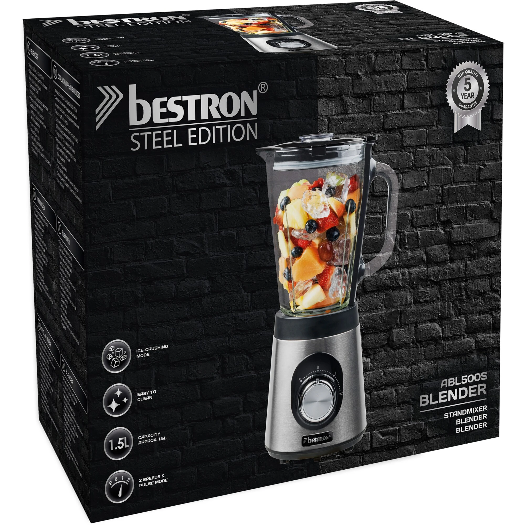 Der Standmixer ABL800STE aus der Steel Edition eignet sich ideal für die Zubereitung von Frucht- und Fitnessgetränken, Milchshakes, Cocktails, Suppen, Salsasaucen und Babynahrung. Auch das Zerkleinern von Eis ist dank der 500 Watt Leistung und dem robusten Glasmixer kein Problem. Der abnehmbare Mixbecher hat ein Fassungsvermögen von 1,5 Litern und ist spülmaschinengeeignet. Der Deckel verfügt über eine praktische Nachfüllöffnung und Sicherheits-Stopp-Funktion. Die Geschwindigkeit ist von 0 bis 2 einstellbar und hat auch eine Pulsfunktion. Das Gerät funktioniert nur, wenn der Mixbecher richtig positioniert ist und bietet durch die Gummifüße eine hervorragende Standfestigkeit.