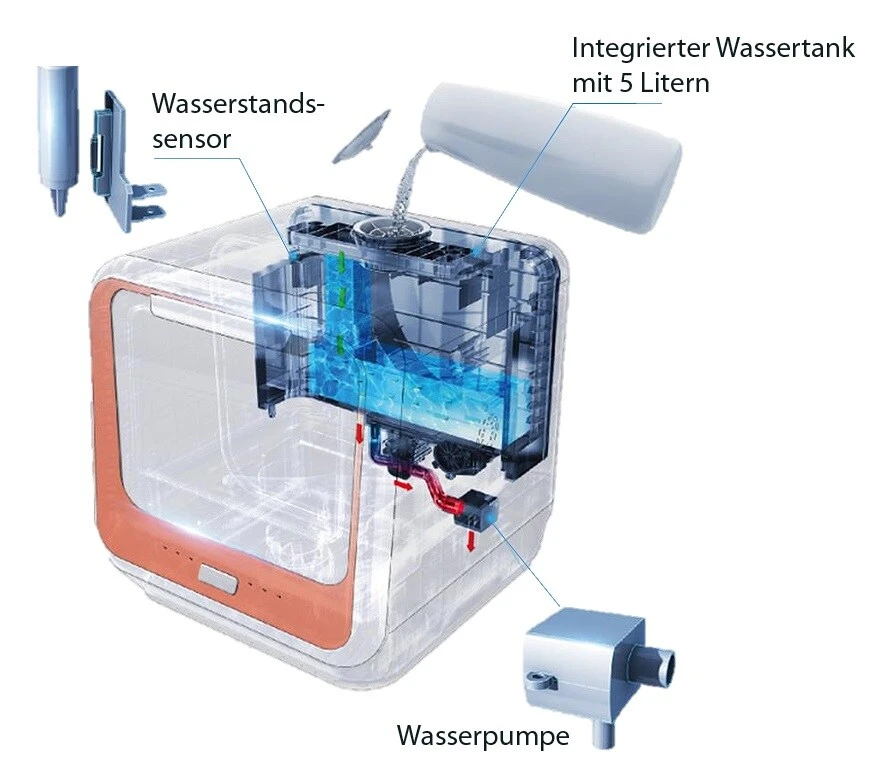 - 2in1 — Super praktisch: Dank integriertem 5 Liter Wassertank können Sie den Mini-Geschirrspüler auch ganz bequem überall ohne Wasseranschluss nutzen.