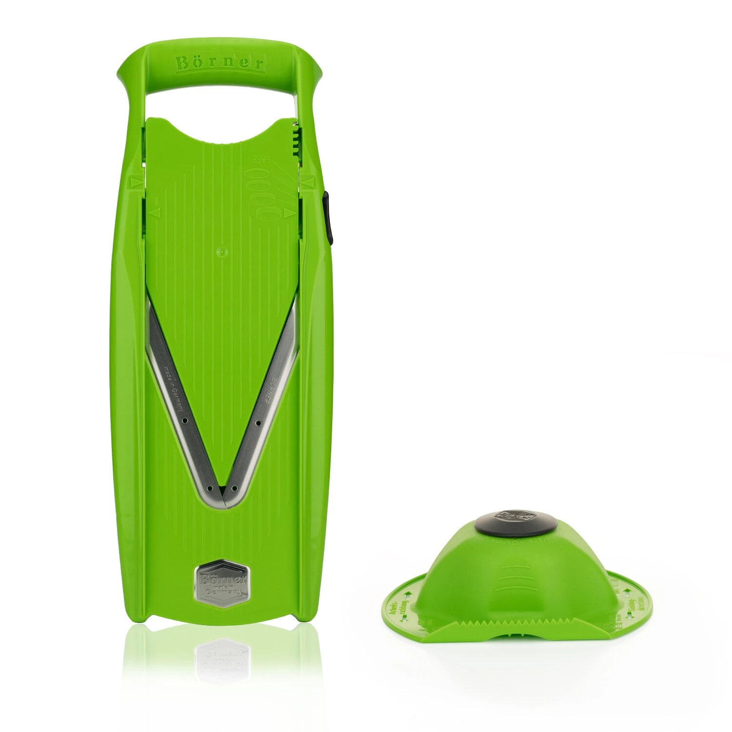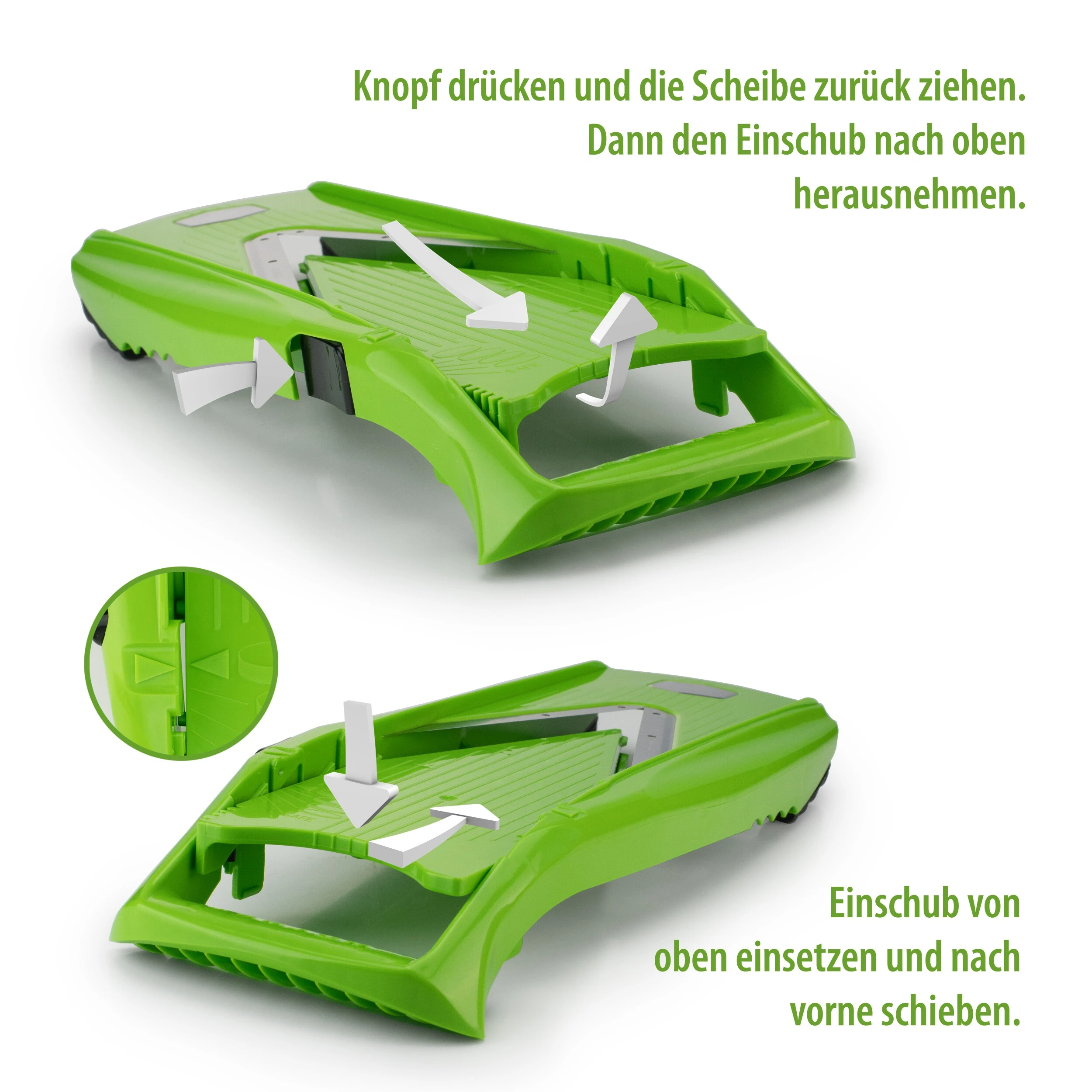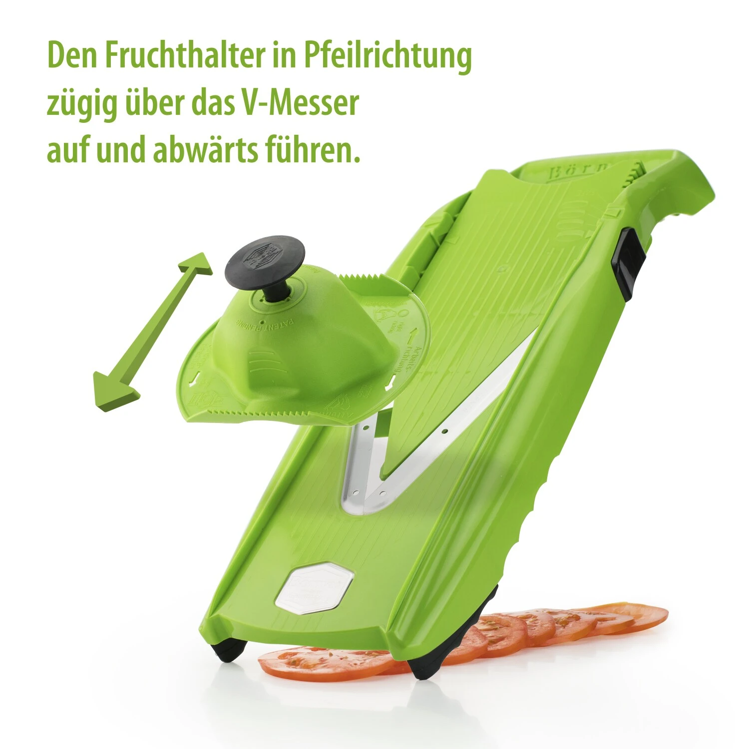 - Lieferumfang: Beigefuegt sind dem Basis Set ein verstellbarer Gemuesehobel, ein Sicherheitseinschub und Sicherheitsfruchthalter, der gleichzeitig auch als Zwiebelhalter agiert. Ihre Finger sind somit stets geschuetzt vor den Edelstahlklingen.