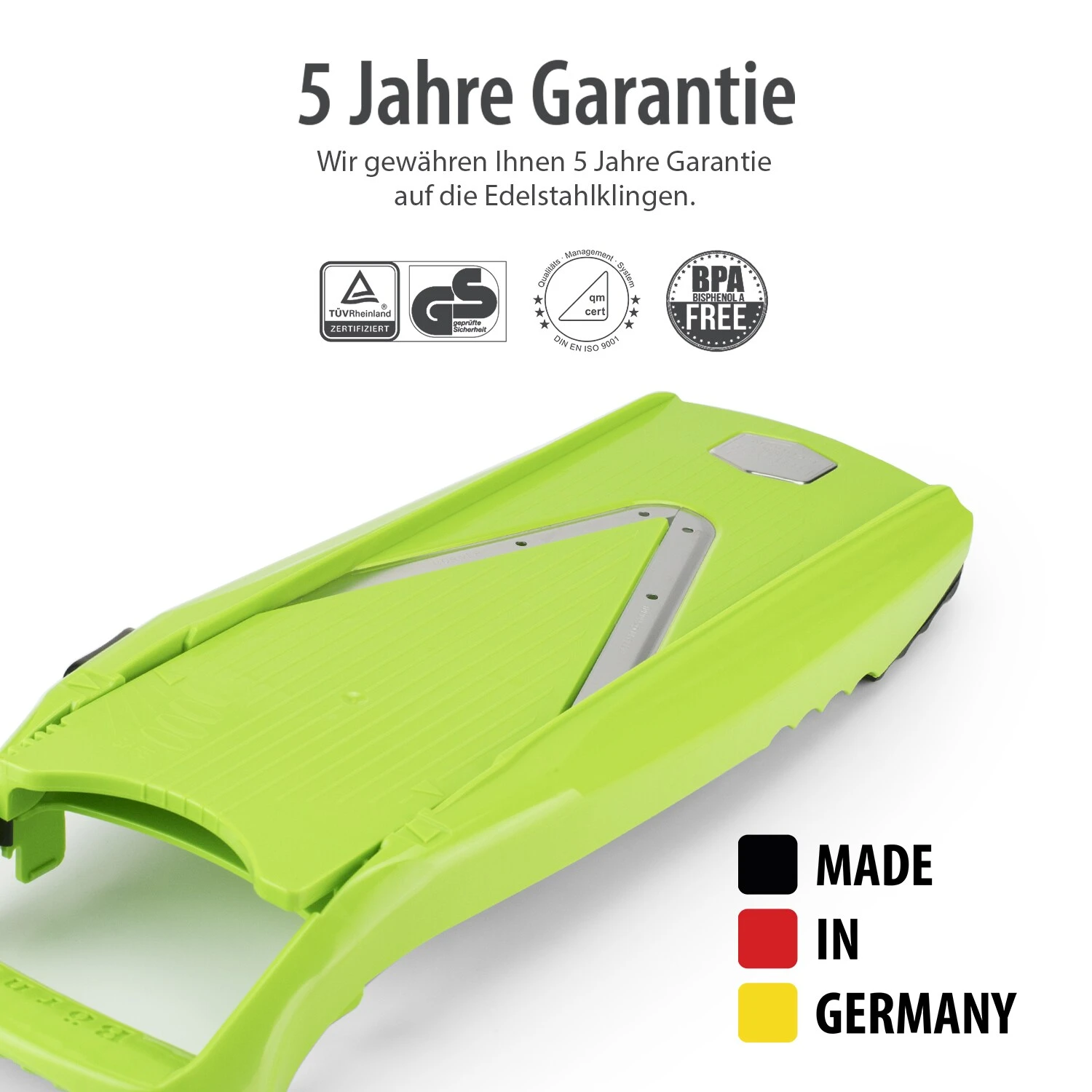 - 5 Jahre Garantie: Auf all unsere Gemuesehobel, V-Hobel, Gurkenhobel mit V-Klinge gewaehren wir eine Garantie von 5 Jahren auf die mikrofein geschliffenen hochwertigen Edelstahlmesser. Dafuer muessen Sie nur Ihren Kuechenhelfer bei uns registrieren.