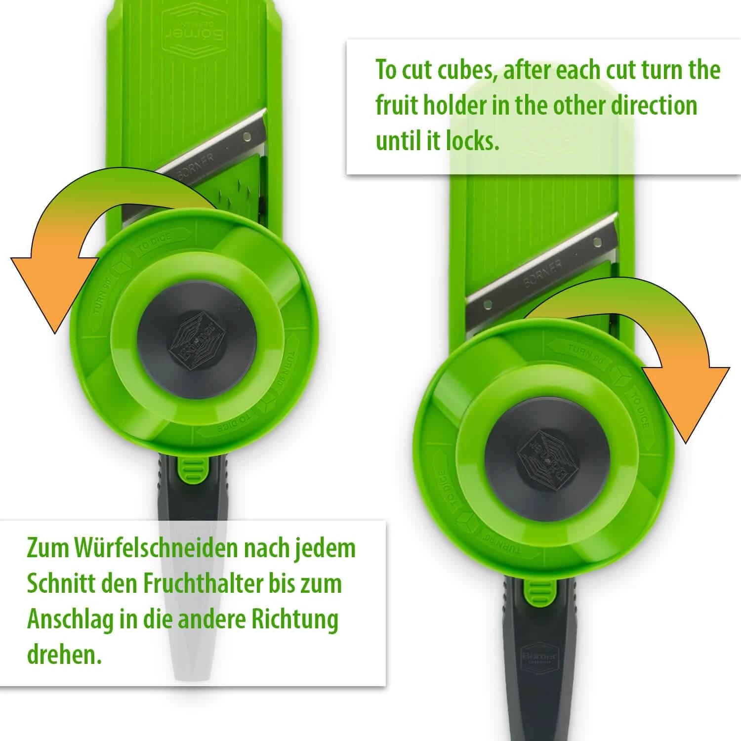 Multi Dicer, der sich perfekt für das Herstellen von Würfeln und Julienne-Streifen eignet. Dank des Fruchthalters spüren Sie genau, wann Sie Ihren Halter um 90° gedreht haben. Dies ermöglicht gleich breite wie lange Würfel zu schneiden. Zucchini, Karotten und Zwiebeln würfeln wird so zum Kinderspiel. Der Fingerschutz mit integrierter Halterung sorgt für Sicherheit beim Schneiden von selbst kleinstem Gemüse und Obst. Die Schiene kann einfach am Multi Dicer eingespannt werden und bewegt sich dann beim Schneiden mit.