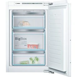 Der Einbau-Gefrierschrank Bosch GIV21ADD0 stellt einen Gesamtnutzinhalt von 95 Litern zur Verfügung und lässt sich mit einem integrierbaren Kühlschrank zur Kühl-/Gefrierkombination kombinieren. Ausgestattet ist er mit vier transparenten Schubladen zur übersichtlichen Lagerung von Tiefkühlkost, davon eine BigBox zum Stapeln von Einfrierbehältern oder für großes Gefriergut. Die LowFrost-Technologie mit ihrem Spezialverdampfer reduziert die Eisbildung auf ein Minimum, sodass Energie und Arbeit beim Abtauen gespart wird. Innerhalb von 24 Stunden friert der GIV21ADD0 bis zu 12 Kilogramm Lebensmittel ein. Die SuperGefrieren-Funktion lässt Lebensmittel schneller durchfrieren und schützt Tiefgefrorenes beim Einlegen frischer Lebensmittel vor dem Antauen. Dank der Eingefrierautomatik wechselt das Gerät nach Erreichen der erforderlichen Temperatur wieder in den Normalbetrieb um Energieverschwendung zu vermeiden. Mit einem Stromverbrauch von 140 kWh im Jahr ist der GIV21ADD0 in die Energieeffizienzklasse D eingestuft.