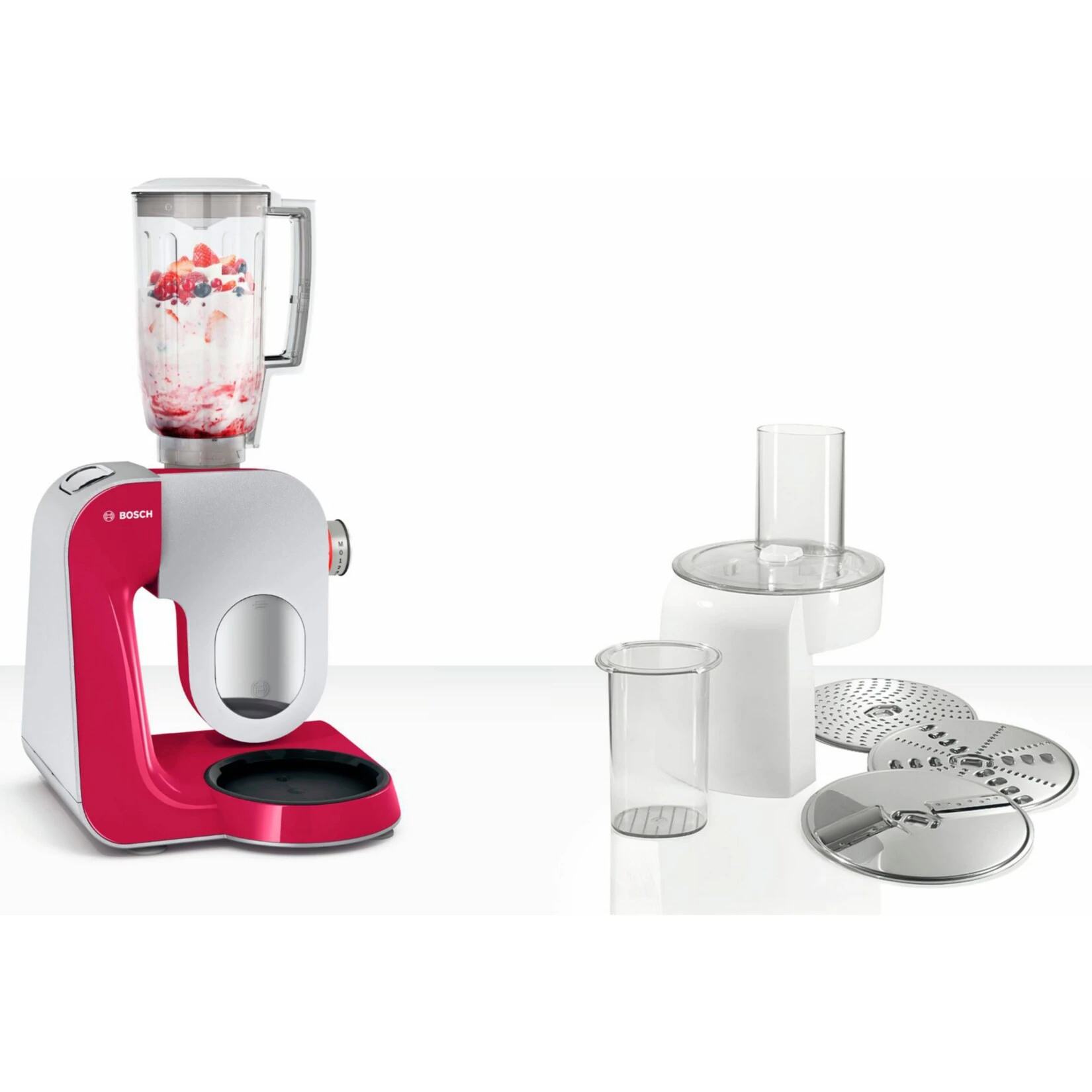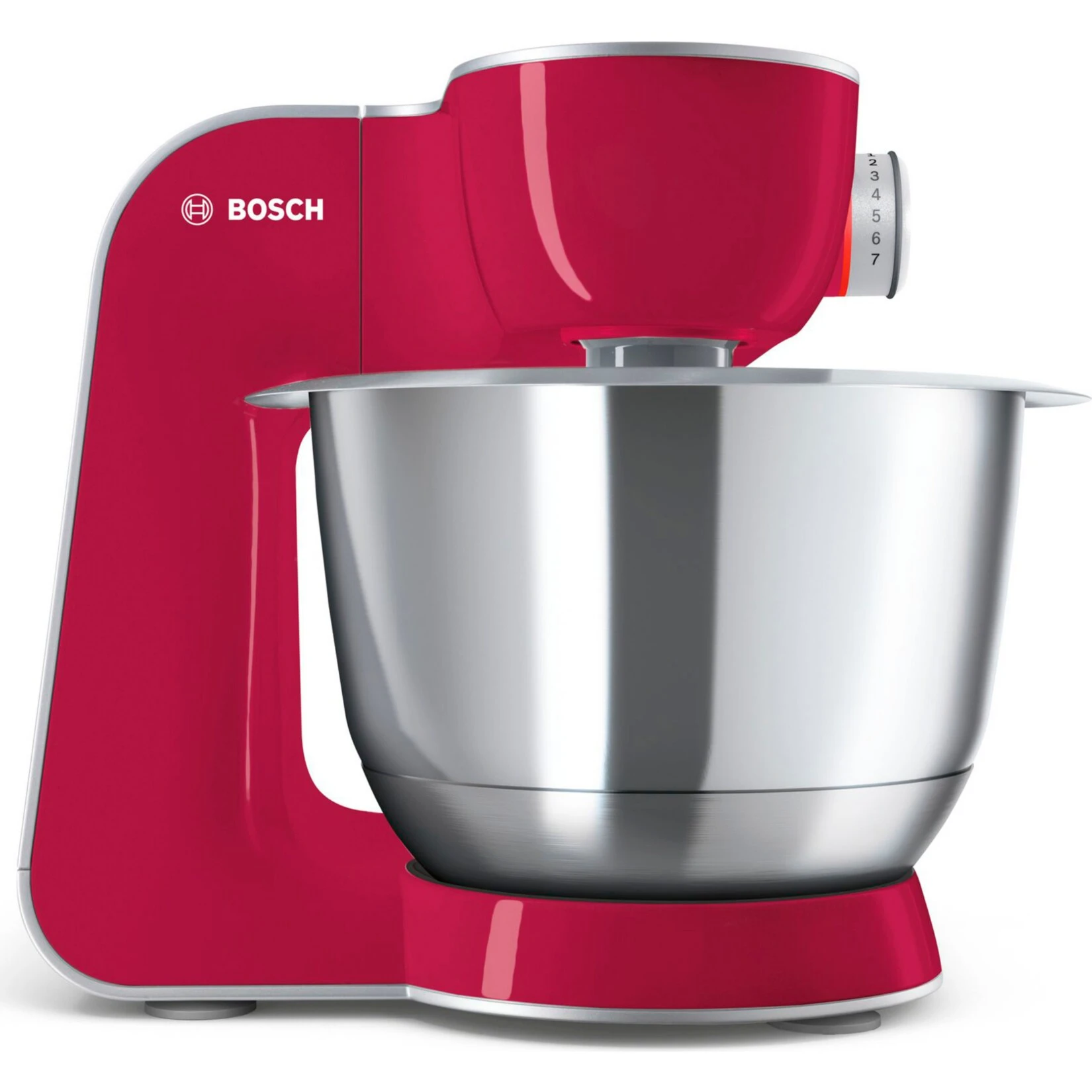 Die Universal-Küchenmaschine Bosch MUM 58420, in der Farbe Rot, ist die richtige Küchenmaschine für erste beeindruckende Koch- und Backergebnisse. Durch das hochwertige Patisserieset, welches sich in der mitgelieferten Zubehörtasche verstauen lässt, macht Backen richtig Spaß. Bei der schnellen und komfortablen Verarbeitung großer Mengen und anspruchsvoller Teige läuft der 1000 Watt starke Motor zu seiner Höchstform auf. Er überzeugt dabei durch eine perfekte Performance sowie beste Resultate. Die MUM 58420 besitzt eine Edelstahl-Rührschüssel für maximal 2,7 kg Rührteig oder 1,9 kg Hefeteig. Durch das umfangreiche Zubehör ist die MUM 58420 auch anderen Herausforderungen gewachsen. Mühelos schneidet, raspelt oder mixt sie verschiedene Lebensmittel. In punkto Sicherheit glänzt sie mit einem Überlastungsschutz, einer Wiedereinschaltsicherung und rutschfesten Gummifüßen für einen sicheren Stand auf der Arbeitsfläche.