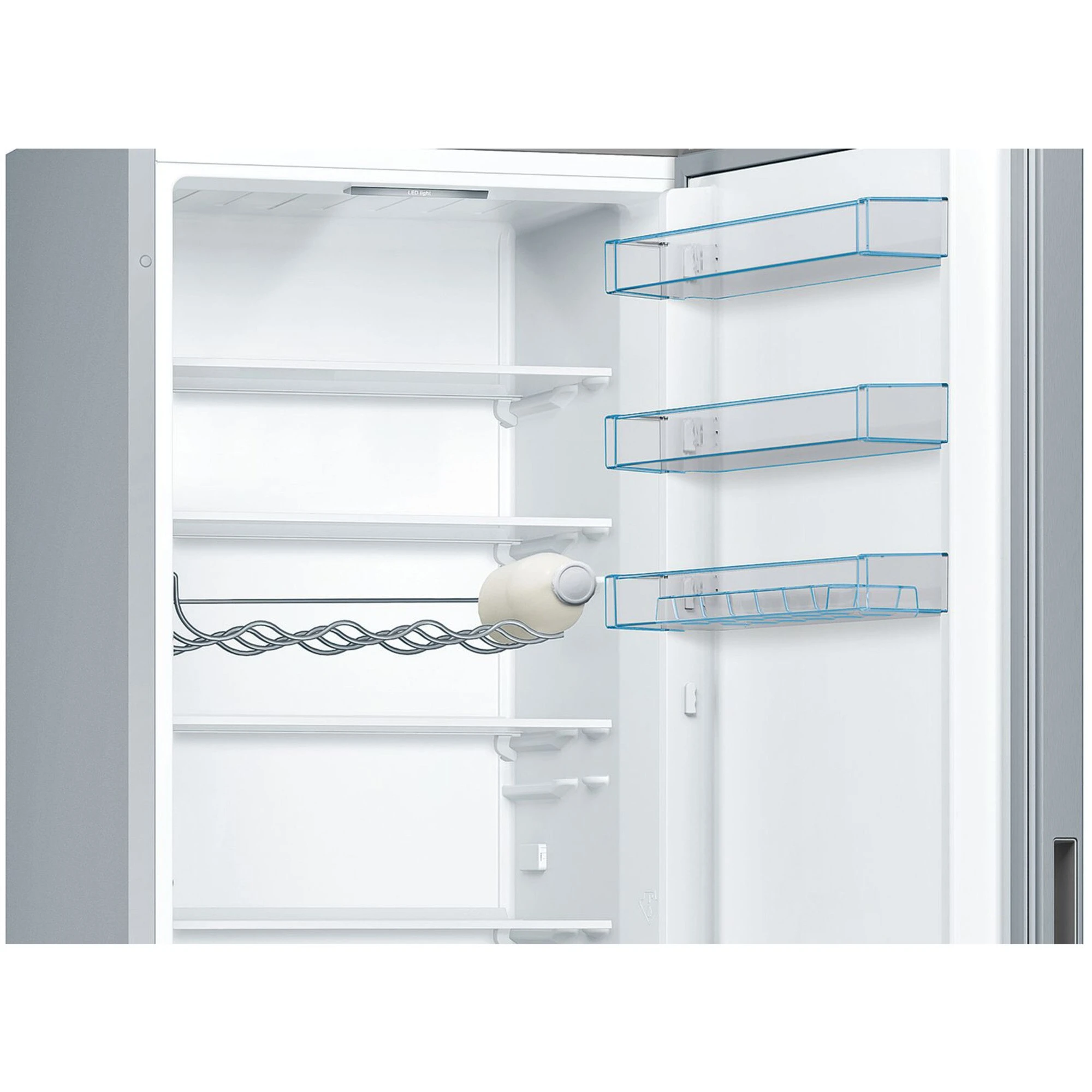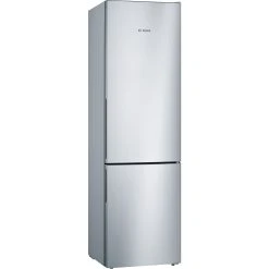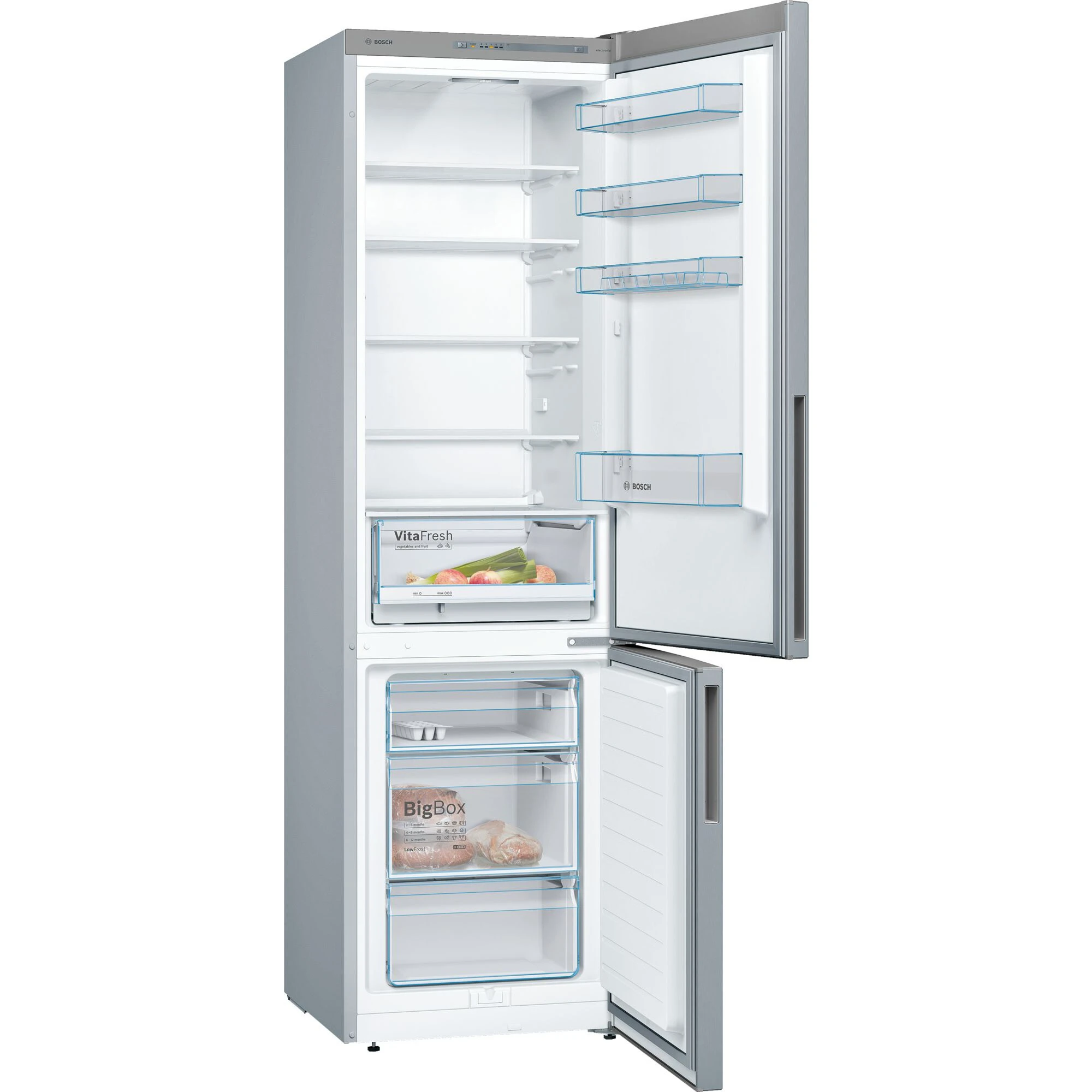 Die Kühl-/Gefrierkombination Bosch KGV39VLEA ist mit einem Gesamtnutzinhalt von 343 Litern ideal für den mittelgroßen Haushalt geeignet. Im 249 Liter umfassenden Kühlbereich haben frische Lebensmittel auf fünf Abstellflächen aus Sicherheitsglas, davon zwei höhenverstell- und vier ausziehbar (EasyAccess-Shelf), in einer VitaFresh Schublade, ideal zur Lagerung von Obst und Gemüse, sowie in vier Türfächern übersichtlichen Platz. Der Gefrierbereich umfasst 94 Liter und ist mit drei transparenten Gefrierschubladen, davon eine BigBox zum Stapeln von Einfrierbehältern oder für großes Gefriergut, ausgestattet. LowFrost reduziert die Eisbildung, sodass seltener abgetaut werden muss, was Arbeit und Energie spart, und die SuperGefrieren-Funktion lässt Lebensmittel schneller durchfrieren, sodass Tiefgefrorenes beim Einlegen frischer Lebensmittel vor dem Antauen geschützt ist. Mit einem Stromverbrauch von 233 kWh im Jahr ist die KGV39VLEA in die Energieeffizienzklasse E eingestuft.