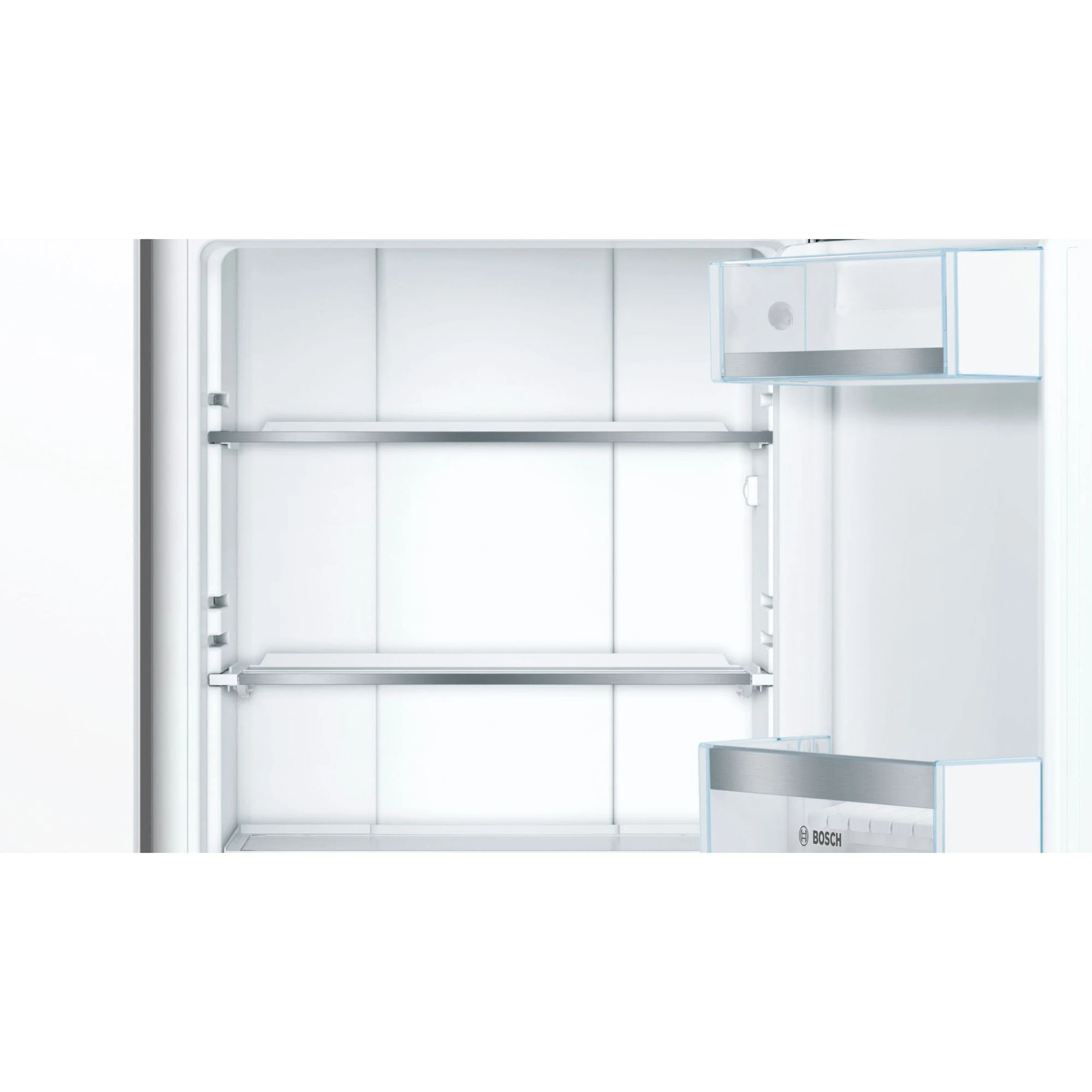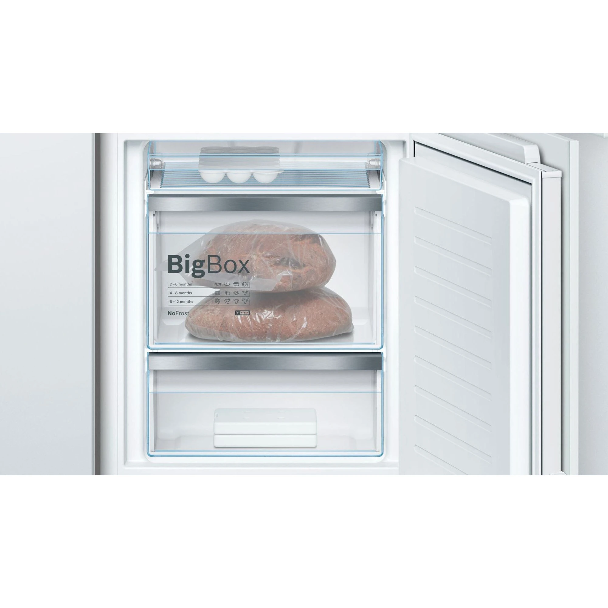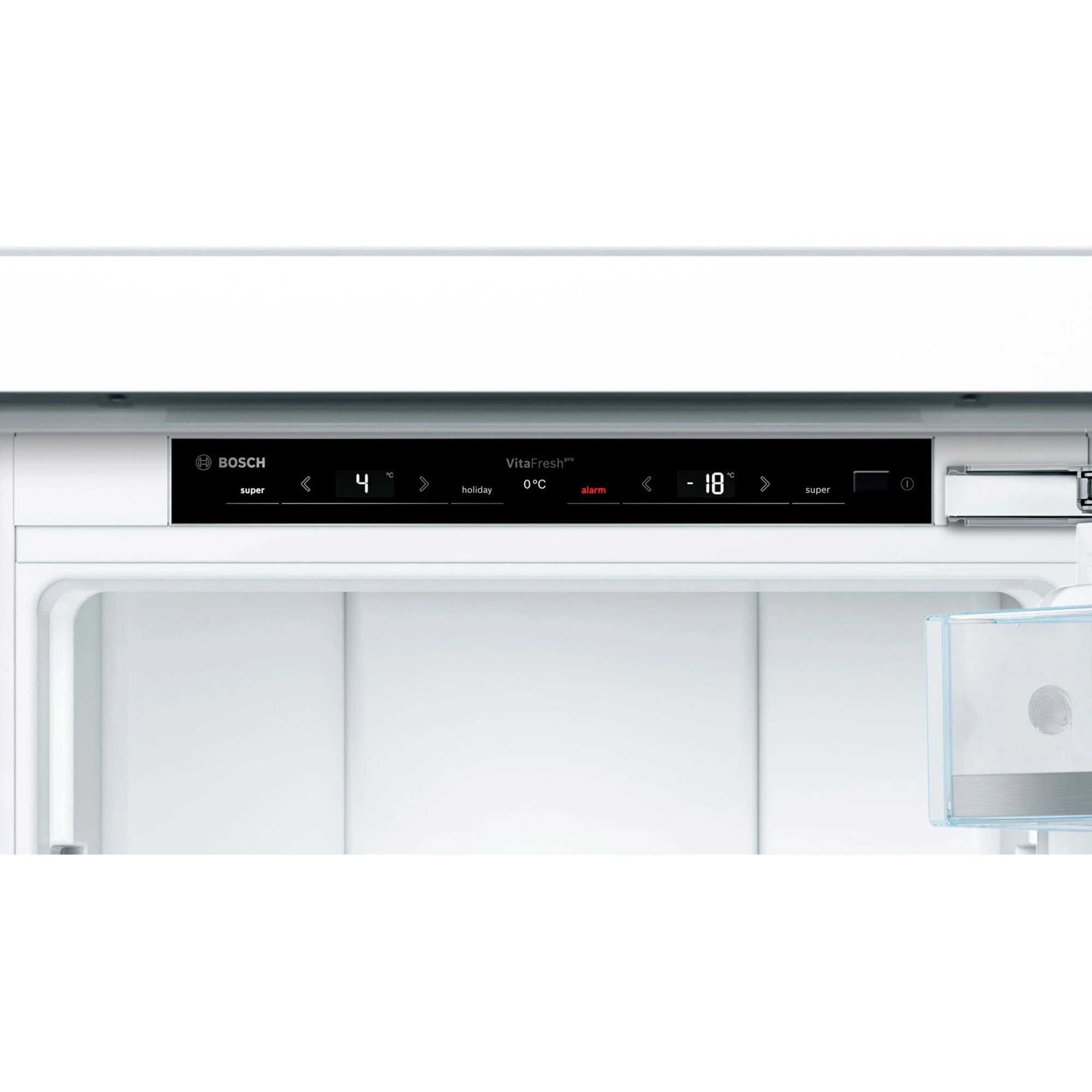 Die Kühl-/Gefrierkombination Bosch KIF86PFE0 ist mit einem Gesamtnutzinhalt von 223 Litern ideal für den mittelgroßen Haushalt geeignet. Der Kühlraum hat einen Volumen von 156 Litern und stellt drei Abstellflächen aus Sicherheitsglas, davon zwei höhenverstellbar, sowie zwei Türfächer, davon ein Butter-/Käsefach, für die übersichtliche Lagerung frischer Lebensmittel zur Verfügung. Die VitaFresh pro 0°C Schublade “taufrisch” mit aktiver Feuchteregulierung umfasst 55 Liter und hält frische Lebensmittel bis zu dreimal länger frisch. Der Gefrierbereich bietet einen Nutzinhalt von 67 Litern und ist mit drei transparenten Gefriergutschubladen, davon eine BigBox, ausgestattet. Dank der NoFrost-Technologie gegen Eis- und Reifbildung muss der Gefrierbereich der KIF86PFE0 nicht mehr mühsam abgetaut werden. FreshSense sorgt für ein optimales Aufbewahrungsklima durch intelligente Sensortechnik. Wenn man die SuperKühlen-Funktion vor dem Einkaufen aktivieren, wird die Temperatur kurzzeitig abgesenkt, damit frische Einkäufe bei der richtigen Temperatur eingelagert werden können. Mit einem Stromverbrauch von 252 kWh im Jahr ist die KIF86PFE0 in die Energieeffizienzklasse E eingestuft.