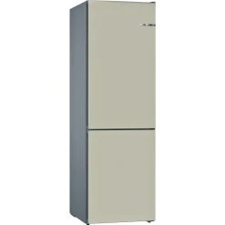 Die Vario Style Kühl-/Gefrierkombination KVN39IKEC von Bosch ist mit einem Gesamtnutzinhalt von 368 Litern ideal für den mittelgroßen Haushalt geeignet und lässt sich dank der austauschbaren Türfront jederzeit dem persönlichen Geschmack und der Einrichtung entsprechend anpassen. Ihr intensiver Champagner-Ton schenkt jeder Küche einen eleganten und modernen Look. Der 279 Liter umfassende Kühlbereich stellt für die übersichtliche Lagerung frischer Lebensmittel fünf Abstellflächen aus Sicherheitsglas, davon drei höhenverstellbar und ein ausziehbares EasyAccess Shelf, eine VitaFresh Obst-/Gemüseschublade, zwei VitaFresh 0°C Schubladen sowie vier Türfächern zur Verfügung. Die SuperKühlen-Funktion kühlt neu eingelegte Einkäufe schneller ab und das MultiAirflow-System sorgt für eine optimale und gleichmäßige Kälteverteilung. Der Gefrierbereich umfasst 89 Liter, ist mit drei transparenten Gefriergutschubladen ausgestattet und muss dank NoFrost-Technologie nie wieder mühsam abgetaut werden. Die SuperGefrieren-Funktion schützt bereits lagerndes Gefriergut vor dem Antauen, wenn größere Mengen wärmerer Speisen eingefroren werden. Die Temperatur der KVN39IKEC ist für jede Temperaturzone getrennt regel- und über LED ablesbar. FreshSense sorgt für eine konstante Temperatur durch intelligente Sensortechnik und dank Perfect Fit ist die Platzierung der Kühl-/Gefrierkombination an der Wand oder neben anderen Geräten möglich. Mit einem Stromverbrauch von 238 kWh im Jahr ist die KVN39IKEC in die Energieeffizienzklasse E eingestuft.