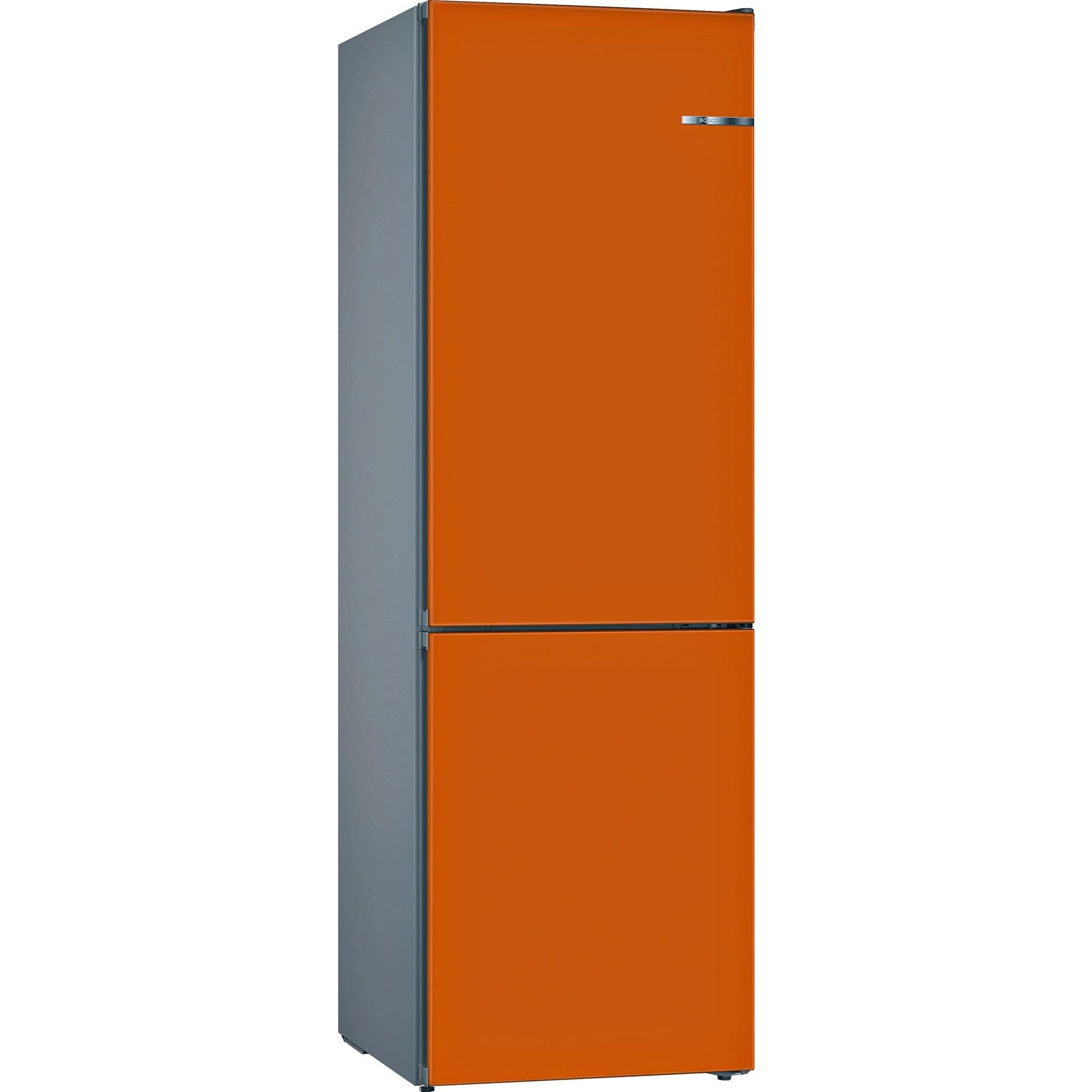 Die Vario Style Kühl-/Gefrierkombination KVN39IOEA von Bosch ist mit einem Gesamtnutzinhalt von 368 Litern ideal für den mittelgroßen Haushalt geeignet und lässt sich dank der austauschbaren Türfront jederzeit dem persönlichen Geschmack und der Einrichtung entsprechend anpassen. Ihr warmer und erfrischender Orange-Ton verleiht der Küche Eleganz und schenkt ihr einen Hauch von Frische. Der 279 Liter umfassende Kühlbereich stellt für die übersichtliche Lagerung frischer Lebensmittel fünf Abstellflächen aus Sicherheitsglas, davon drei höhenverstellbar und ein ausziehbares EasyAccess Shelf, eine VitaFresh Obst-/Gemüseschublade, zwei VitaFresh 0°C Schubladen sowie vier Türfächern zur Verfügung. Die SuperKühlen-Funktion kühlt neu eingelegte Einkäufe schneller ab und das MultiAirflow-System sorgt für eine optimale und gleichmäßige Kälteverteilung. Der Gefrierbereich umfasst 89 Liter, ist mit drei transparenten Gefriergutschubladen ausgestattet und muss dank NoFrost-Technologie nie wieder mühsam abgetaut werden. Die SuperGefrieren-Funktion schützt bereits lagerndes Gefriergut vor dem Antauen, wenn größere Mengen wärmerer Speisen eingefroren werden. Die Temperatur der KVN39IOEA ist für jede Temperaturzone getrennt regel- und über LED ablesbar. FreshSense sorgt für eine konstante Temperatur durch intelligente Sensortechnik und dank Perfect Fit ist die Platzierung der Kühl-/Gefrierkombination an der Wand oder neben anderen Geräten möglich. Mit einem Stromverbrauch von 238 kWh im Jahr ist die KVN39IOEA in die Energieeffizienzklasse E eingestuft.