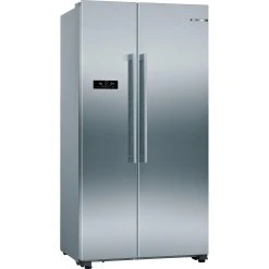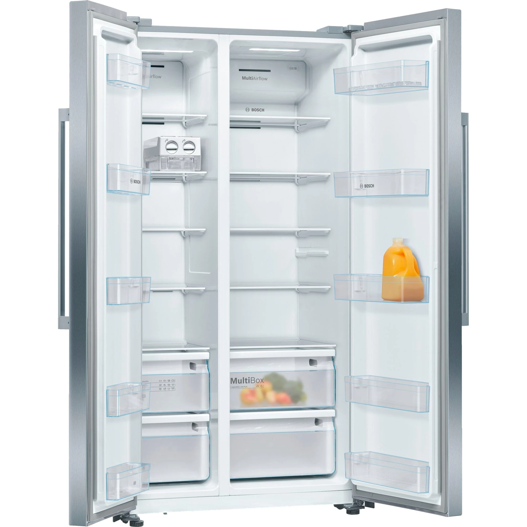 Der Side-by-Side Bosch KAN93VIFP ist mit seinem Gesamtnutzinhalt von 580 Litern ideal für den großen Haushalt geeignet und bietet viel Komfort. Das 372 Liter umfassende Kühlteil mit MultiAirflow-System ist mit fünf Abstellflächen aus Sicherheitsglas, zwei transparente MultiBoxen auf Rollen mit Wellenboden zur Lagerung von Obst und Gemüse sowie fünf Türfächern ausgestattet. Das 4-Sterne-Gefrierteil mit NoFrost-Technologie gegen Eis- und Reifbildung umfasst 202 Liter, stellt zwei transparente Gefrierschubladen und ebenfalls fünf Türfächern zur Verfügung sowie ein 2-Sterne-Fach mit 6 Litern. Der IceTwister sorgt für jede Menge Eiswürfel und lässt sich einfach herausnehmen und befüllen. Die Temperaturregelung des KAN93VIFP erfolgt über das in Tür integrierte TouchControl-Display, mit dem man alles im Blick und perfekt unter Kontrolle hat. Besonders praktisch sind auch die Funktionen SuperKühlen und SuperGefrieren, jeweils mit automatischer Deaktivierung. Mit einem Stromverbrauch von 413 kWh im Jahr ist der KAN93VIFP in die Energieeffizienzklasse F eingestuft.