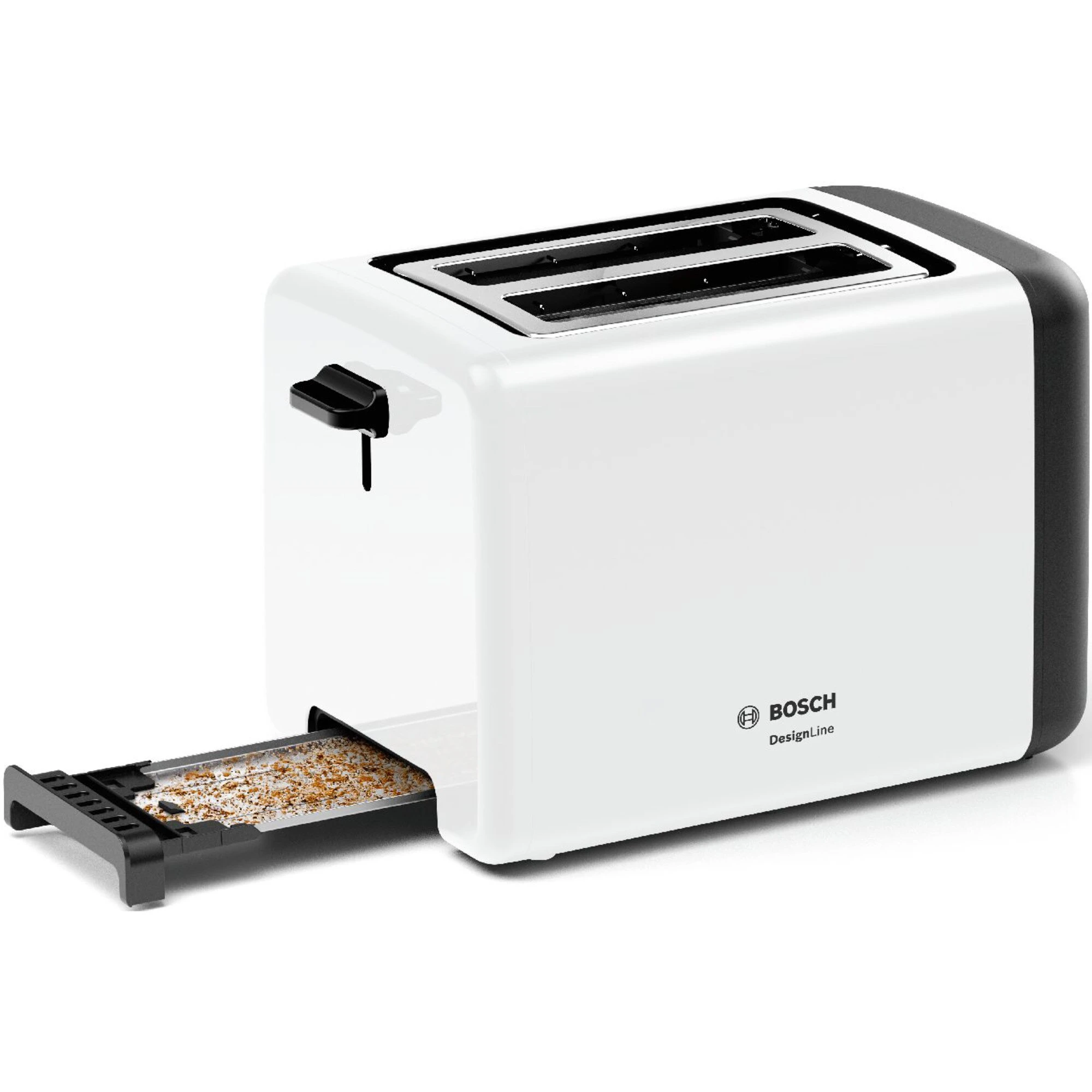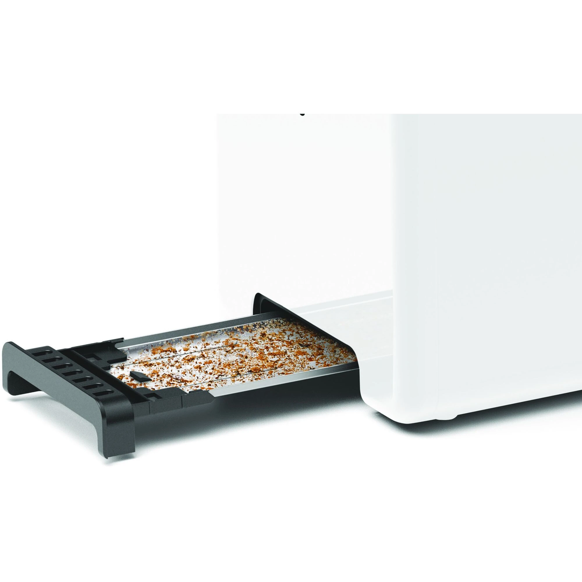 Der Kompakt-Toaster DesignLine TAT 3P421DE von Bosch bietet Platz für zwei Toastscheiben. Mit der stufenlos einstellbaren elektronischen Röstgradkontrolle lässt sich der gewünschte Bräunungsgrad einstellen. Die automatische Brotzentrierung und die elektronische Bräunungsgradkontrolle sorgen für ein optimales und gleichmäßiges Röstbild. Praktisch ist außerdem die Lift-Funktion für kleine Brotscheiben, die beleuchtete Stop-Taste, die Aufwärm- und Auftaufunktion und der integrierte und versenkbare Brötchen-Aufsatz. Die herausnehmbare Krümelschublade vereinfacht die Reinigung, und die automatische Sicherheitsabschaltung, wenn sich der Toast verklemmt, machen die Bedienung des Toasters DesignLine TAT 3P421DE nicht nur einfach, sondern auch sicher.