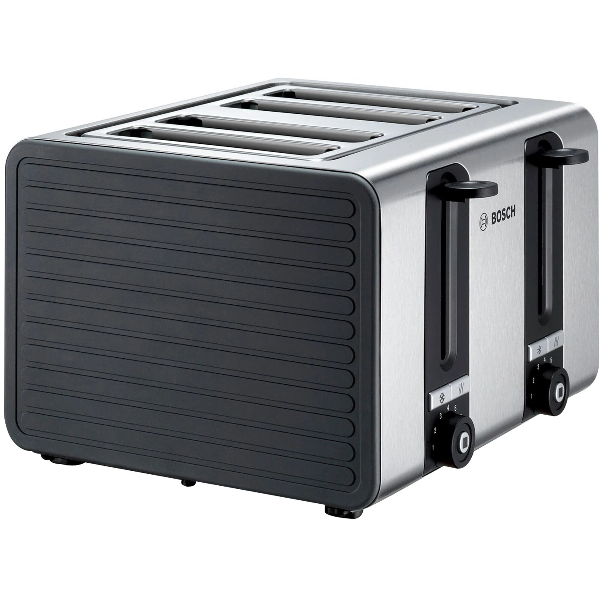 Mit dem Bosch TAT7S45 Edelstahl-Toaster kann man gleich am frühen Morgen Zeit sparen: Der TAT7S45 fasst insgesamt bis zu vier Scheiben Toast in insgesamt zwei Kammern, welche sich separat voneinander im Bräunungsgrad einstellen lassen. Die Toast-Scheiben werden dank Zentrierung gleichmäßig geröstet um ein stets optimal Ergebnis sicher zu stellen. Wahlweise lassen sich die eingelegten Toasts auch Aufwärmen oder Auftauen, einzeln und über eine beleuchtete Funktionstaste. Zur optimalen Reinigung besitzt der Bosch TAT7S45 eine Krümelschublade für beide Bereiche, die sich herausnehmen und reinigen lässt. Für mehr Sicherheit sorgt zudem die automatische Abschaltfunktion, sollte ein Toast stecken bleiben.