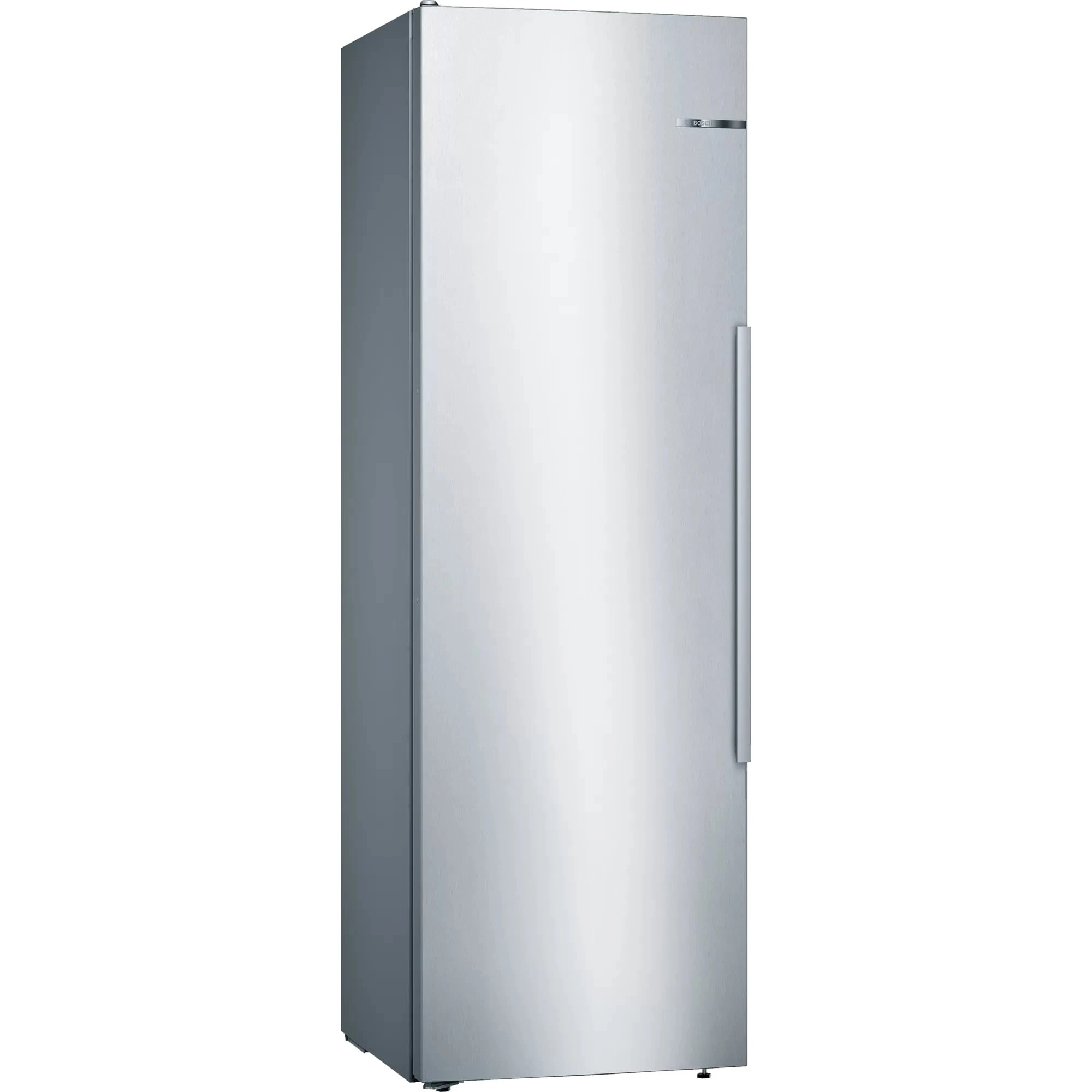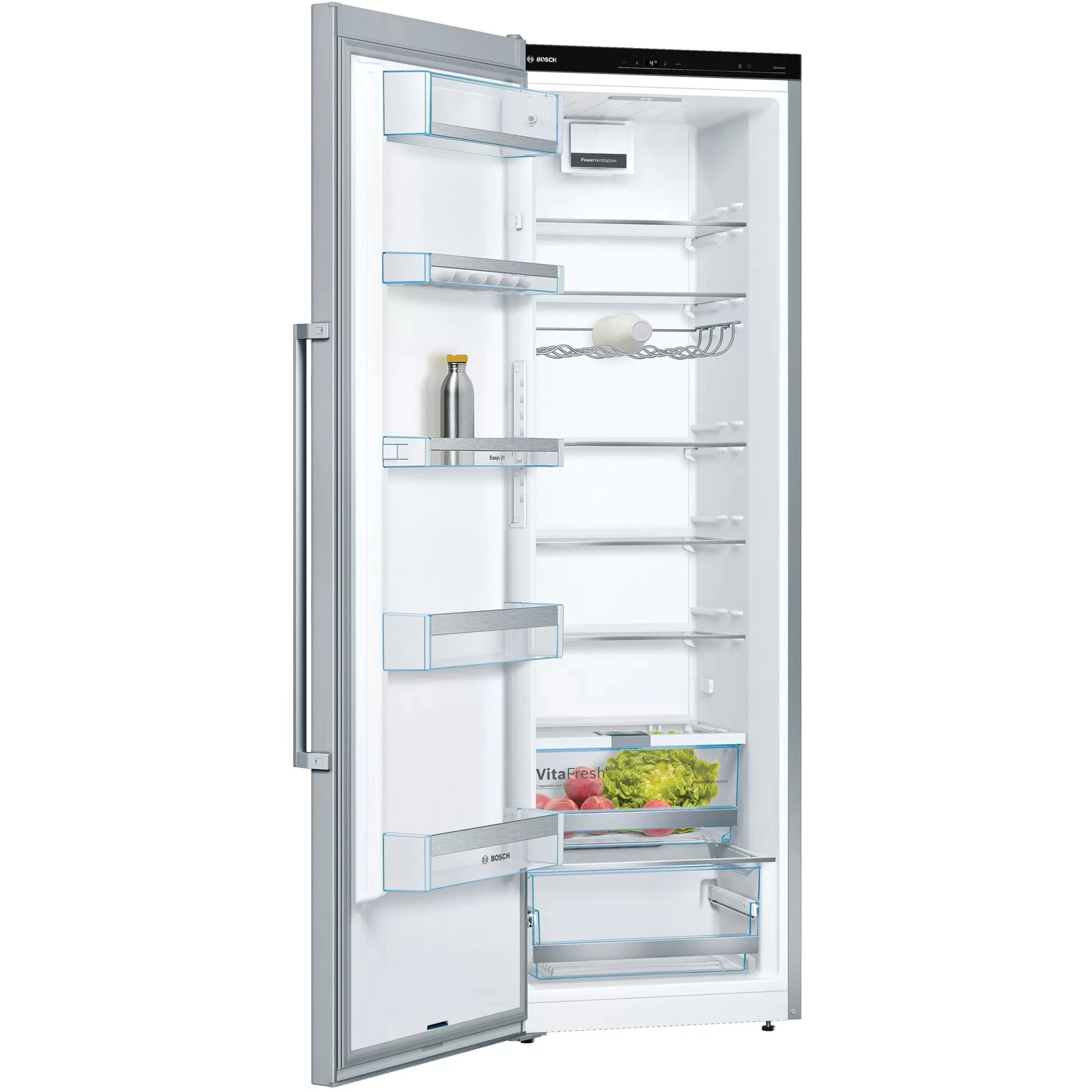 Der Kühlschrank Bosch KSV36AIDP eignet sich mit einem Gesamtnutzinhalt von 346 Litern ideal für den großen Haushalt und bietet jede Menge Platz für die übersichtliche Lagerung frischer Lebensmittel. Ausgestattet ist er mit sieben Abstellflächen aus Sicherheitsglas, davon fünf höhenverstell- und sechs ausziehbar, sowie fünf Türfächern, davon ein Butter-/Käsefach. In der VitaFresh plus Box bleibt Obst und Gemüse bis zu zweimal länger vitaminreich und frisch und die MultiBox auf Teleskopschienen mit Wellenboden ist ebenfalls ideal zur Lagerung von Obst und Gemüse geeignet. FreshSense sorgt für eine konstante Temperatur durch intelligente Sensortechnik und mit der SuperKühlen-Funktion wird die Temperatur im Kühlraum schnell gesenkt, sodass beim Einlagern wärmerer Lebensmittel ein unerwünschter Temperaturanstieg bereits gekühlter Speisen verhindert wird. Mit einem Stromverbrauch von 93 kWh im Jahr ist der KSV36AIDP in die Energieeffizienzklasse D eingestuft.