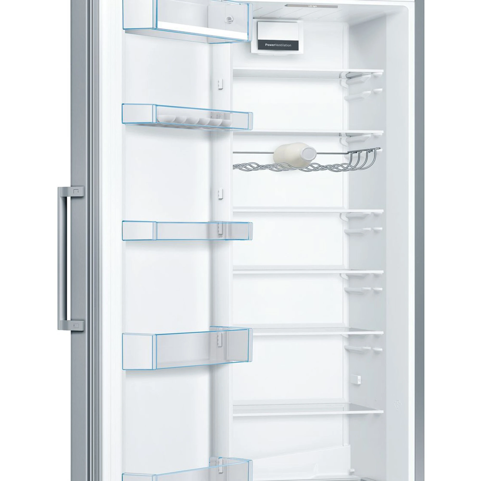 Der Kühlschrank Bosch KSV36VLDP eignet sich mit einem Gesamtnutzinhalt von 346 Litern ideal für den großen Haushalt und bietet jede Menge Platz für die übersichtliche Lagerung frischer Lebensmittel. Ausgestattet ist er mit sieben Abstellflächen aus Sicherheitsglas, davon fünf höhenverstell- und sechs ausziehbar, sowie fünf Türfächern, davon ein Butter-/Käsefach. In der VitaFresh Box bleibt Obst und Gemüse länger vitaminreich und frisch. FreshSense sorgt für eine konstante Temperatur durch intelligente Sensortechnik und mit der SuperKühlen-Funktion wird die Temperatur im Kühlraum schnell gesenkt, sodass beim Einlagern wärmerer Lebensmittel ein unerwünschter Temperaturanstieg bereits gekühlter Speisen verhindert wird. Mit einem Stromverbrauch von 93 kWh im Jahr ist der KSV36VLDP in die Energieeffizienzklasse D eingestuft.