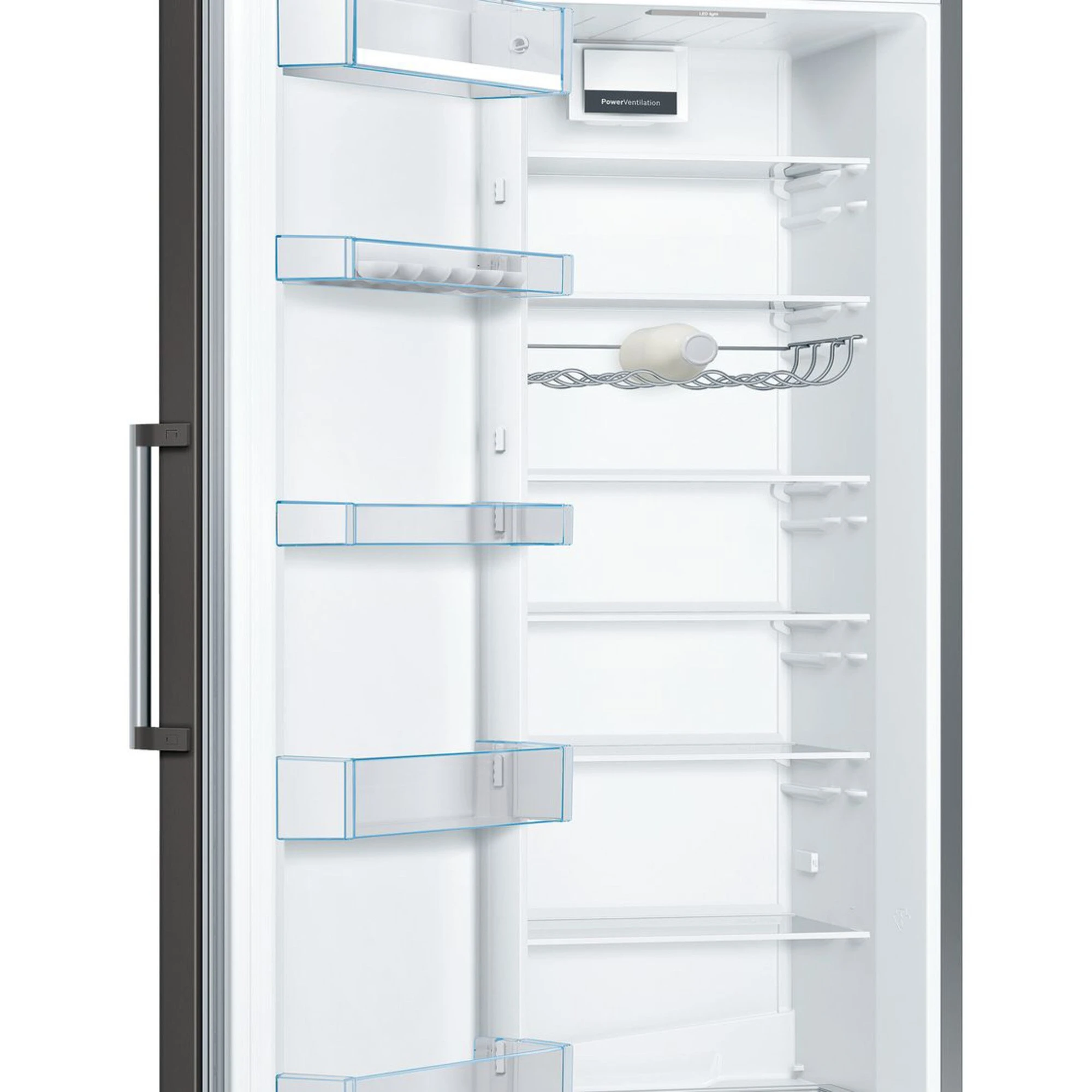 Der Kühlschrank Bosch KSV36VXEP eignet sich mit einem Gesamtnutzinhalt von 346 Litern ideal für den großen Haushalt und bietet jede Menge Platz für die übersichtliche Lagerung frischer Lebensmittel. Ausgestattet ist er mit sieben Abstellflächen aus Sicherheitsglas, davon fünf höhenverstell- und sechs ausziehbar, sowie fünf Türfächern, davon ein Butter-/Käsefach. In der VitaFresh Box bleibt Obst und Gemüse länger vitaminreich und frisch. FreshSense sorgt für eine konstante Temperatur durch intelligente Sensortechnik und mit der SuperKühlen-Funktion wird die Temperatur im Kühlraum schnell gesenkt, sodass beim Einlagern wärmerer Lebensmittel ein unerwünschter Temperaturanstieg bereits gekühlter Speisen verhindert wird. Mit einem Stromverbrauch von 116 kWh im Jahr ist der KSV36VXEP in die Energieeffizienzklasse E eingestuft.