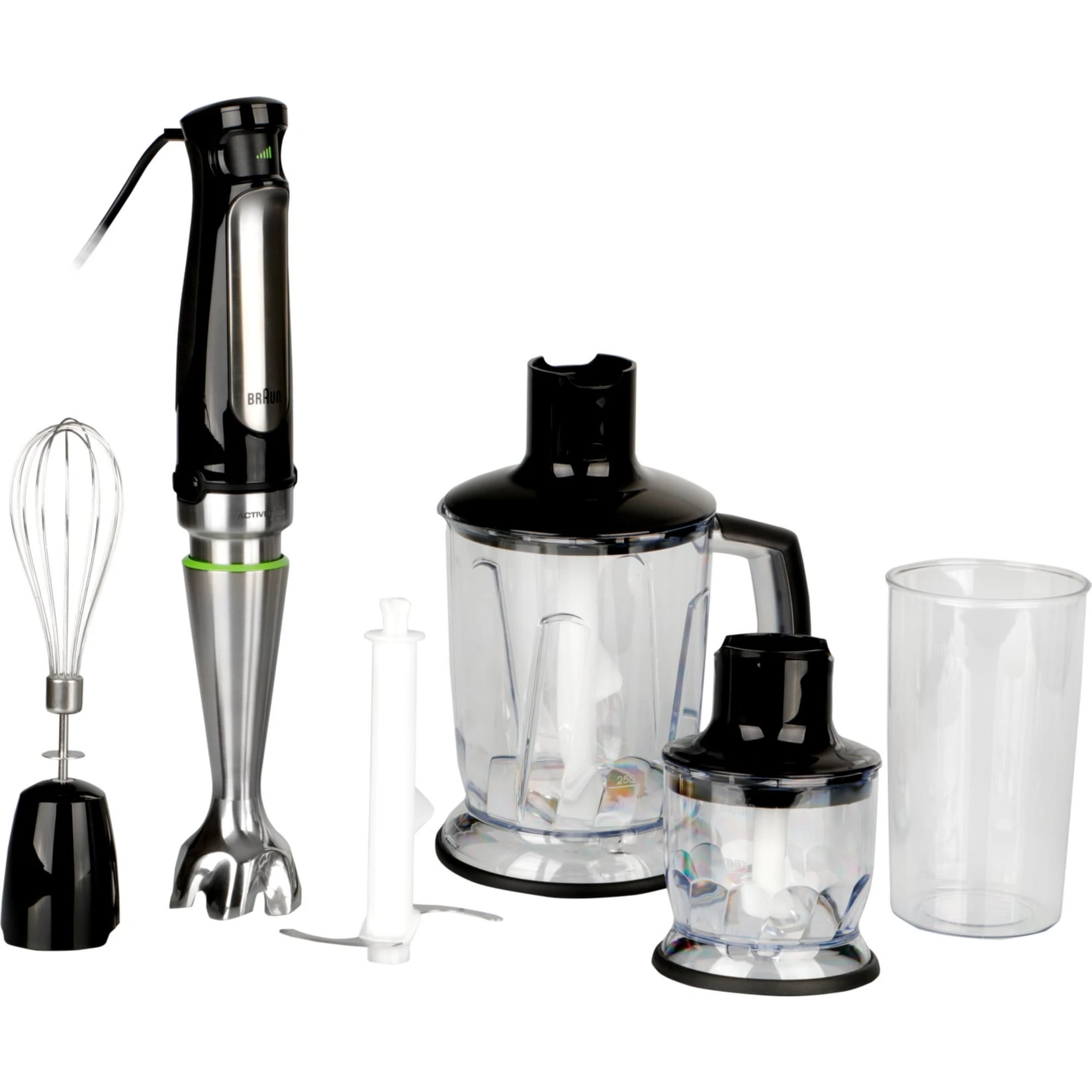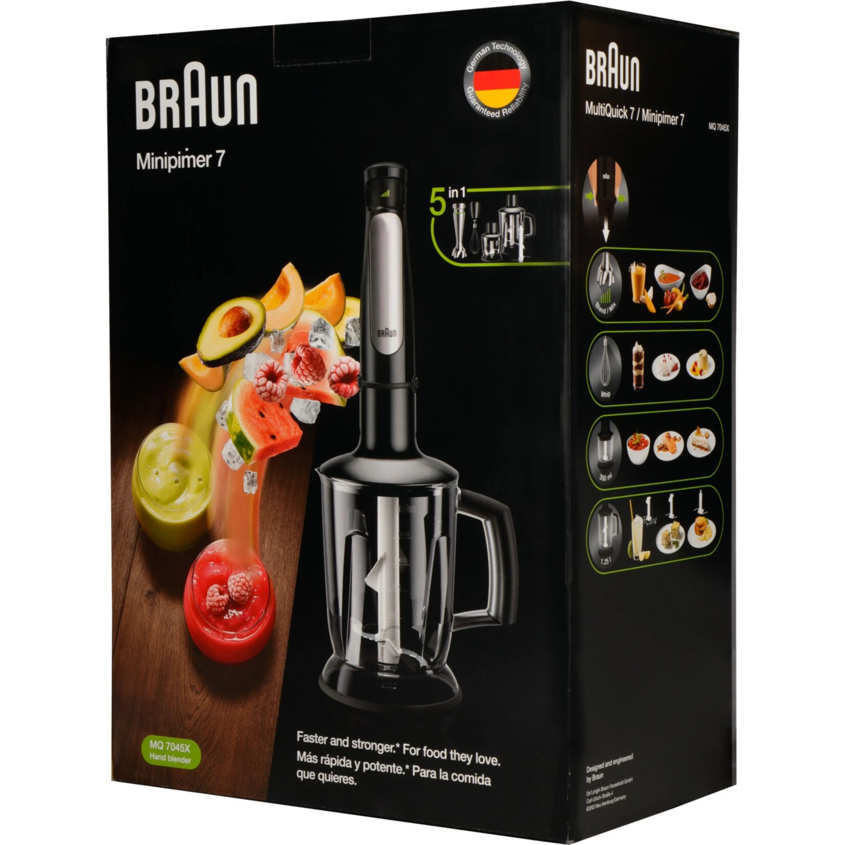 Der Braun MultiQuick 7 Stabmixer wurde designed, um die Zubereitung von gesunden Gerichten für Familie und Freunde schneller und einfacher zu gestalten. Neben POWERBell PLUS und SPLASHControl Technologie verfügt der MQ 7045X über ACTIVEBlade Technologie. Dabei bewegt sich sie Messerklinge von oben nach unten und bietet mehr aktive Schneidefläche. Dank POWERBell Plus wird das Vorschneiden reduziert. Die extra Mahlklinge püriert auch ganze Lebensmittel. Außerdem nutzt der Stabmixer die Easy SmartSpeed Technologie, die für Geschwindigkeitskontrolle auf Knopfdruck sorgt. Je stärker der Tastendruck, desto höher die Leistung. Das EasyClick System Plus ermöglicht schnelleres Anbringen und Austauschen von Zubehör, dank größerer Knöpfe und einem intuitiven, geraden Design.