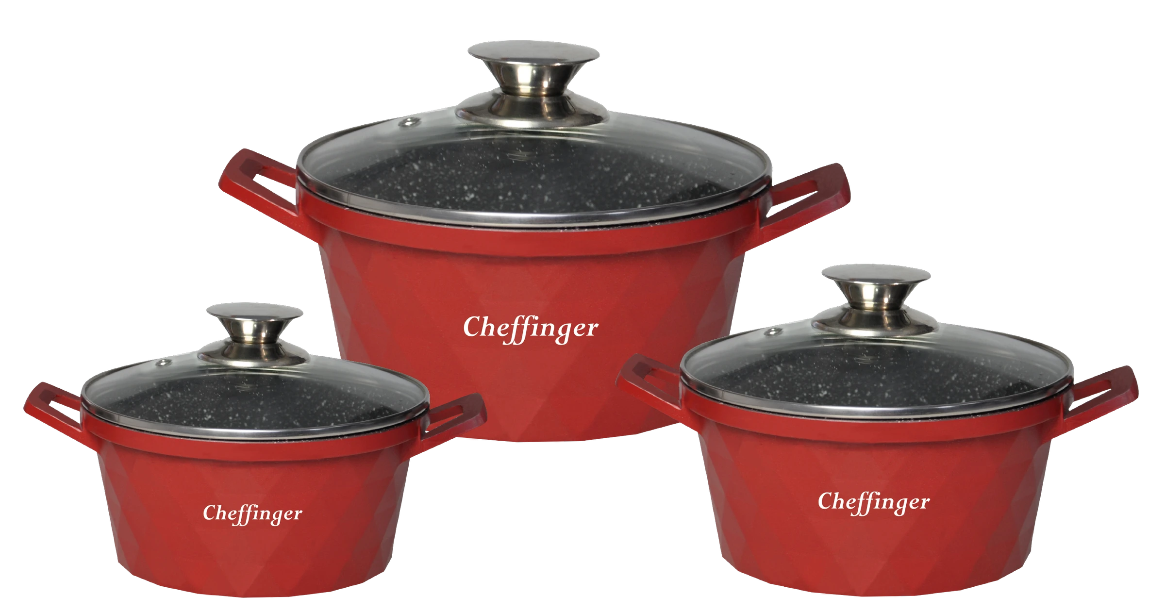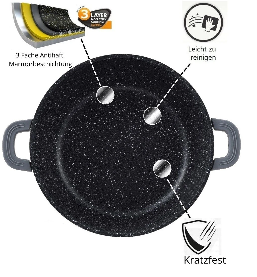 Mit diesem Geschirrset in Diamant Design können Sie die köstlichsten Gerichte zubereiten. Das Set besteht aus drei Töpfe mit Deckel. Die Töpfe sind aus Aluminium Guss gefertigt und mit einer 3-Schicht-Marmorbeschichtung versehen. Sie können für alle Arten von Wärmequellen verwendet werde. Die Deckel bestehen aus gehärtetem Glas.