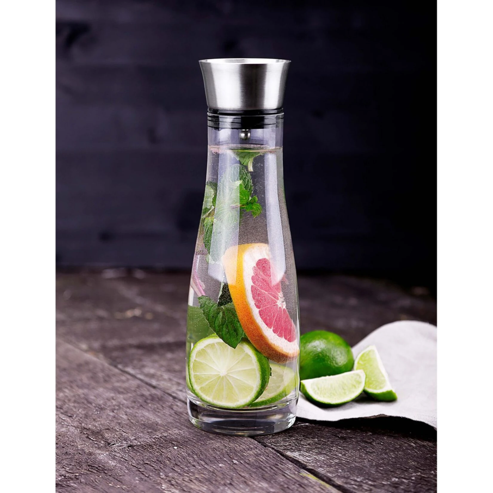 Der formschöne Ausgießer aus gebürstetem, rostfreiem Edelstahl ermöglicht ein einfaches Ausschenken ohne Verschütten und hält Eiswürfel, Zitronenscheiben etc. dank des integrierten Siebs, von Ihrem Glas fern – der Deckel schließt und öffnet sich automatisch.