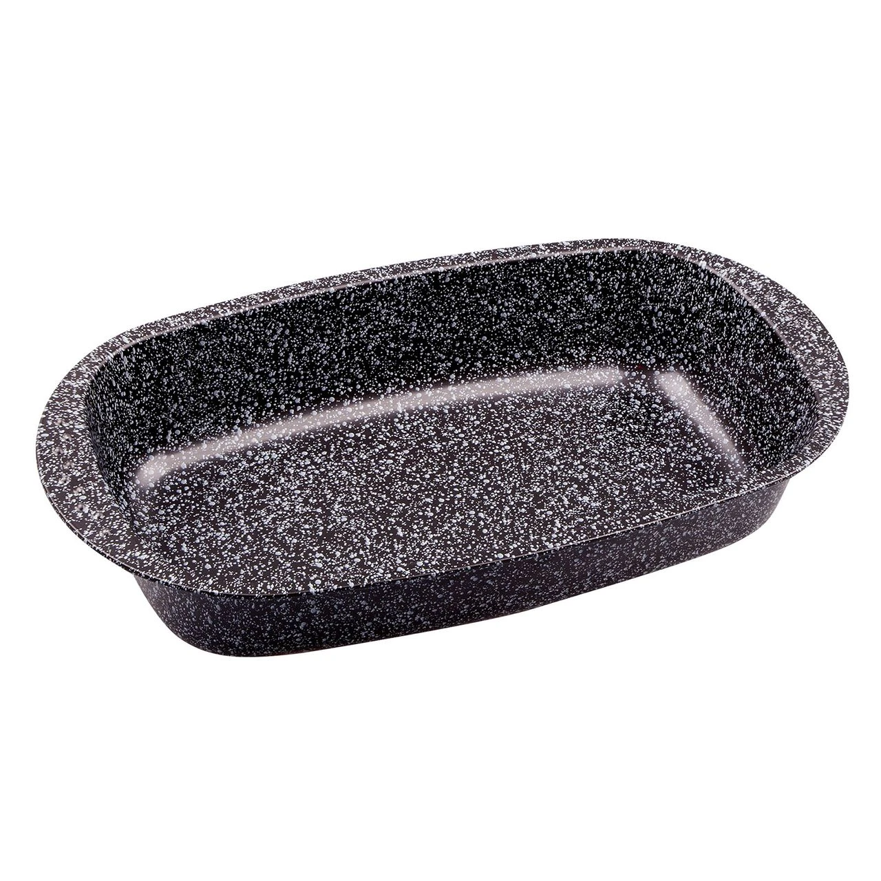 Die Bratenform Granito in Anthrazit-metallic ist extra tief und kann gleichzeitig mit Deckel genutzt werden, indem man eine zweite Form auf die Griffmulden und Arretierungspunkten setzt. Diese Form dient auch prima als Brotbackform. Dank der hochwertigen ILAG-Antihaftbeschichtung, ist sie bis 250°C hitzebeständig, hat einen guten Antihafteffekt und ist leicht zu reinigen.