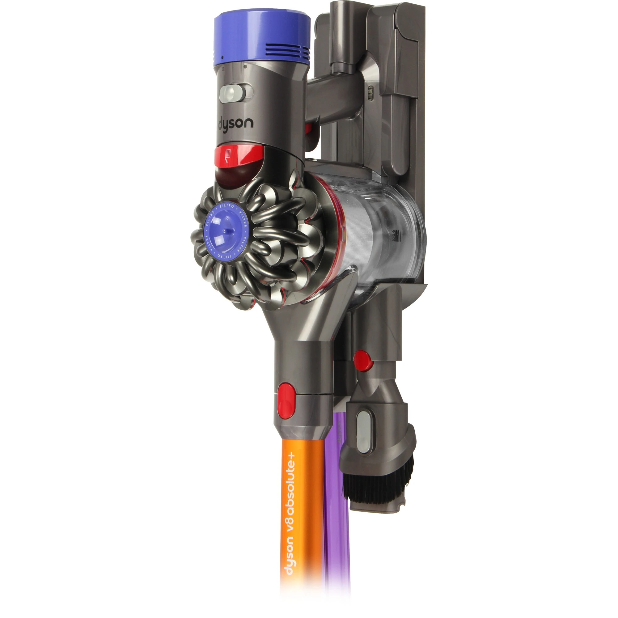Der Dyson V8 Absolute+ bietet bis zu 40 Minuten leistungsstarke Saugkraft von Dyson. Dank zusätzlicher Bodendüsen reinigt der Dyson V8 Absolute+ Schmutz von verschiedensten Bodenarten und Oberflächen. Das hygienische System zur Behälterentleerung bietet eine sauberere Möglichkeit, Schmutz zu entsorgen. Mit siebenteiligem Zubehör zur gründlichen Reinigung im ganzen Zuhause. Alle Dyson kabellosen Staubsauger lassen sich für schnelle und punktuelle Reinigungsaufgaben oder zum Säubern von schwer erreichbaren Stellen ganz einfach in einen Akku-Handsauger verwandeln. Durch die patentierten 2 Tier Radial Zyklone nimmt der Dyson noch mehr Staub auf. 14 Zyklone in zwei Reihen erzeugen starke Zentrifugalkräfte, die Staub und Allergene aus dem Luftstrom trennen.