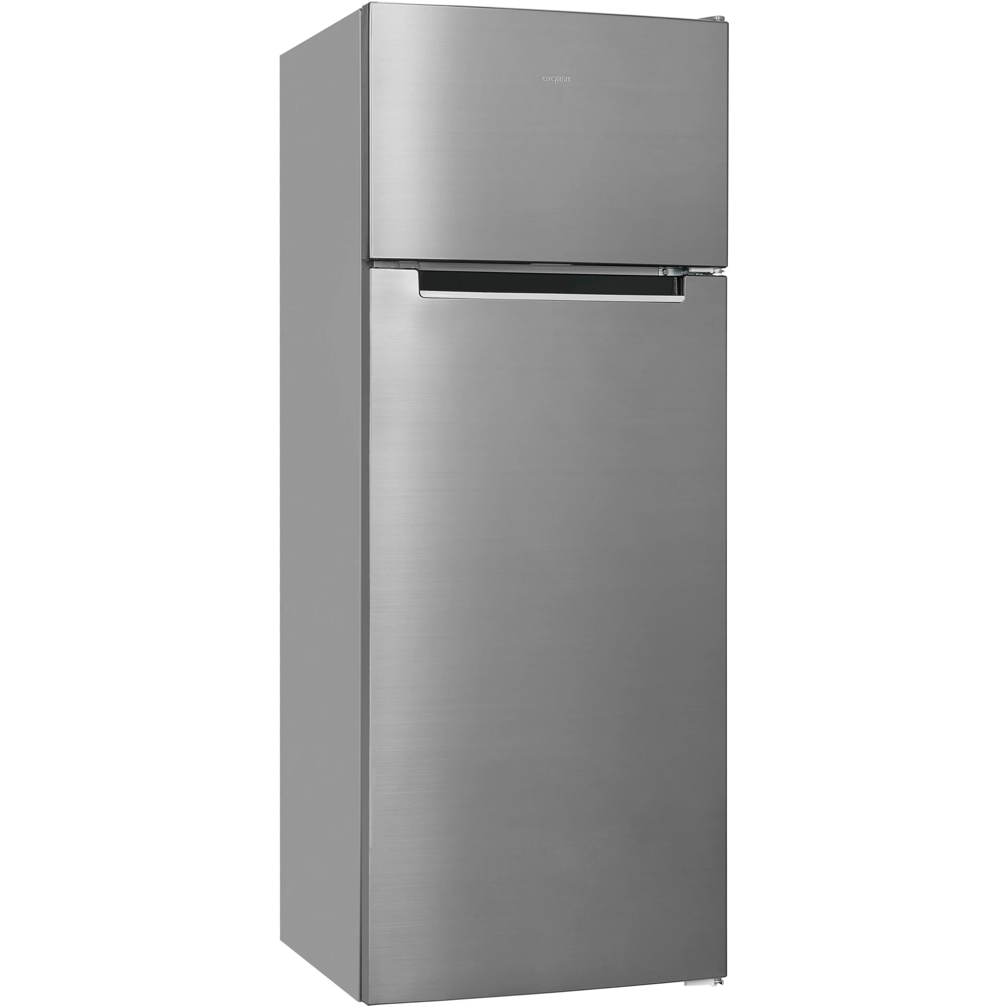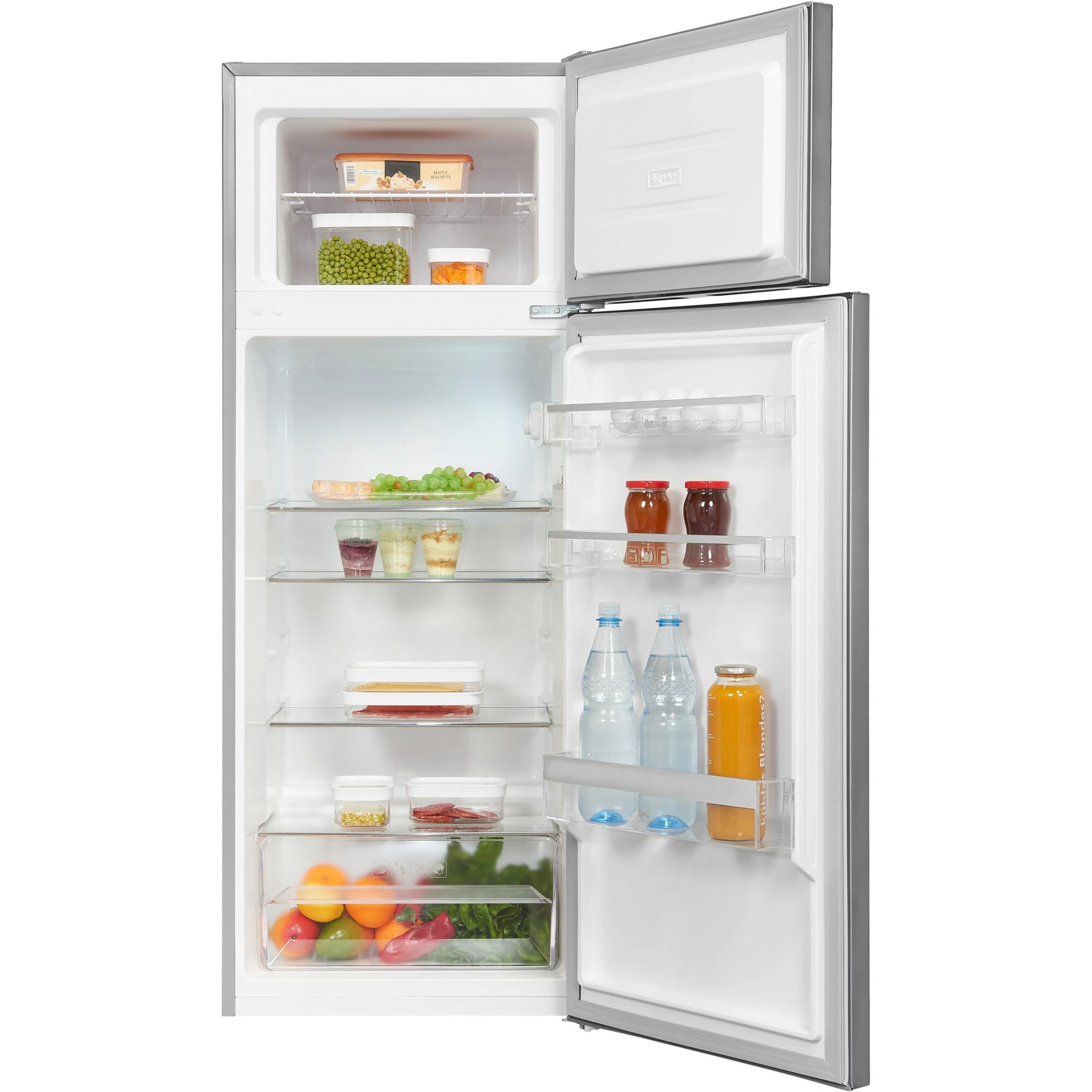 Die Kühl-/Gefrierkombination Exquisit KGC270-45-040E ist einem Gesamtnutzinhalt von 206 Litern ideal für den mittelgroßen Haushalt geeignet. Der 169 Liter umfassende Kühlraum stellt vier Glasabstellflächen, davon drei höhenverstellbar, eine Obst-/Gemüseschublade sowie drei Türfächer zur übersichtlichen Lagerung frischer Lebensmittel zur Verfügung. Das LED-Licht sorgt für eine effiziente Ausleuchtung des Innenraums und eine gute Sicht auf die Speisen. Der obenliegende, 37 Liter große Gefrierraum wird von einer Glasabstellfläche unterteilt und friert innerhalb von 24 Stunden bis zu 2,4 Kilogramm Lebensmittel ein. Die Temperaturregelung erfolgt stufenlos für mehr Flexibilität und Rollen hinten am Gerät ermöglichen ein leichtgängiges Verschieben. Mit einem Stromverbrauch von 172 kWh im Jahr ist die KGC270-45-040E in die Energieeffizienzklasse E eingestuft.