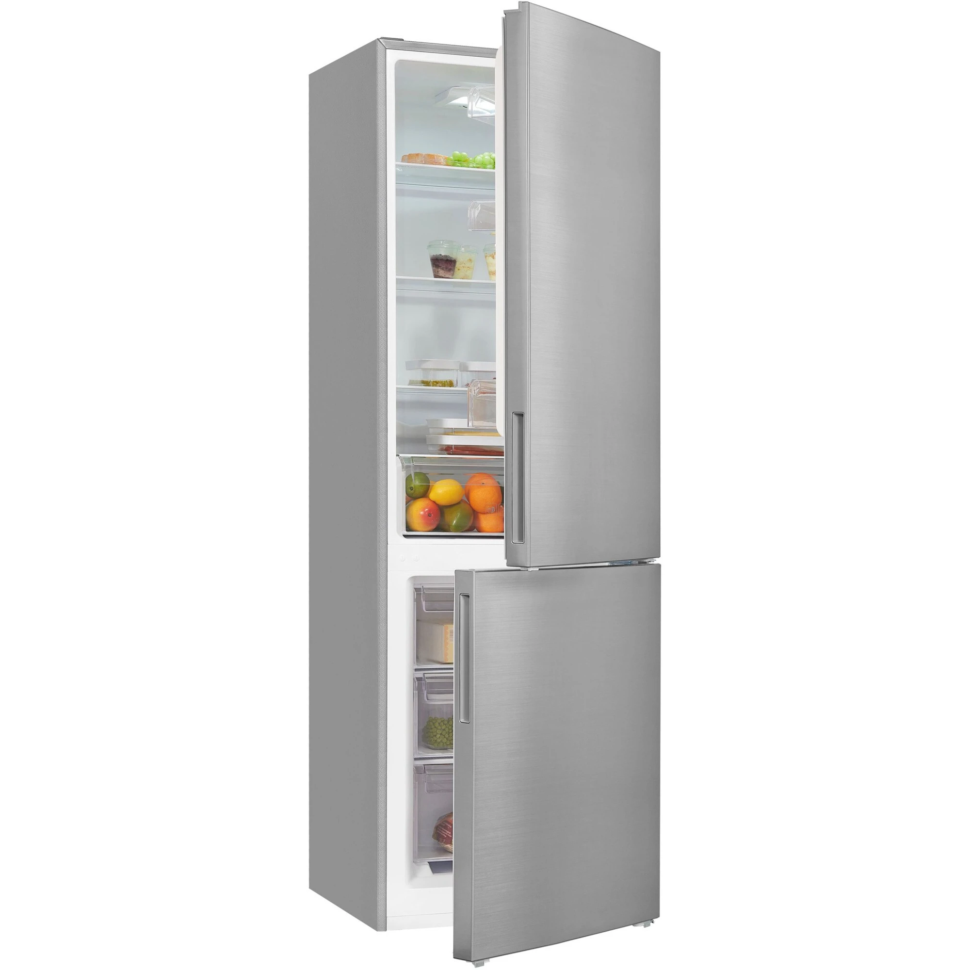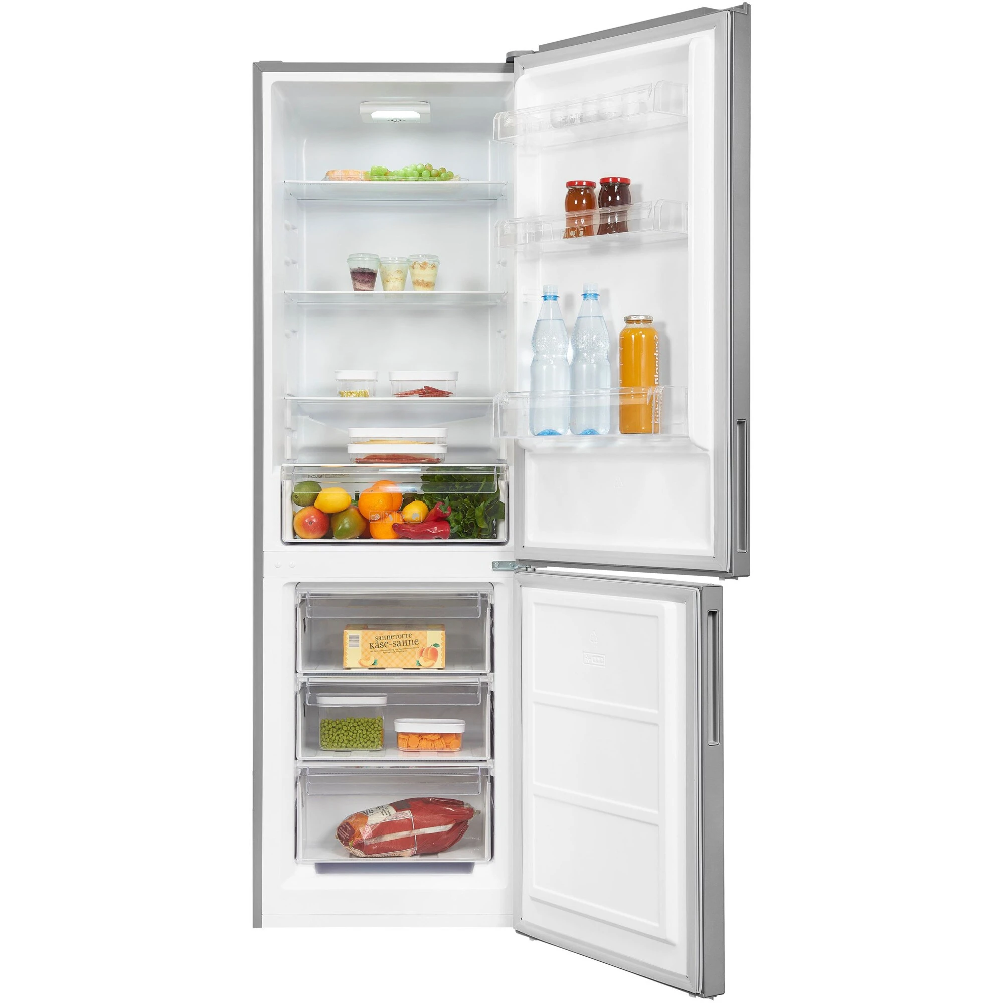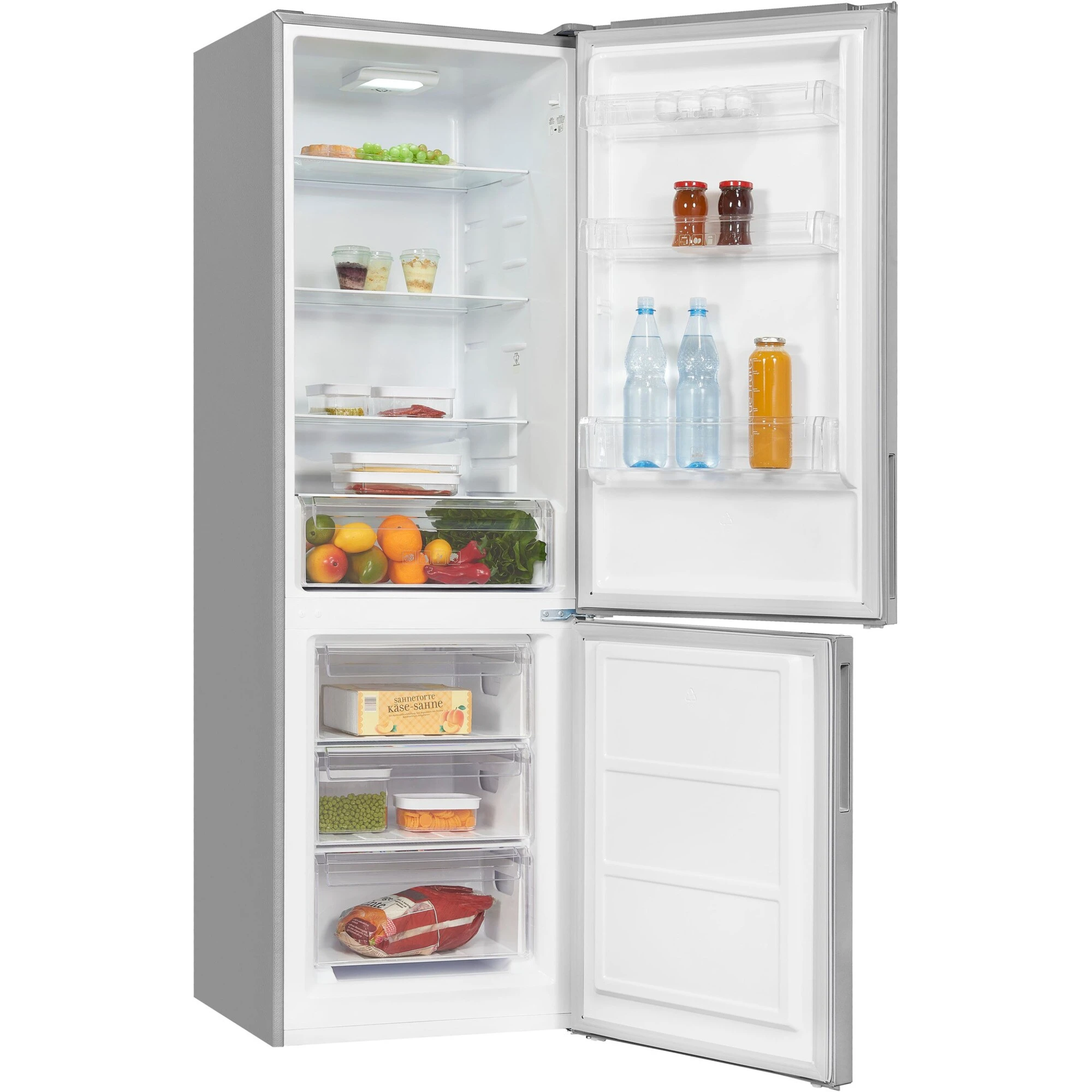Die Kühl-/Gefrierkombination Exquisit KGC320-90-040E bietet einen Gesamtnutzinhalt von 315 Litern ideal für den mittelgroßen Haushalt geeignet. Der 219 Liter umfassende Kühlraum stellt vier Glasabstellflächen, davon drei höhenverstellbar, eine Obst-/Gemüseschublade sowie drei Türfächer für die übersichtliche Lagerung frischer Lebensmittel zur Verfügung. Das LED-Licht sorgt dabei für eine effiziente Ausleuchtung des Innenraums und eine gute Sicht auf die Speisen. Der 96 Liter große Gefrierraum ist mit drei Gefrierschubladen für Tiefkühlkost ausgestattet. Die Temperaturregelung erfolgt stufenlos für mehr Flexibilität. Mit einem Stromverbrauch von 234 kWh im Jahr ist die KGC320-90-040E in die Energieeffizienzklasse E eingestuft.