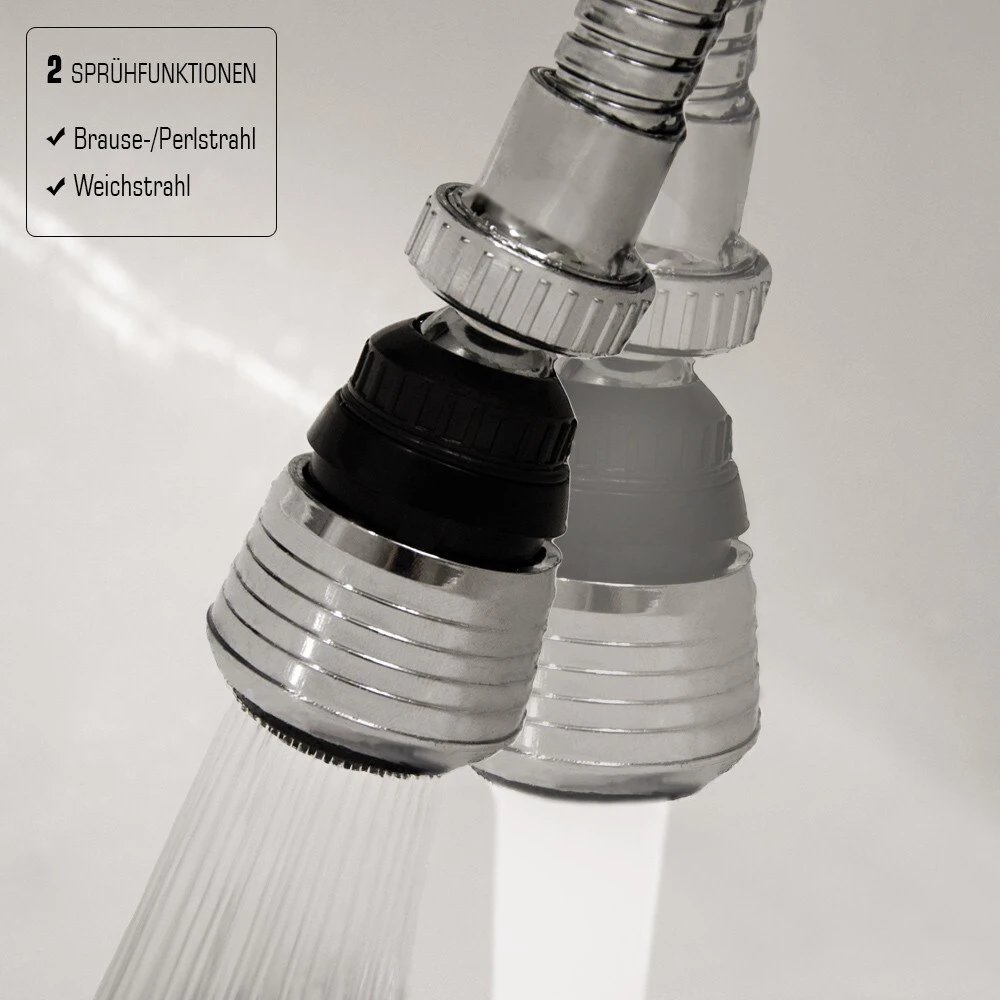 Das Sparerventil sorgt dafür, dass die Wassermenge stets reguliert wird – unabhängig vom Leitungsdruck. Mit dem Wasserhahnaufsatz können Sie so eine Menge Wasser und Energie einsparen. Zusätzlich lassen sich 2 verschiedene Sprühfunktionen einstellen: Brausestrahl und Weichstrahl.