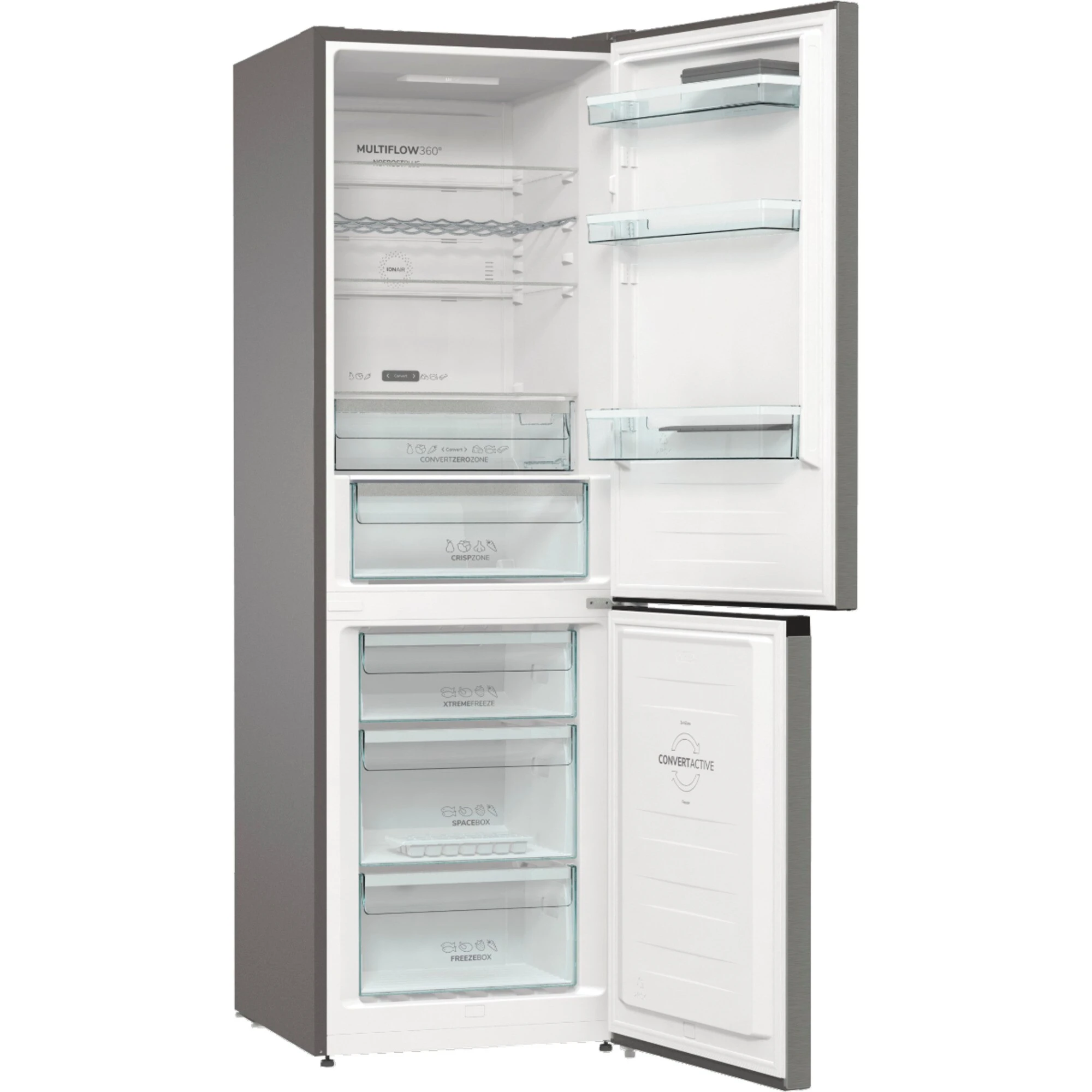 Die Kühl-/Gefrierkombination gorenje NRC6194SXL4 ist mit einem Gesamtnutzinhalt von 326 Litern ideal für den mittelgroßen Haushalt geeignet. Das 220 Liter umfassende Kühlteil stellt drei Glasabstellflächen, eine CrispZone mit Feuchteregler, eine 26 Liter große Convert ZeroZone sowie drei Türfächer für die übersichtliche Lagerung frischer Lebensmittel zur Verfügung. Das Gefrierteil umfasst 106 Liter und ist mit drei Gefrierschubladen, davon ein XtremeFreeze-Schubfach, ausgestattet. NoFrost Plus verhindert im Gefrierteil vollständig die Eisbildung und hält somit auch den Energieverbrauch niedrig. Im Kühlteil sorgen IonAir und MultiFlow 360° für ein optimales Mikroklima und frische Lebensmittel dank der intensiven Zirkulation ionisierter Luft. Ein besonderes Feature der NRC6194SXL4 ist die ConvertActive-Funktion, mit der man mit nur einem Knopfdruck das Gefrierfach zu einem Kühlfach oder zu einer großen ZeroZone verwandelt. Das intelligente AdaptTech-System hält eine konstante Temperatur im Kühlschrank aufrecht, unabhängig davon, wie oft man die Tür öffnet. Alle Einstellung sowie die Temperaturregelung erfolgt komfortabel über das außenliegende Display. Mit einem Stromverbrauch von 165 kWh im Jahr ist die NRC6194SXL4 in die Energieeffizienzklasse C eingestuft.