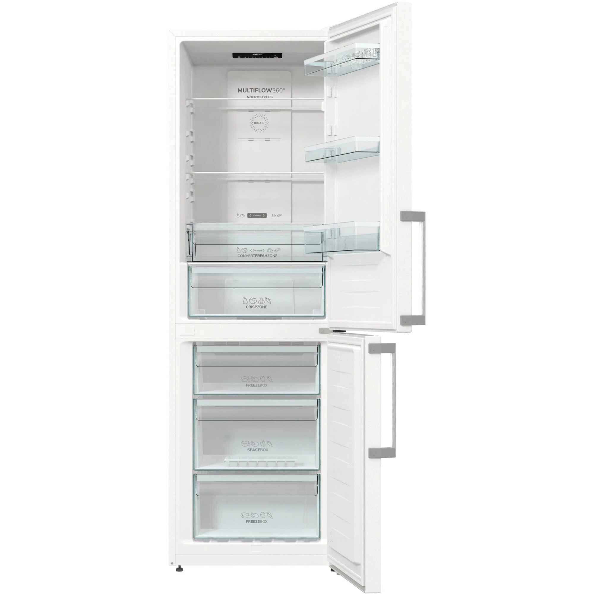 Die Kühl-/Gefrierkombination gorenje NRK6192EW5F ist mit einem Gesamtnutzinhalt von 300 Litern ideal für den mittelgroßen Haushalt geeignet. Das 204 Liter umfassende Kühlteil mit IonAir und MultiFlow 360° stellt vier Glasabstellflächen, ein Flaschengitter, eine Convert FreshZone für wahlweise Obst und Gemüse oder Firsch und Fleisch sowie drei Türfächer zur Verfügung. Das Gefrierteil der NRK6192EW5F umfasst 96 Liter und ist mit drei Gefrierschubladen, davon eine XL-SpaceBox für größeres Gefriergut, ausgestattet. Dank Total NoFrost gegen Eis- und Reifbildung ist mühsames Abtauen nicht mehr nötig. Des Weiteren verfügt die NRK6192EW5F über die Funktion FastFreeze, ein EcoMode-Programm sowie ein LED Display. Mit einem Stromverbrauch von 242 kWh im Jahr ist die NRK6192EW5F in die Energieeffizienzklasse E eingestuft.