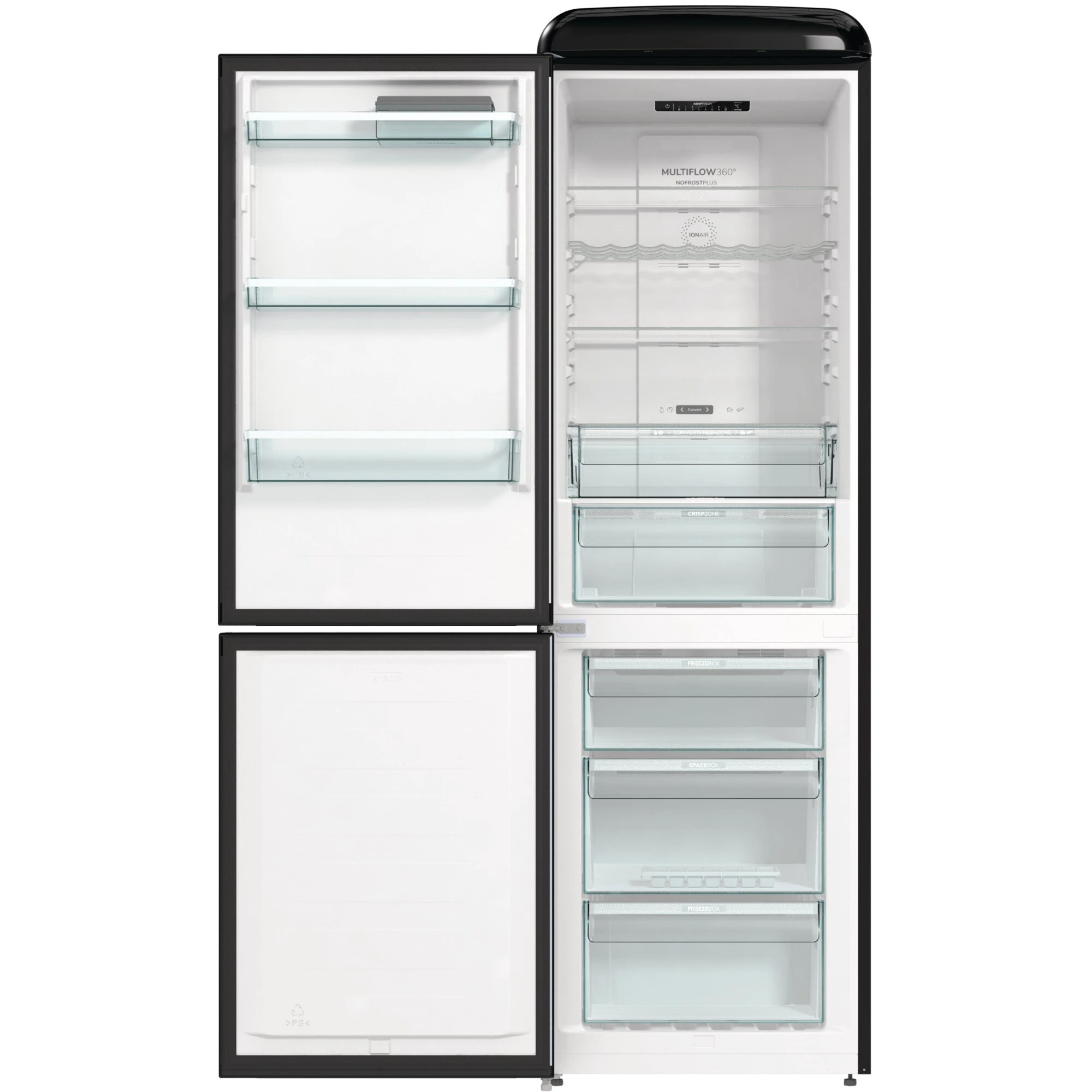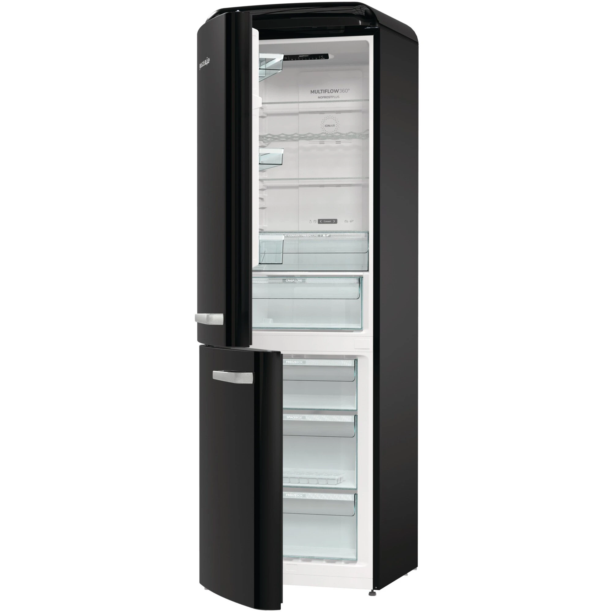 Der Kühl-/Gefrierkombination gorenje ONRK619DBK-L ist mit einem Gesamtnutzinhalt von 300 Litern ideal für den mittelgroßen Haushalt geeignet und ist mit ihrem stilvollen Design einen echter Hingucker in der Küche. Der 204 Liter umfassende Kühlbereich verfügt über drei Glasabstellflächen, davon zwei höhenverstellbar, ein Flaschengitter, eine CrispZone mit Feuchteregler für Obst und Gemüse, eine Convert FreshZone, in der wahlweise Fisch und Fleisch oder Obst und Gemüse gelagert werden kann, sowie drei Türfächer. Im Gerät generierte Negativ-Ionen sorgen kontinuierlich für frische und sauerstoffhaltige Luft und das MultiFlow 360° Luftzirkulationssystem verteilt die ionisierte Luft über 14 Luftkanäle für eine gleichmäßige Temperatur im gesamten Kühlraum. Der Gefrierbereich der ONRK619DBK-L umfasst 96 Liter und ist mit drei Gefrierschubladen, davon eine BigBox für größeres Gefriergut, ausgestattet. NoFrostPlus verhindert die Eisbildung im Gefrierraum, um den Energieverbrauch niedrig zu halten, während es im Kühlraum für ein ideales Mikroklima für frische Lebensmittel sorgt. Darüber hinaus bietet die ONRK619DBK-L eine FastFreeze-Funktion für das schnelle Einfrieren frisch aufgefüllter Vorräte. Mit einem Stromverbrauch von 192 kWh im Jahr ist die ONRK619DBK-L in die Energieeffizienzklasse D eingestuft.