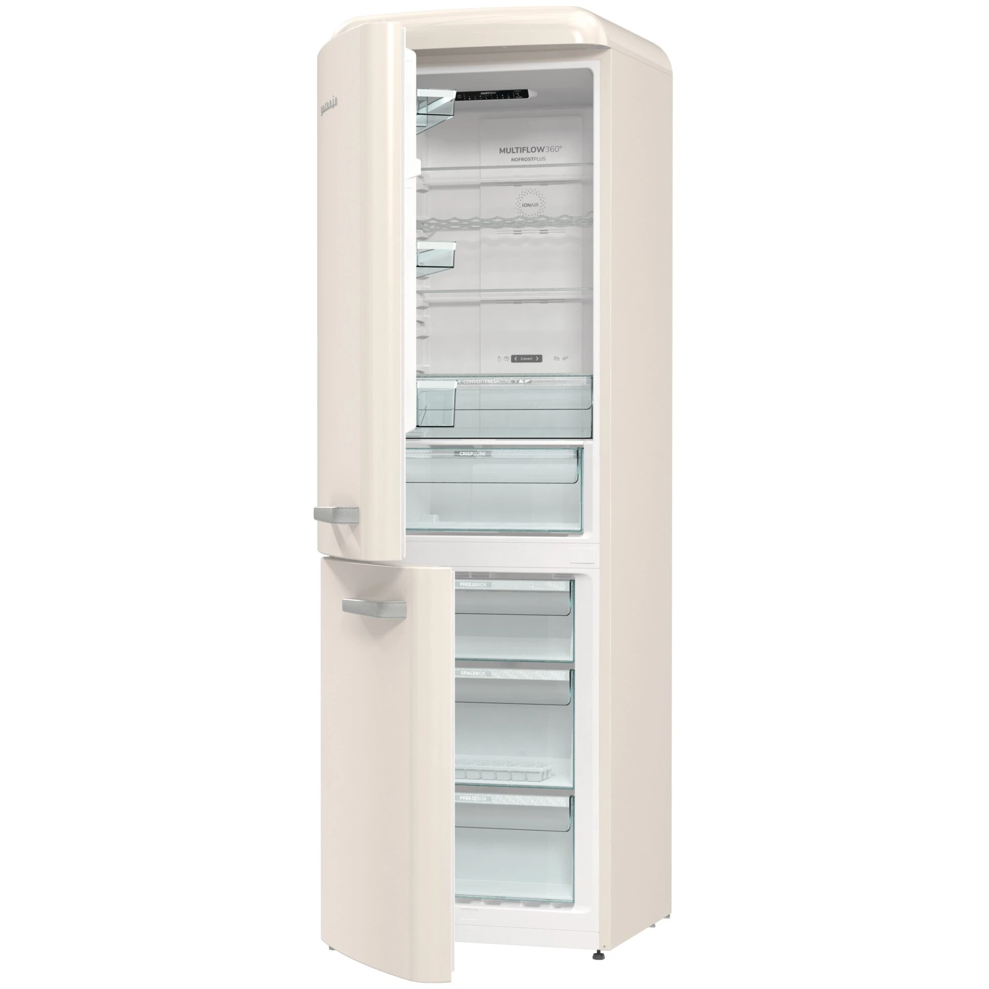 Der Kühl-/Gefrierkombination gorenje ONRK619DC-L ist mit einem Gesamtnutzinhalt von 300 Litern ideal für den mittelgroßen Haushalt geeignet und ist mit ihrem stilvollen Design einen echter Hingucker in der Küche. Der 204 Liter umfassende Kühlbereich verfügt über drei Glasabstellflächen, davon zwei höhenverstellbar, ein Flaschengitter, eine CrispZone mit Feuchteregler für Obst und Gemüse, eine Convert FreshZone, in der wahlweise Fisch und Fleisch oder Obst und Gemüse gelagert werden kann, sowie drei Türfächer. Im Gerät generierte Negativ-Ionen sorgen kontinuierlich für frische und sauerstoffhaltige Luft und das MultiFlow 360° Luftzirkulationssystem verteilt die ionisierte Luft über 14 Luftkanäle für eine gleichmäßige Temperatur im gesamten Kühlraum. Der Gefrierbereich der ONRK619DC-L umfasst 96 Liter und ist mit drei Gefrierschubladen, davon eine BigBox für größeres Gefriergut, ausgestattet. NoFrostPlus verhindert die Eisbildung im Gefrierraum, um den Energieverbrauch niedrig zu halten, während es im Kühlraum für ein ideales Mikroklima für frische Lebensmittel sorgt. Darüber hinaus bietet die ONRK619DC-L eine FastFreeze-Funktion für das schnelle Einfrieren frisch aufgefüllter Vorräte. Mit einem Stromverbrauch von 192 kWh im Jahr ist die ONRK619DC-L in die Energieeffizienzklasse D eingestuft.