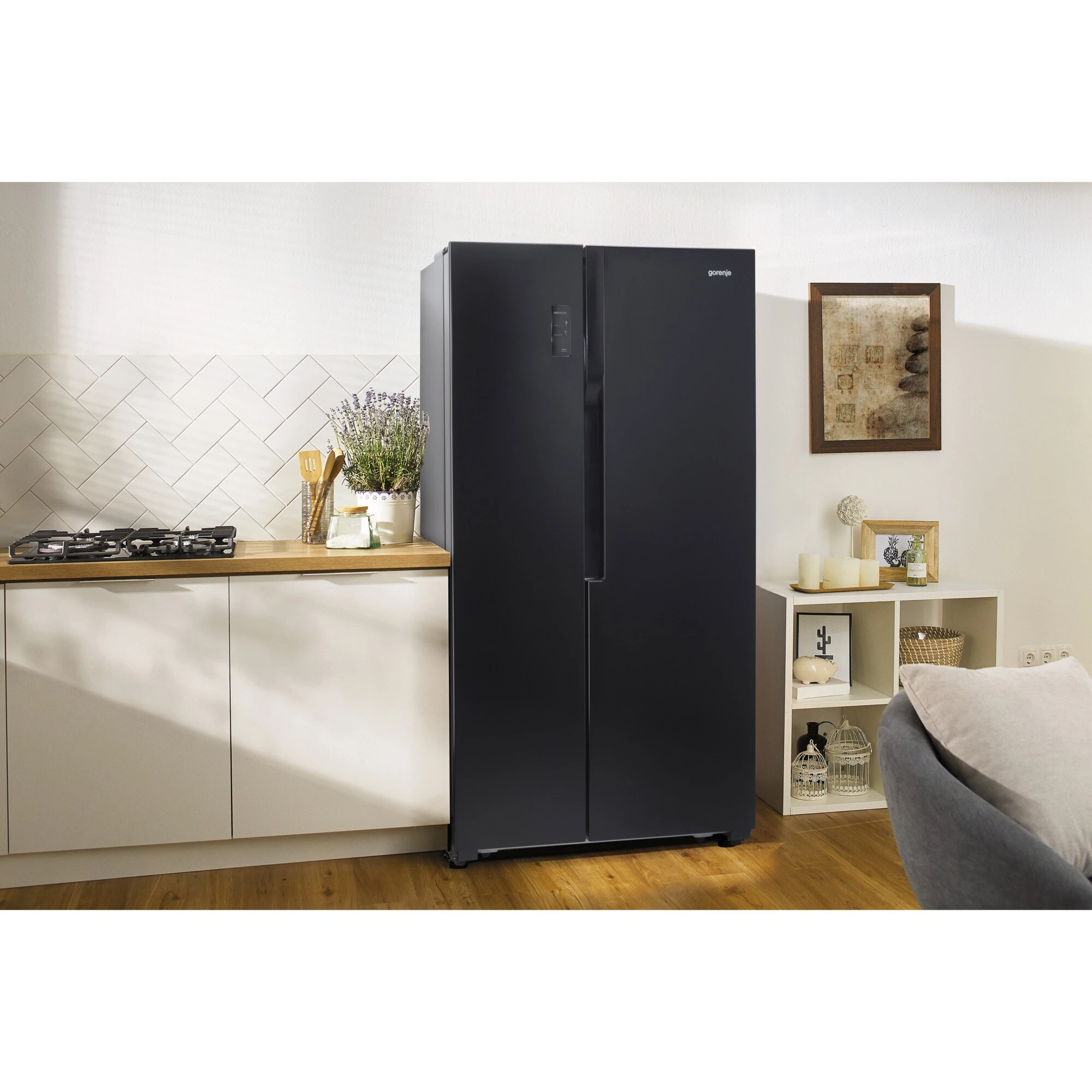 Der Side-by-Side gorenje NRS918EMB ist mit einem Gesamtnutzinhalt von 519 Litern ideal für den großen Haushalt geeignet. Der 334 Liter umfassende Kühlbereich ist mit fünf Glasabstellflächen, zwei Obst-/Gemüseschubladen sowie drei Türfächern ausgestattet. Das MultiFlow-360°-Lüftungssystem verteilt die Luft gleichmäßig im Kühlraum, um eine optimale Luftzirkulation und beste Lagerbedingungen für die Lebensmittel zu bieten. Der Gefrierbereich stellt auf einem Nutzinhalt von 185 Litern ebenfalls fünf Glasabstellflächen, zwei Gefrierschubladen sowie vier Türfächer zur Verfügung und muss dank NoFrostPlus nie wieder mühsam abgetaut werden. Die FastFreeze-Funktion friert die Lebensmittel bei -24°C ein, um die meisten Mineralien in den Lebensmitteln zu erhalten und mit dem EcoMode-Programm kann man sehr viel Energie sparen, wenn man für längere Zeit außer Haus ist. Die Temperaturregelung und Funktionssteuerung des NRS918EMB erfolgt über das außenliegende LED-Display. Mit einem Stromverbrauch von 309 kWh im Jahr ist die NRS918EMB in der Energieeffizienzklasse E eingestuft.