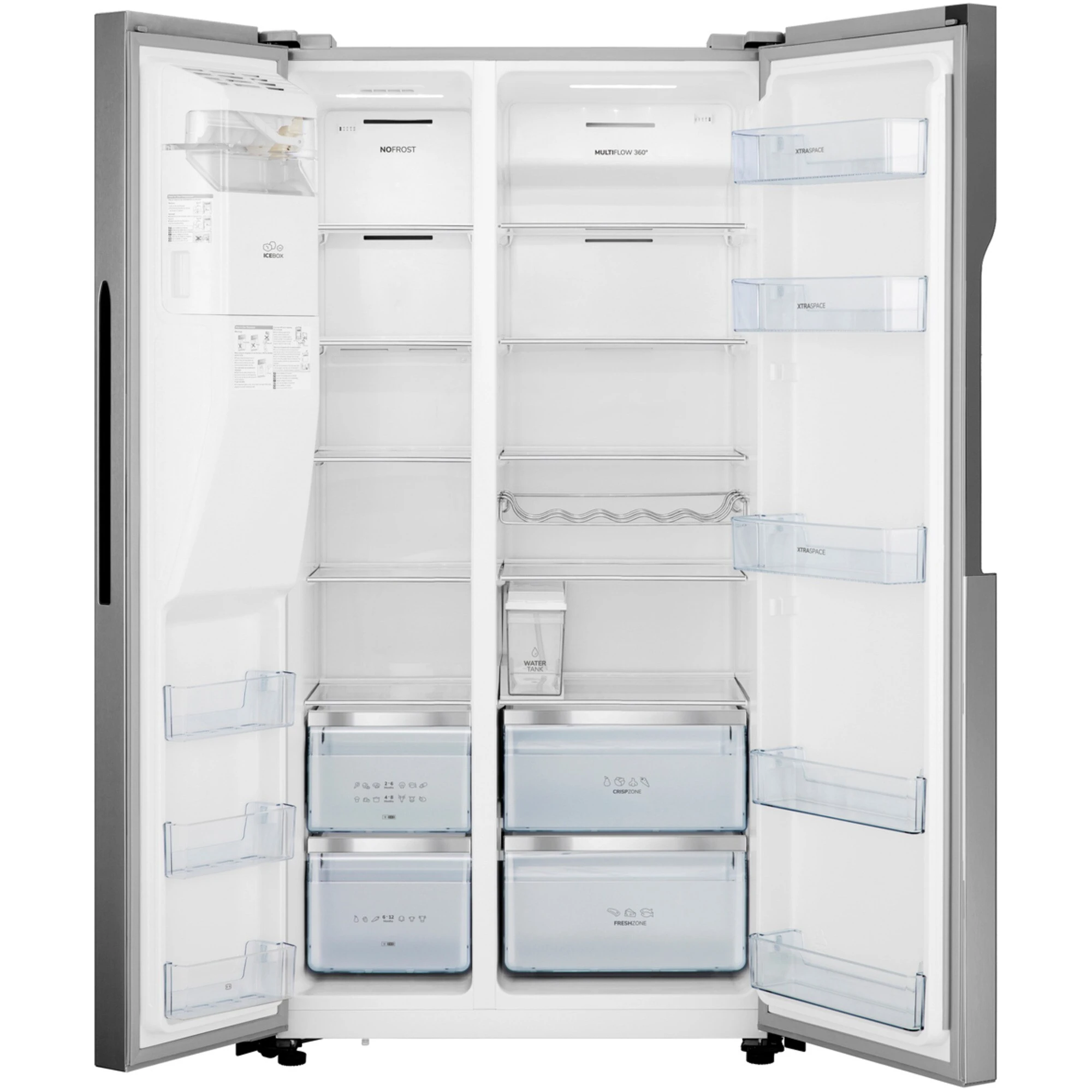 Der Side-by-Side gorenje NRS9EVX ist mit einem Gesamtnutzinhalt von 566 Litern ideal für den großen Haushalt geeignet und bietet jede Menge Komfort. Der 375 Liter umfassende Kühlbereich ist mit fünf Glasabstellflächen, einem FreshZone- und einem CrispZone-Schubfach sowie fünf Türfächern ausgestattet. Das MultiFlow-360°-Lüftungssystem verteilt die Luft gleichmäßig im Kühlraum, um eine optimale Luftzirkulation und beste Lagerbedingungen für die Lebensmittel zu bieten. Der Gefrierbereich stellt auf einem Nutzinhalt von 191 Litern ebenfalls fünf Glasabstellflächen, zwei Gefrierschubladen sowie drei Türfächer zur Verfügung und muss dank NoFrost Plus nie wieder mühsam abgetaut werden. Die FastFreeze-Funktion friert die Lebensmittel bei -24°C ein, um die meisten Mineralien in den Lebensmitteln zu erhalten, und mit dem EcoMode-Programm kann man sehr viel Energie sparen, wenn man für längere Zeit außer Haus ist. Die Temperaturregelung und Funktionssteuerung des NRS9EVX erfolgt bequem über das außenliegende LED-Display. Der berührungsgesteuerte IceMaker mit WaterDispenser verfügt über einen internen Wassertank, sodass man gekühltes Wasser, Crushed Ice und Eiswürfel genießen kann, ohne den Kühlschrank an die Wasserleitung anschließen zu müssen. Mit einem Stromverbrauch von 323 kWh im Jahr ist der NRS9EVX in der Energieeffizienzklasse E eingestuft.