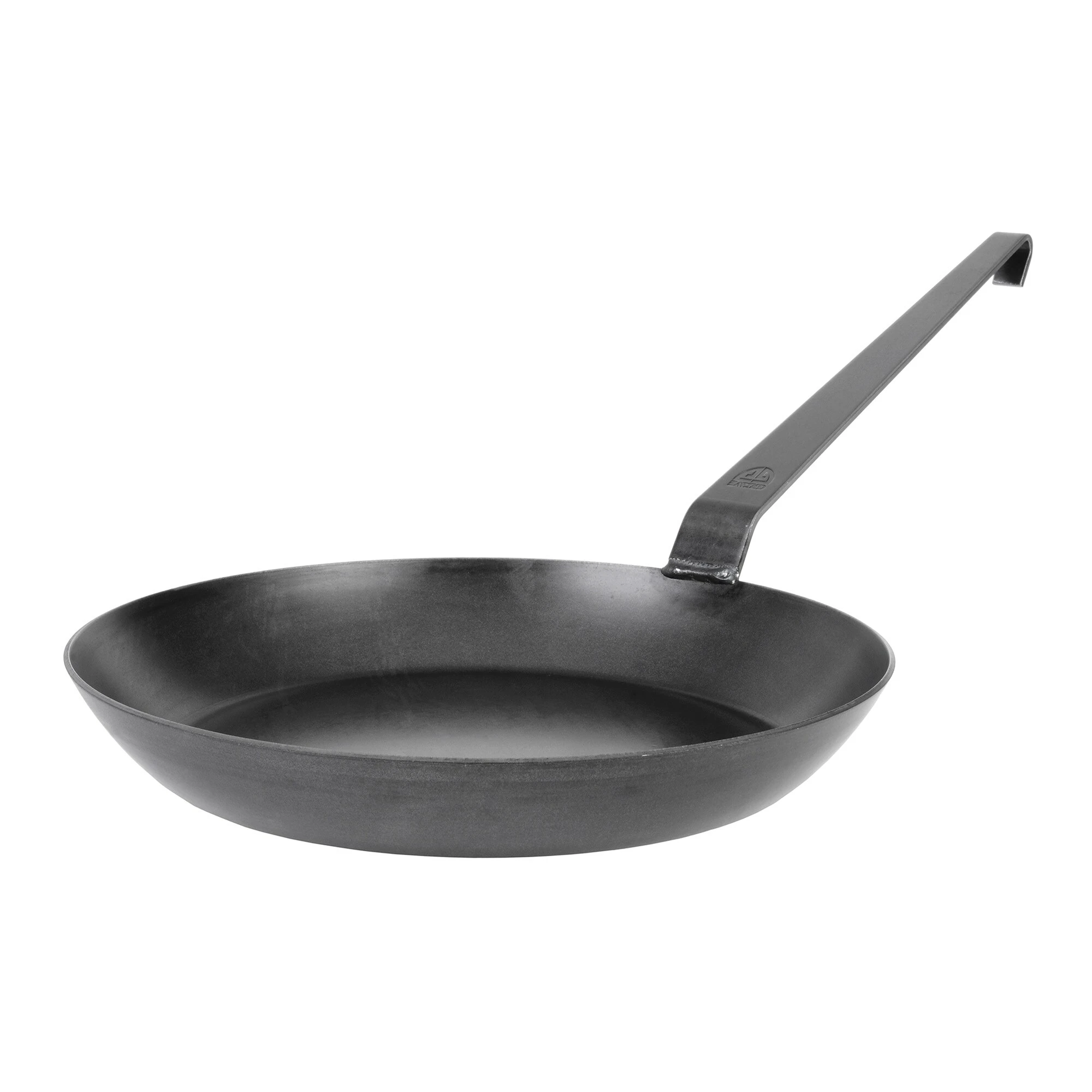 Die Pfanne verfügt über einen glatten Boden, einen hohen Rand und einen Hakenstiel. Sie ist mit einem Schutzfilm aus Öl versehen.