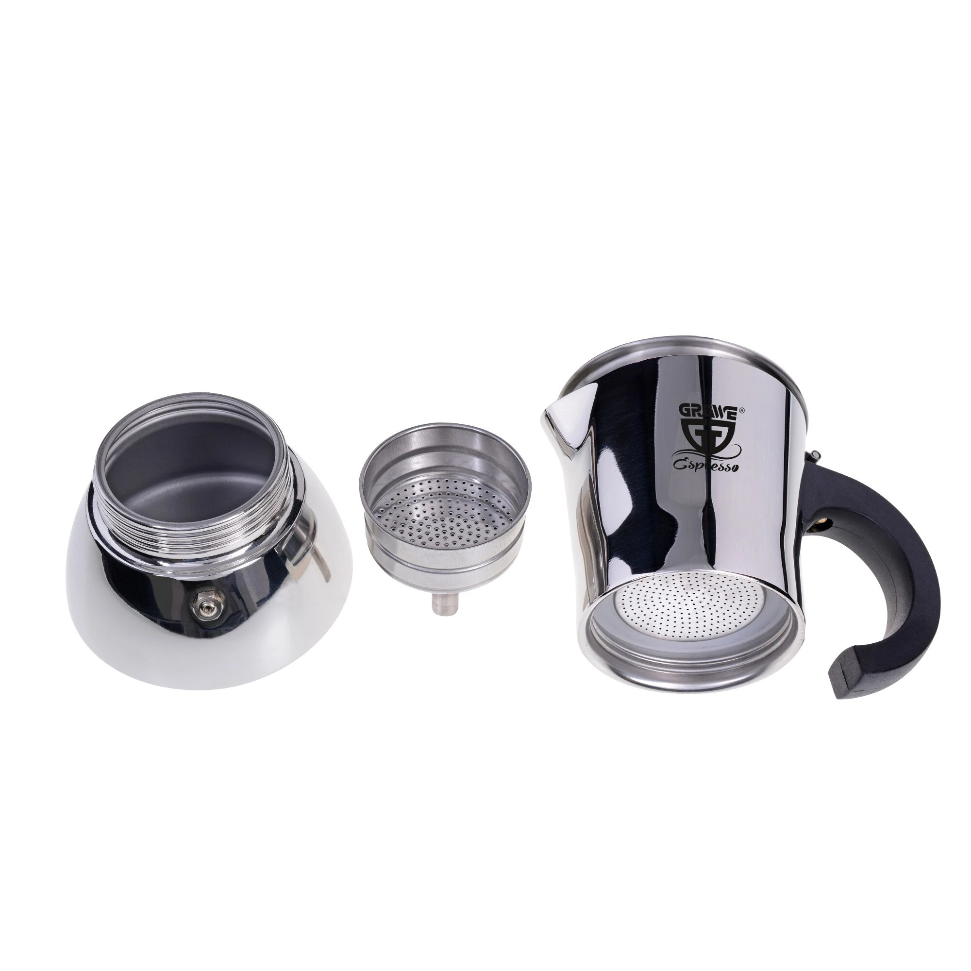 1 Espressokocher Edelstahl, 1 Trichtereinsatz, 1 Sieb mit Dichtungsring