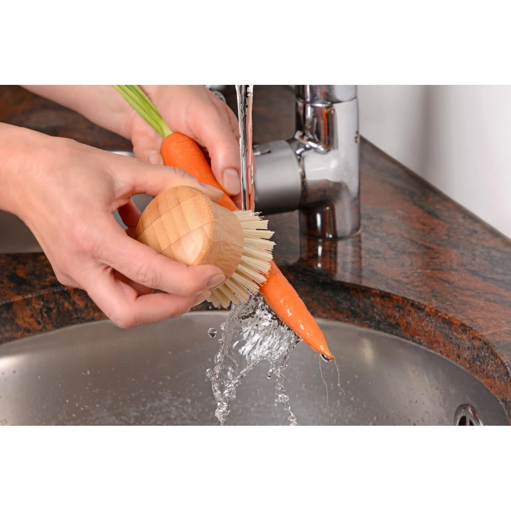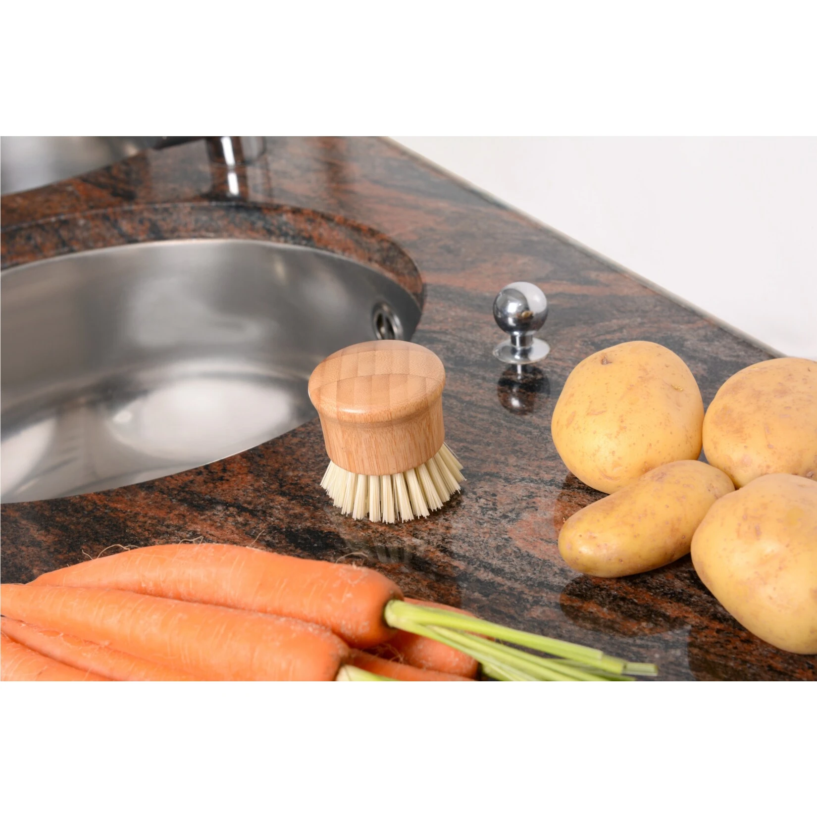 Kleine handliche Spülbürste mit einem Knauf aus Bambus und hellen Borsten aus Nylon.