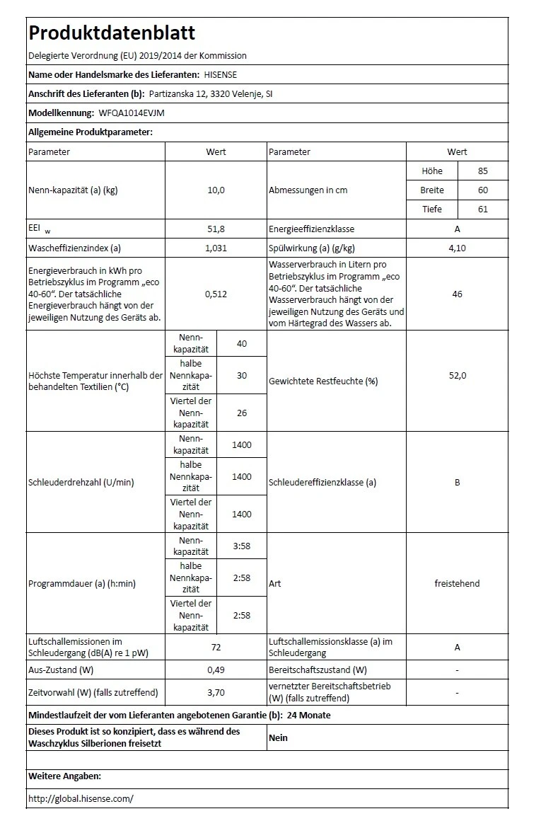 Waschmaschine Hisense / 1400U/min / 10 kg / Display / Startzeitvorwahl