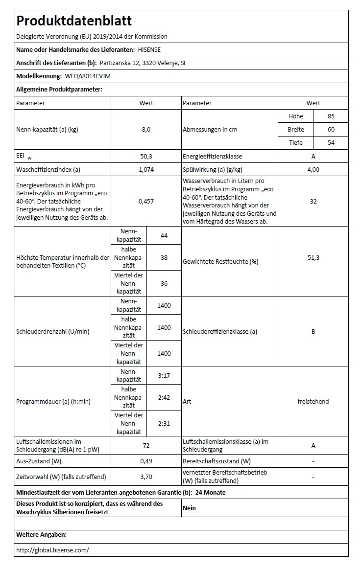 Waschmaschine Hisense / 1400U/min / 8 kg / Display / Startzeitvorwahl