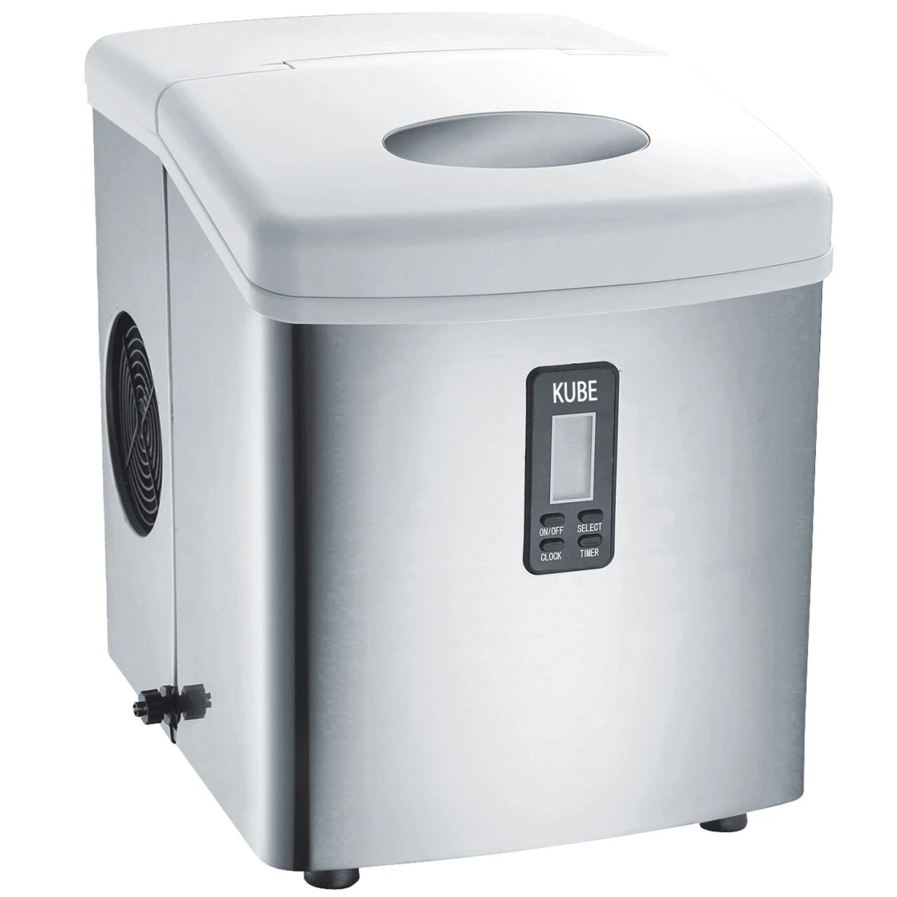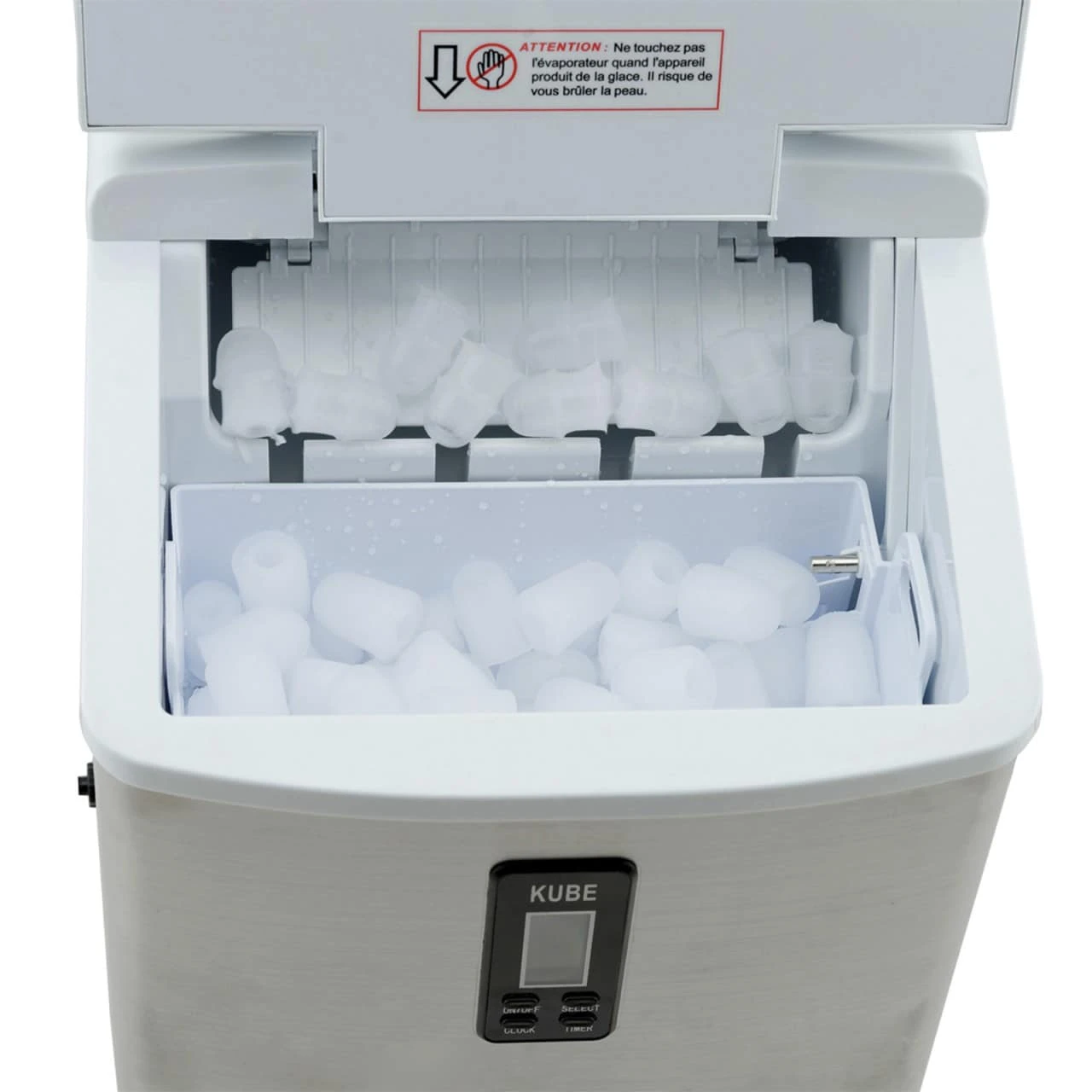 Der professionelle Eiswürfelbereiter in formschönem Edelstahlgehäuse hat ein Produktionsvolumen von ca. 15 Kilogramm am Tag und benötigt dank seines 3,3 Liter großen Wassertanks keinen Wasseranschluss. Man kann zwischen drei Eiswürfelgrößen auswählen und somit die Würfelgrößen dem Bedarf anpassen. Die Produktion der Eiswürfel erfolgt automatisch und lässt sich über das integrierte digitale Display ganz einfach steuern. Ein akustisches Signal weist darauf hin, wenn z.B. der Wassertank leer oder der herausnehmbare Eiswürfelbehälter sein Füllstand erreicht hat. Ein besonders Highlight ist der programmierbare Timer mit dem das Gerät so programmiert werden kann, dass die Eiswürfel direkt oder zu einem späteren Zeitpunkt produziert werden.