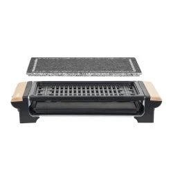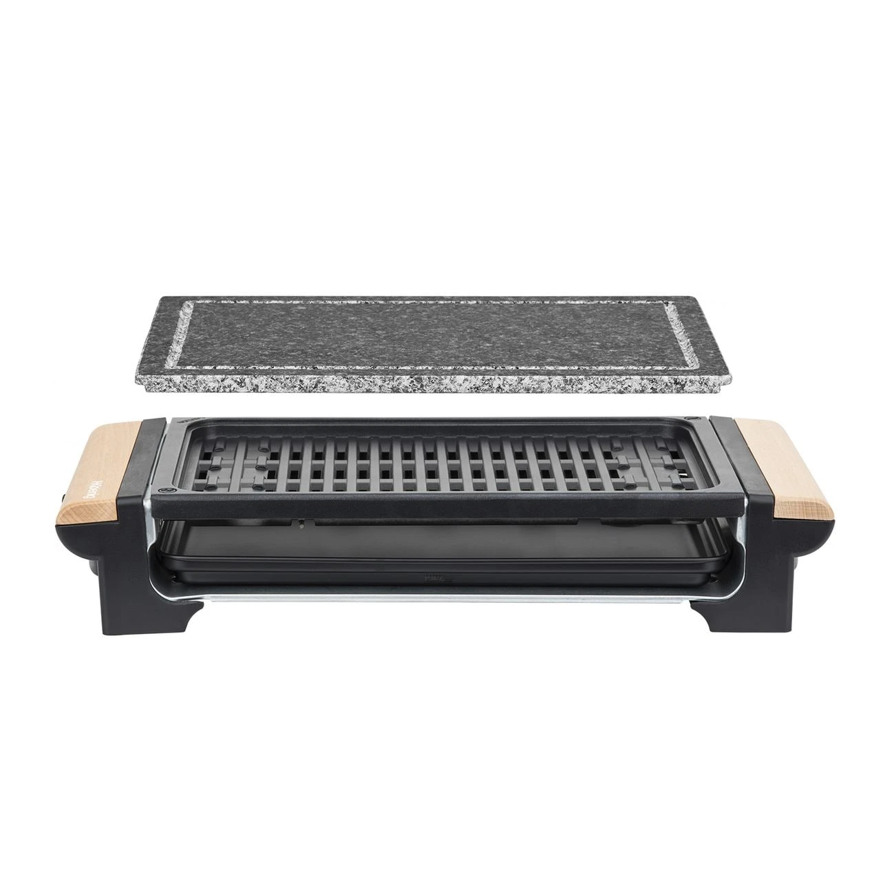 Wählen Sie zwischen zwei Grillarten für ein vielseitiges Barbecue-Erlebnis. Genießen Sie perfekt gegartes Grillgut vom Grillrost oder von der Natursteinplatte. Neben der großen Grillfläche von 37 x 23cm und der hohen Leistung von 1.300W sorgt die stufenlose Temperaturregulierung für perfekten Grillgenuss. Das formschöne Design mit Holzgriffen kann sich auf jedem Tisch sehen lassen.