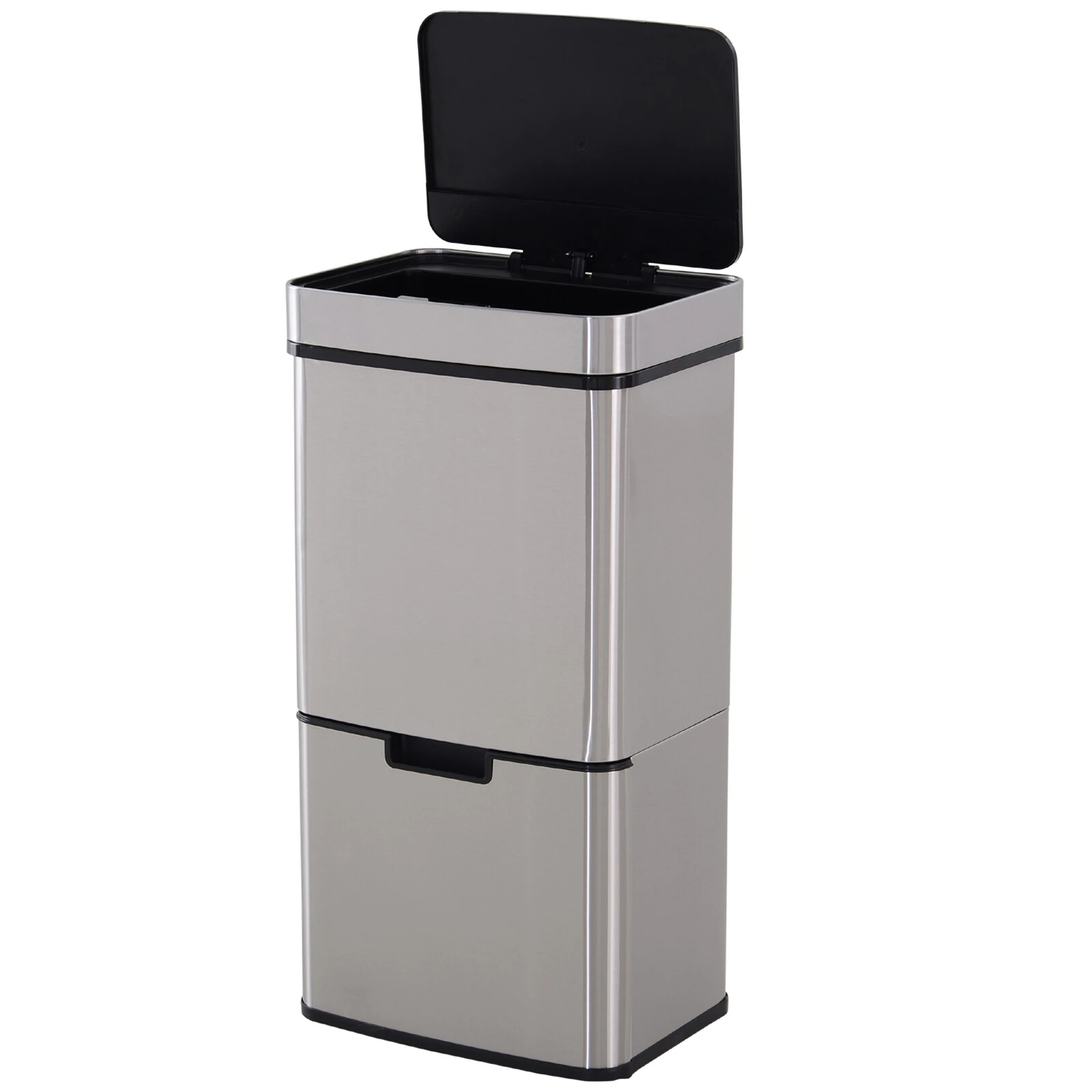 Mehr Hygiene dank automatischer Öffnung: Der Mülleimer ist die saubere Alternative für Ihre Küche. Sobald Ihre Hand in die Nähe des Sensors kommt (15 cm), öffnet sich der Abfallkorb für Ihren Restmüll ganz von alleine. Im unteren Bereich befinden sich zwei weitere Fächer, zum Beispiel für Bioabfall und Leichtverpackungen, die ins Recycling sollen. Der Mülleimer aus Edelstahl und langlebigem ABS-Kunststoff ist 81 Zentimeter hoch und hat ein Gesamtvolumen von 72 Litern.