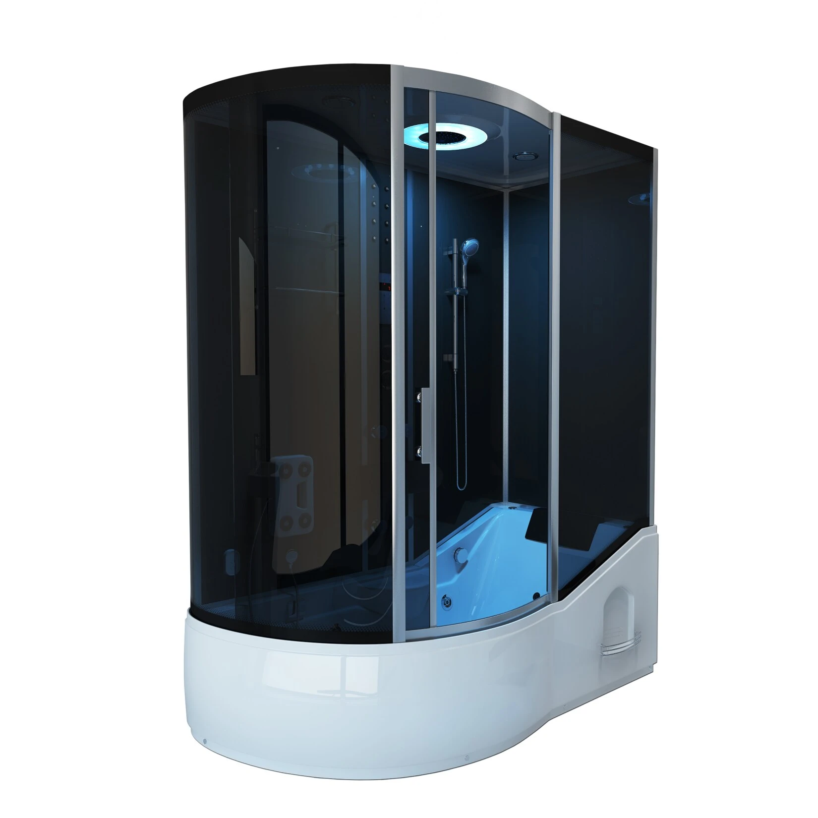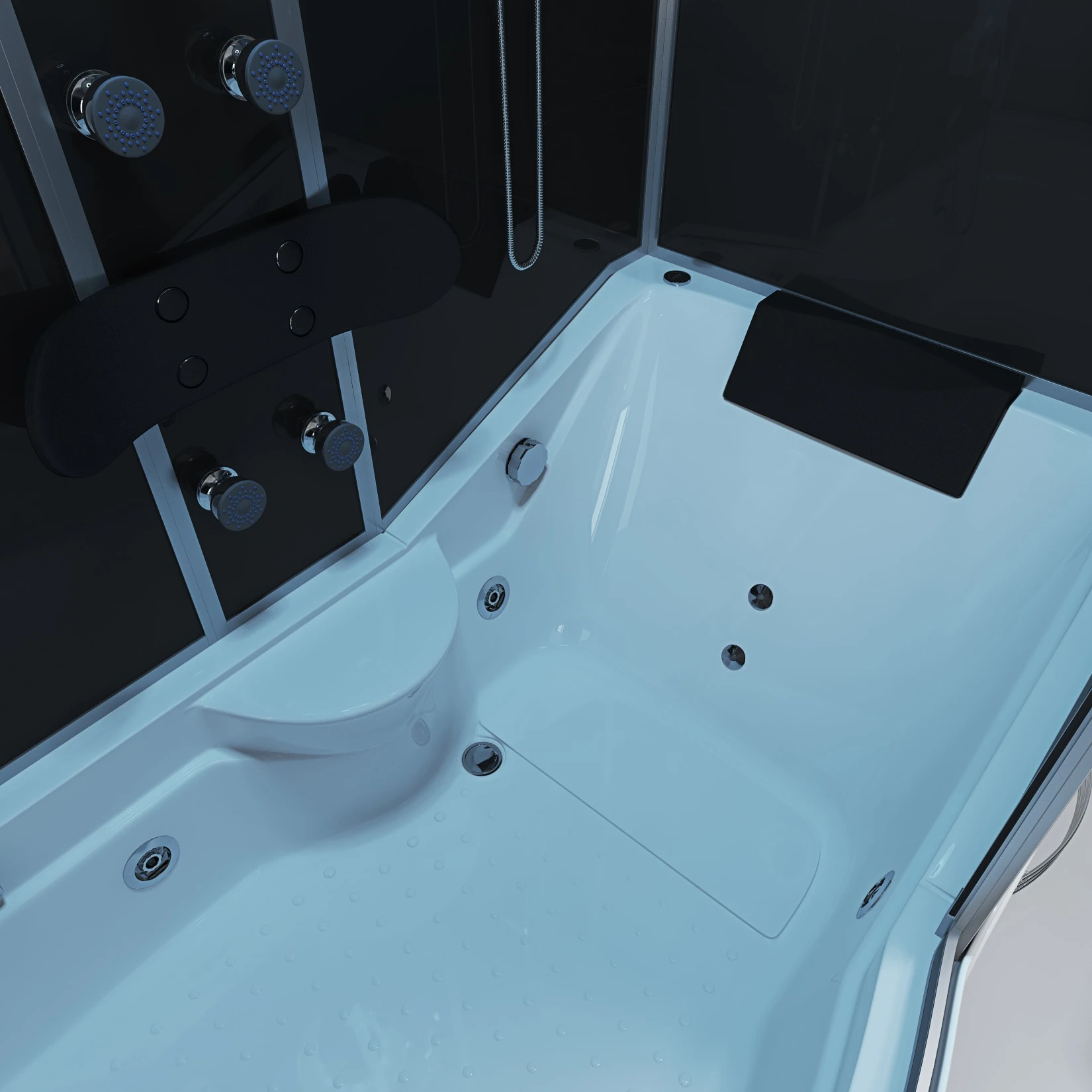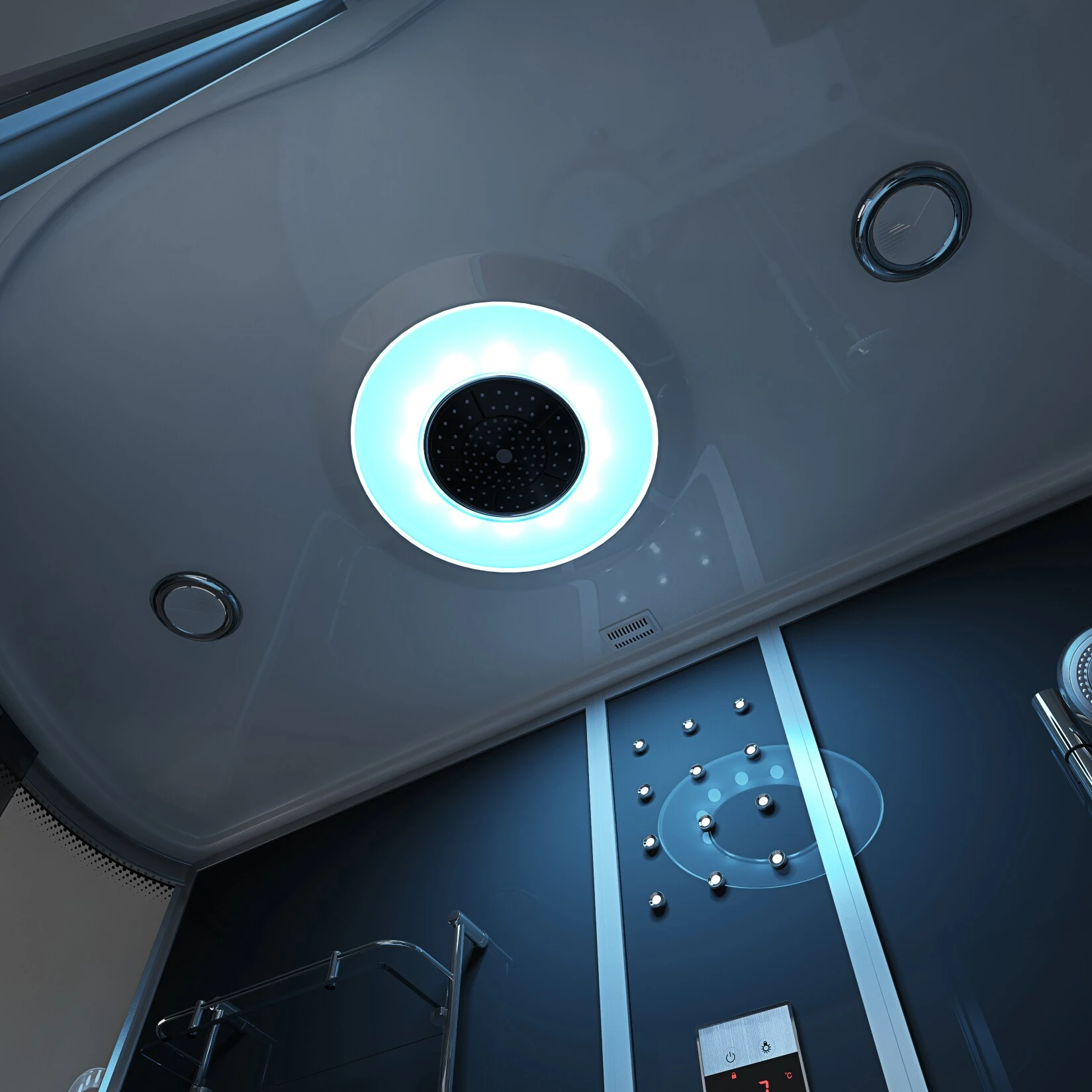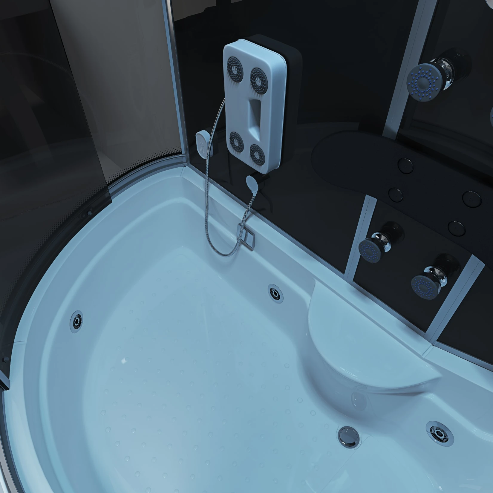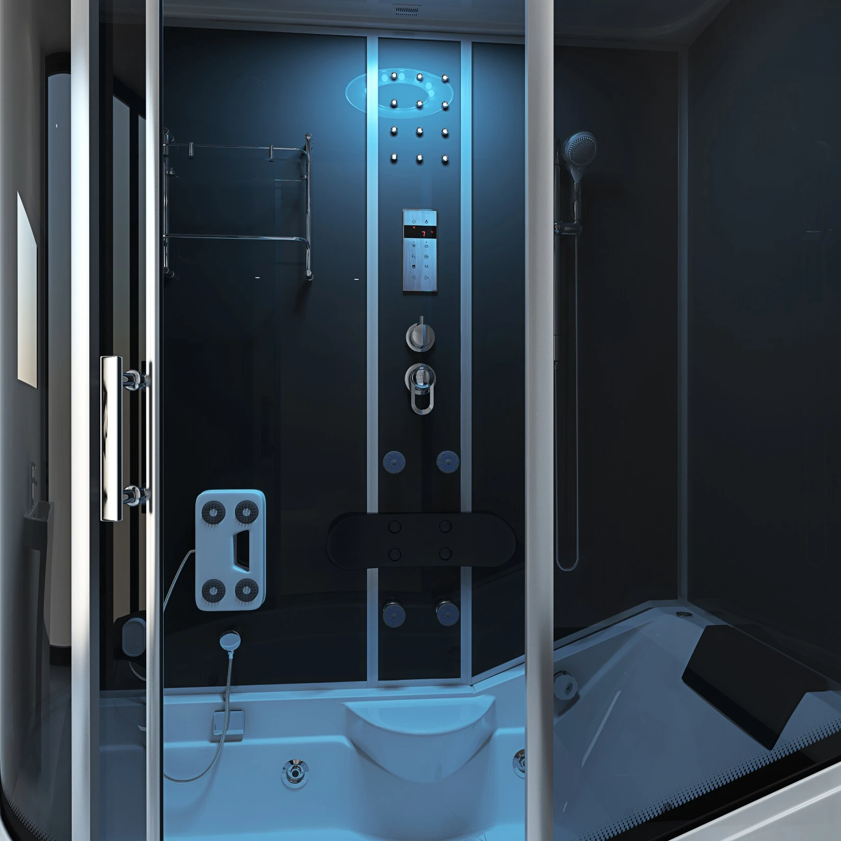 Dieses komplette Wellness-Erlebnis lässt Ihr Herz höherschlagen. Die ALL IN wurde eigens ergonomisch konzipiert, damit es überhaupt möglich ist, auf solch kleinstem Raum solch eine Ausstattung zu gewährleisten. Egal ob Duschen, Baden (Whirlpool) oder Saunieren, die ALL IN macht alles, egal in welcher Kombination, auf Knopfdruck möglich. Selbstverständlich ist auch der gewöhnliche Gebrauch über eine Handbrause, die über die befestigte Duschstange justierbar ist, möglich. Das moderne Design, gepaart mit guter Funktionalität, runden unseren Topseller ab. Entspannen Sie sich bei einem beruhigenden Whirlpoolgang unter dem blauen Deckenhimmel, lassen Sie die Seele bei einem warmen Tropenregen baumeln, oder verlieren Sie Ihren Stress bei einem Dampfbad, optional auch mit Duftaroma. Das integrierte Ozon-Desinfektionssystem sorgt für rückstandslose, umweltfreundliche Reinigung. Der in der Wanne eingefasste Sitz und die Antirutschstruktur im Wannenboden gewährleisten den sicheren Gebrauch. Die integrierte Fußmassage für eine entspannte Reflexzonentherapie und die 8 justierbaren Rückenmassagedüsen, die an der Mittelkonsole Ihren Rücken massieren, machen das Entspannungserlebnis perfekt. Nicht nur die Eigenschaften sind herausragend, auch die Qualität ist für den angegebenen Preis mehr als fair. Hier zu erwähnen sind vor allem die 5mm starke, schwarzgetönte ESG-Vollverglasung der “ALL IN – Serie”, sowie auch die Aluminium-Rahmenkonstruktion und das computergesteuerte Touch-Bedienelement. Die auf fast jeden Untergrund anzupassenden höhenverstellbaren Füße der Duschwanne machen dieses Produkt nahezu an jedem Ort montierbar.