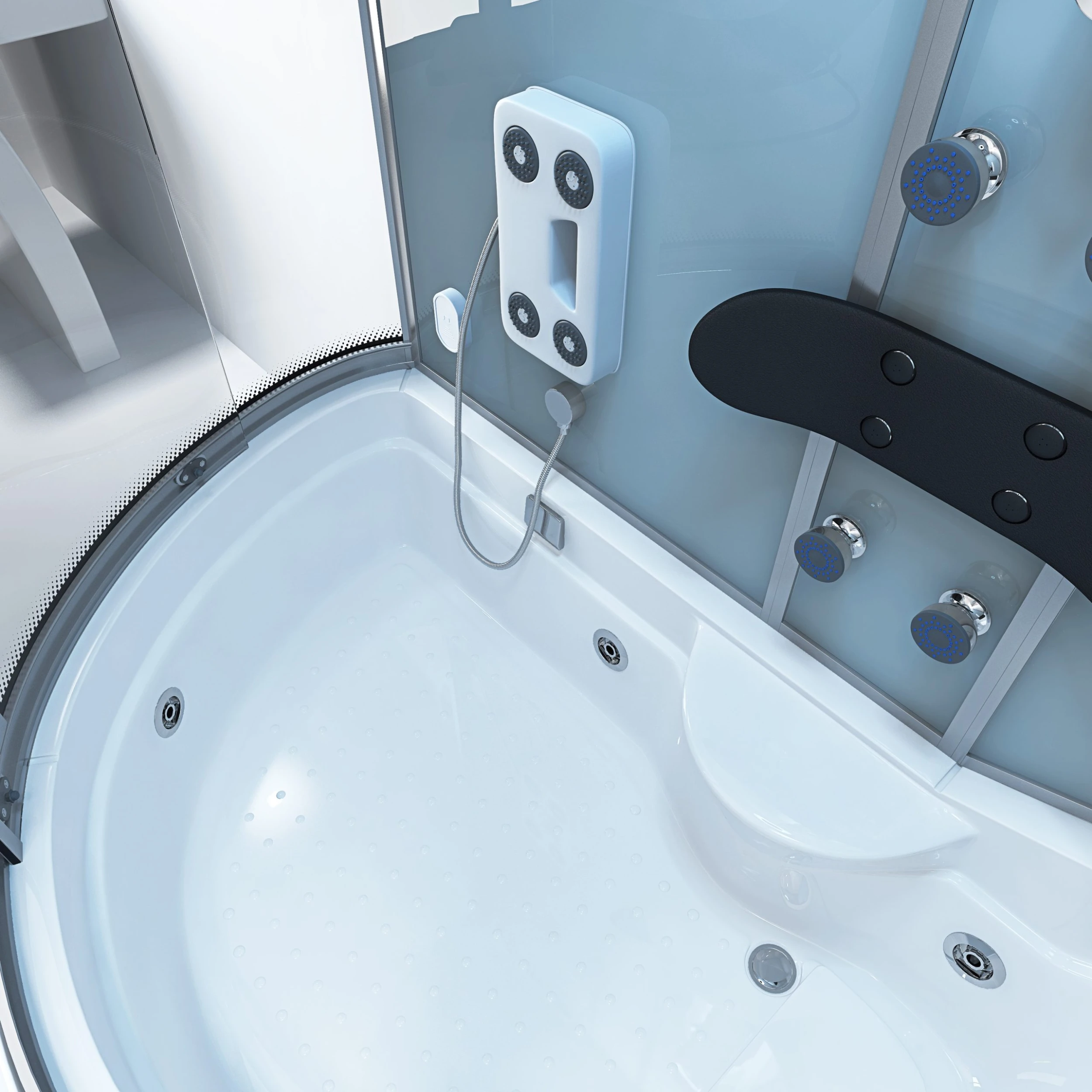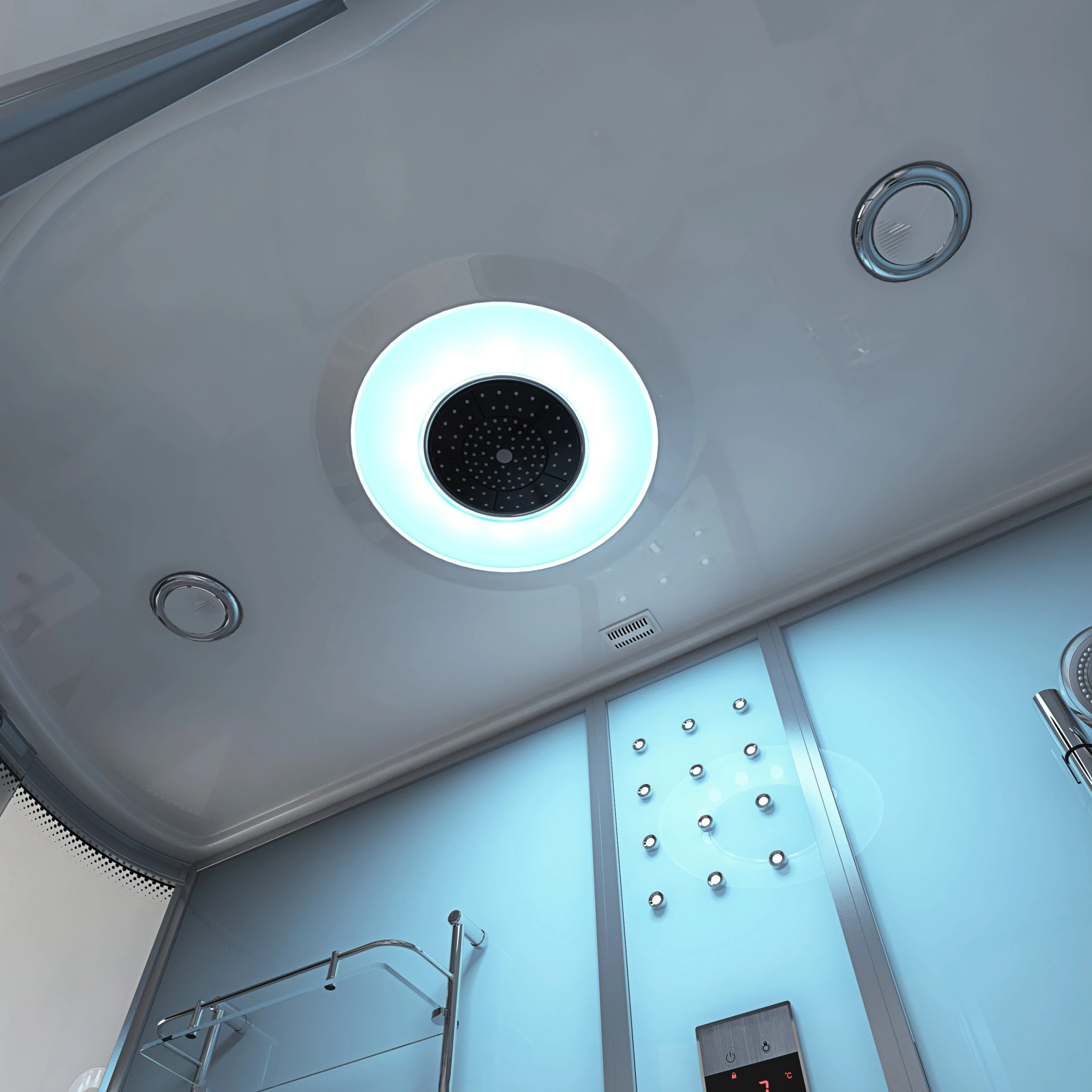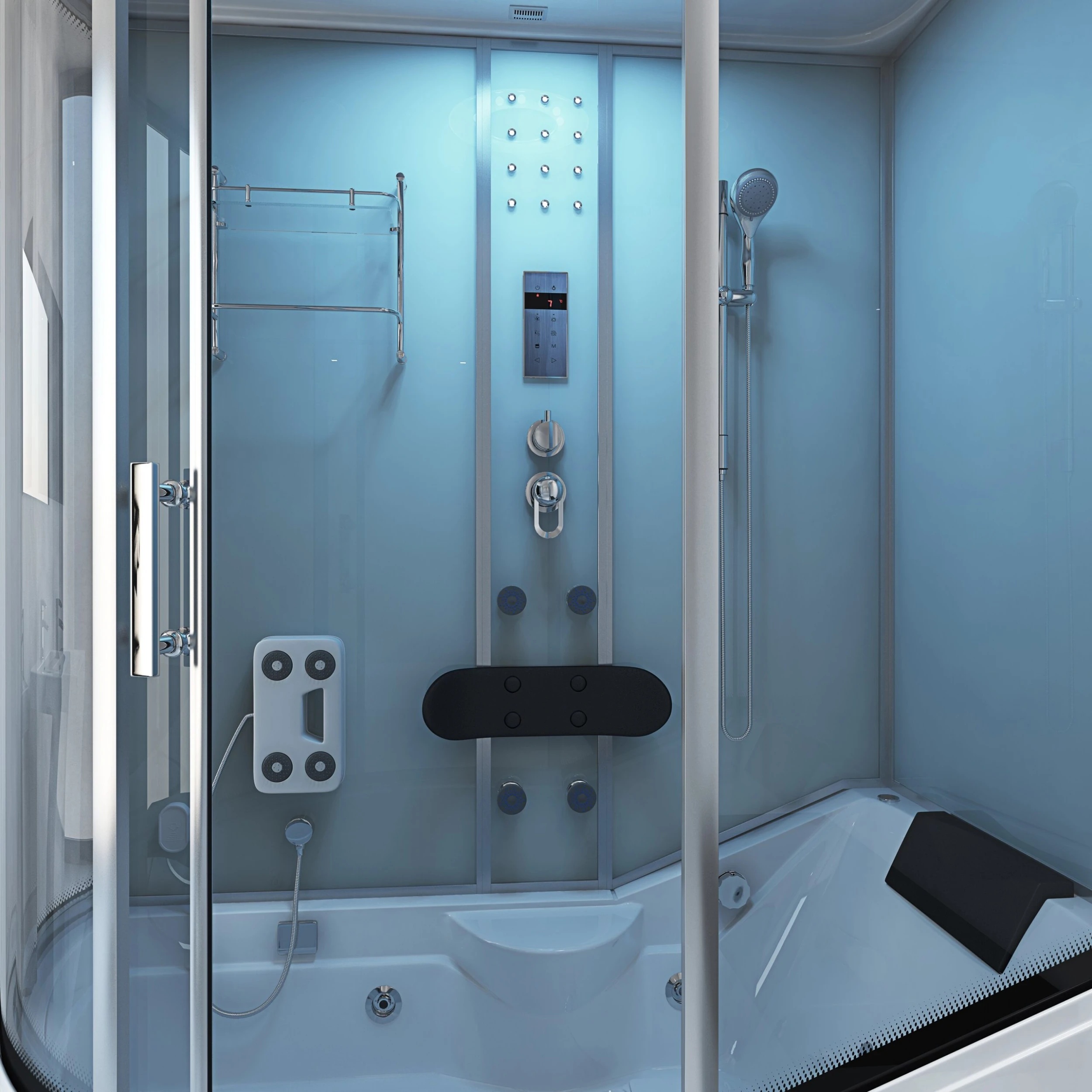 Dieses komplette Wellness-Erlebnis lässt Ihr Herz höherschlagen. Die ALL IN wurde eigens ergonomisch konzipiert, damit es überhaupt möglich ist, auf solch kleinstem Raum solch eine Ausstattung zu gewährleisten. Egal ob Duschen, Baden (Whirlpool) oder Saunieren, die ALL IN macht alles, egal in welcher Kombination, auf Knopfdruck möglich. Selbstverständlich ist auch der gewöhnliche Gebrauch über eine Handbrause, die über die befestigte Duschstange justierbar ist, möglich. Das moderne Design, gepaart mit guter Funktionalität, runden unseren Topseller ab. Entspannen Sie sich bei einem beruhigenden Whirlpoolgang unter dem blauen Deckenhimmel, lassen Sie die Seele bei einem warmen Tropenregen baumeln, oder verlieren Sie Ihren Stress bei einem Dampfbad, optional auch mit Duftaroma. Das integrierte Ozon-Desinfektionssystem sorgt für rückstandslose, umweltfreundliche Reinigung. Der in der Wanne eingefasste Sitz und die Antirutschstruktur im Wannenboden gewährleisten den sicheren Gebrauch. Die integrierte Fußmassage für eine entspannte Reflexzonentherapie und die 8 justierbaren Rückenmassagedüsen, die an der Mittelkonsole Ihren Rücken massieren, machen das Entspannungserlebnis perfekt. Nicht nur die Eigenschaften sind herausragend, auch die Qualität ist für den angegebenen Preis mehr als fair. Hier zu erwähnen sind vor allem die 5 mm starke, weißgetönte ESG-Vollverglasung der “ALL IN – Serie”, sowie auch die Aluminium-Rahmenkonstruktion und das computergesteuerte Touch-Bedienelement. Die auf fast jeden Untergrund anzupassenden höhenverstellbaren Füße der Duschwanne machen dieses Produkt nahezu an jedem Ort montierbar.