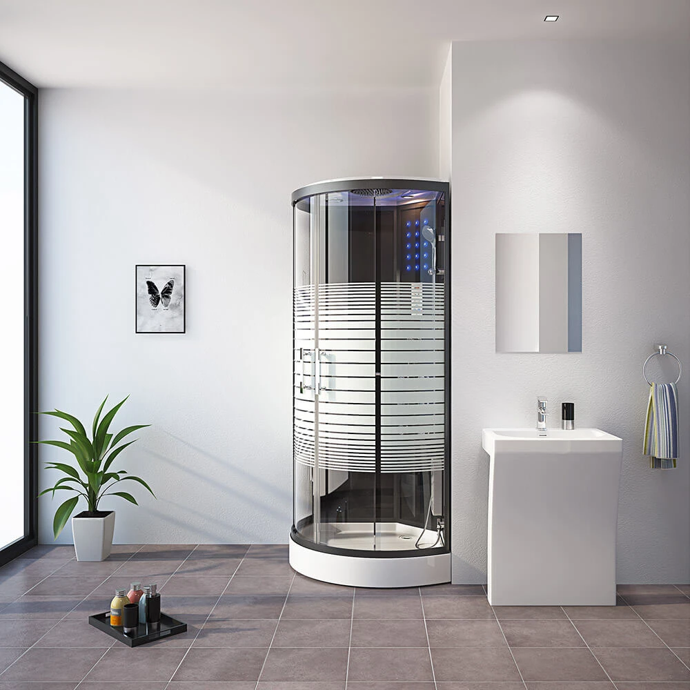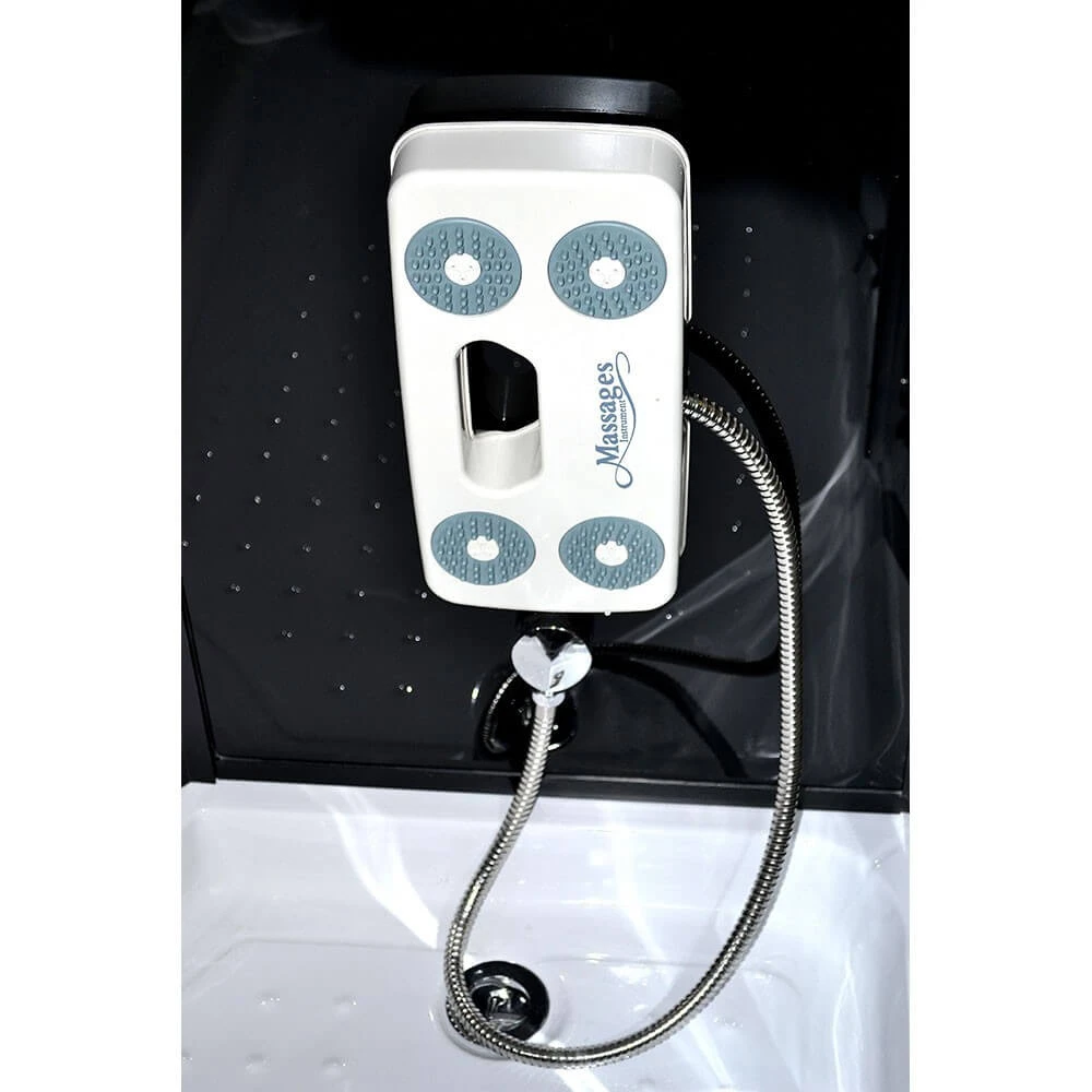 Diese Design-Dampfduschkabine ist ein wahres Multifunktions- und Raumsparwunder. Verlieren Sie z.B. nach einem mühsamen Arbeitstag Ihren Stress bei einem angenehmen Dampfsaunagang (bis 60°C einstellbar), bei dem Sie garantiert ins Schwitzen kommen. Optional besteht die Möglichkeit, ein Duftaroma von himmlischer Intensität (z. B. Eukalyptus, Minze u.v.a.) zu integrieren. Die “Pearl-Serie” verfügt außerdem über die Regenbrausenoption, bei der Wasser wie ein lauwarmer Tropenregen aus den unglaublichen 126 Düsen im Deckenhimmel rieselt. Eine entspannte Rückenmassage (6 Hydrojets) mit gleichzeitigem Lauschen Ihres Lieblingsradiosenders ist bei vielen Kunden beliebt. Selbstverständlich ist auch der gewöhnliche Gebrauch über eine Handbrause, die über die befestigte Duschstange justierbar ist, möglich. Die 15 blauen LED-Lichter im Mittelpaneel machen den “Wohlfühlfaktor” vollkommen. Über das integrierte Computerdisplay können Sie die Lautstärke und Senderwahl stufenlos regeln. Der im Mittelpaneel aufklappbare Sitz (max. Belastung ca. 100kg) und die Antirutschstruktur im Wannenboden gewährleisten den sicheren Gebrauch dieser Duschkabine. Die 4 mm schwarzgetönte ESG-Vollverglasung aller Komponenten steht für den durchweg hohen Qualitätsstandard. Die hochmoderne Teilsatinierung schafft sowohl Diskretion als auch Lichtdurchlässigkeit. Die auf fast jeden Untergrund anzupassenden höhenverstellbaren Füße der Duschwanne sind ein weiteres herausragendes Feature, das diese Dusche von anderen hervorhebt.