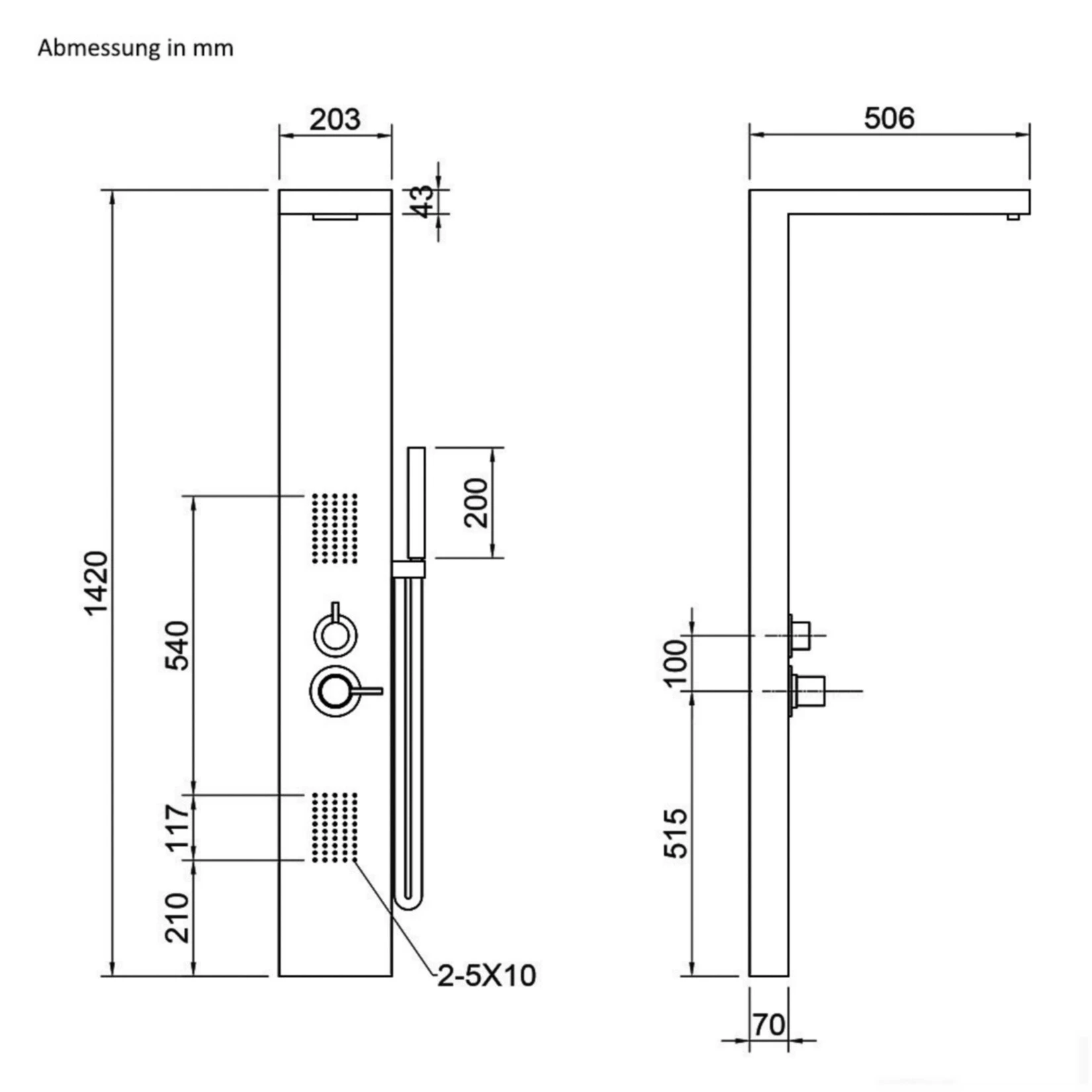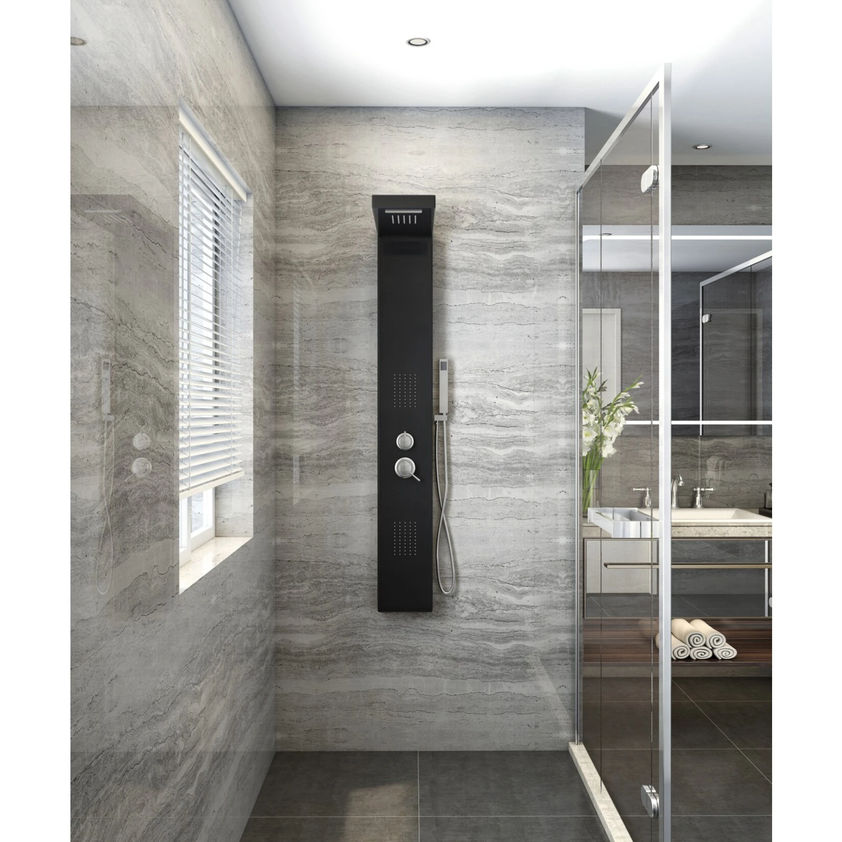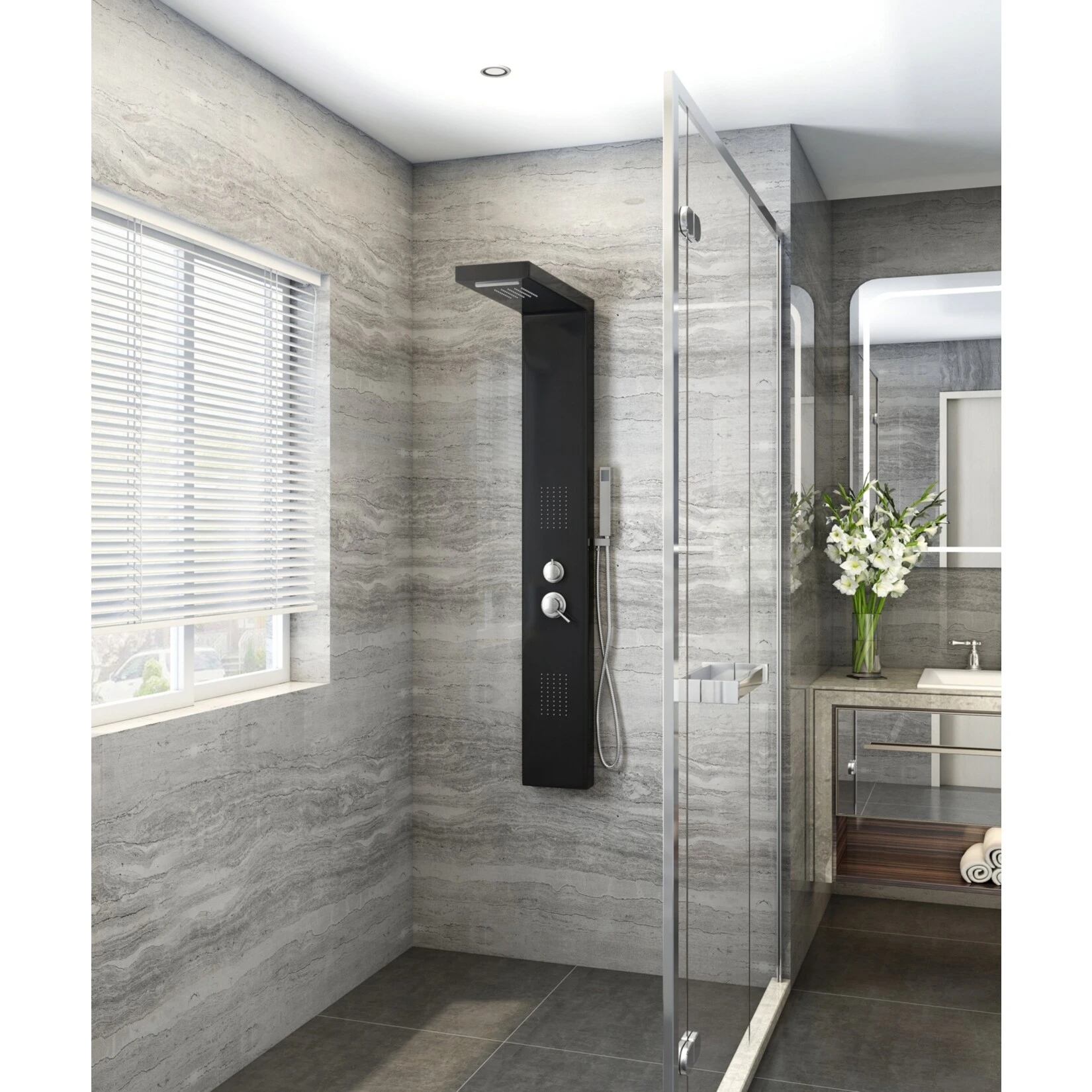 Dieses moderne Duschpaneel ist der Hingucker in jedem Badezimmer und eine einfache Komplettlösung für jedermann. Das Duschpaneel arbeitet mit einer 4-fachen Wasserverteilung. Über die integrierte Mischarmatur kann man nach Belieben die Wasserfallfunktion, die große Tropenbrause, die Massagedüse oder die Handbrause ansteuern. Die Düsen sind mit speziellen Anti-Kalknoppen ausgestattet, wodurch die Reinigung dieses Produktes praktisch wie von allein von der Hand geht. Das Duschpaneel Cascata ist aus verzinktem Stahl gefertigt. Durch den natürlichen Schwarzton, der mit den silberfarbenen Elementen bestens harmoniert, ist das Duschpaneel für jedes Badezimmer geeignet. Dank der 1/2″-Anschlüsse nach DIN-Norm ist eine einfache und schnelle Montage garantiert.